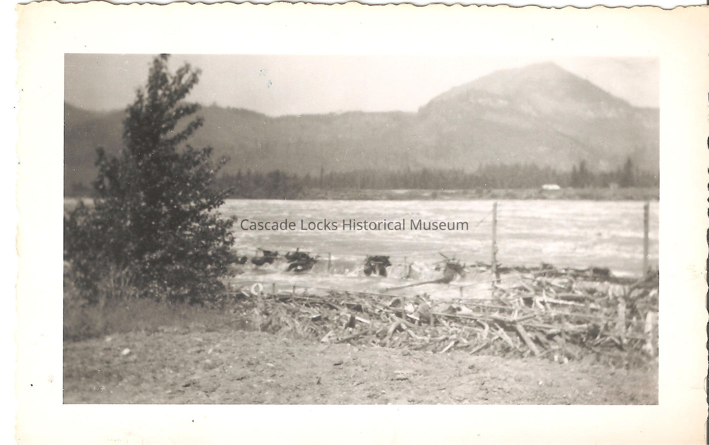 Image of the flooding of the Columbia River during the Flood of 1948. In the image the rushing waters cover the fish ladder. Wood and debris are piled up against the railings and fences of the fish ladder.