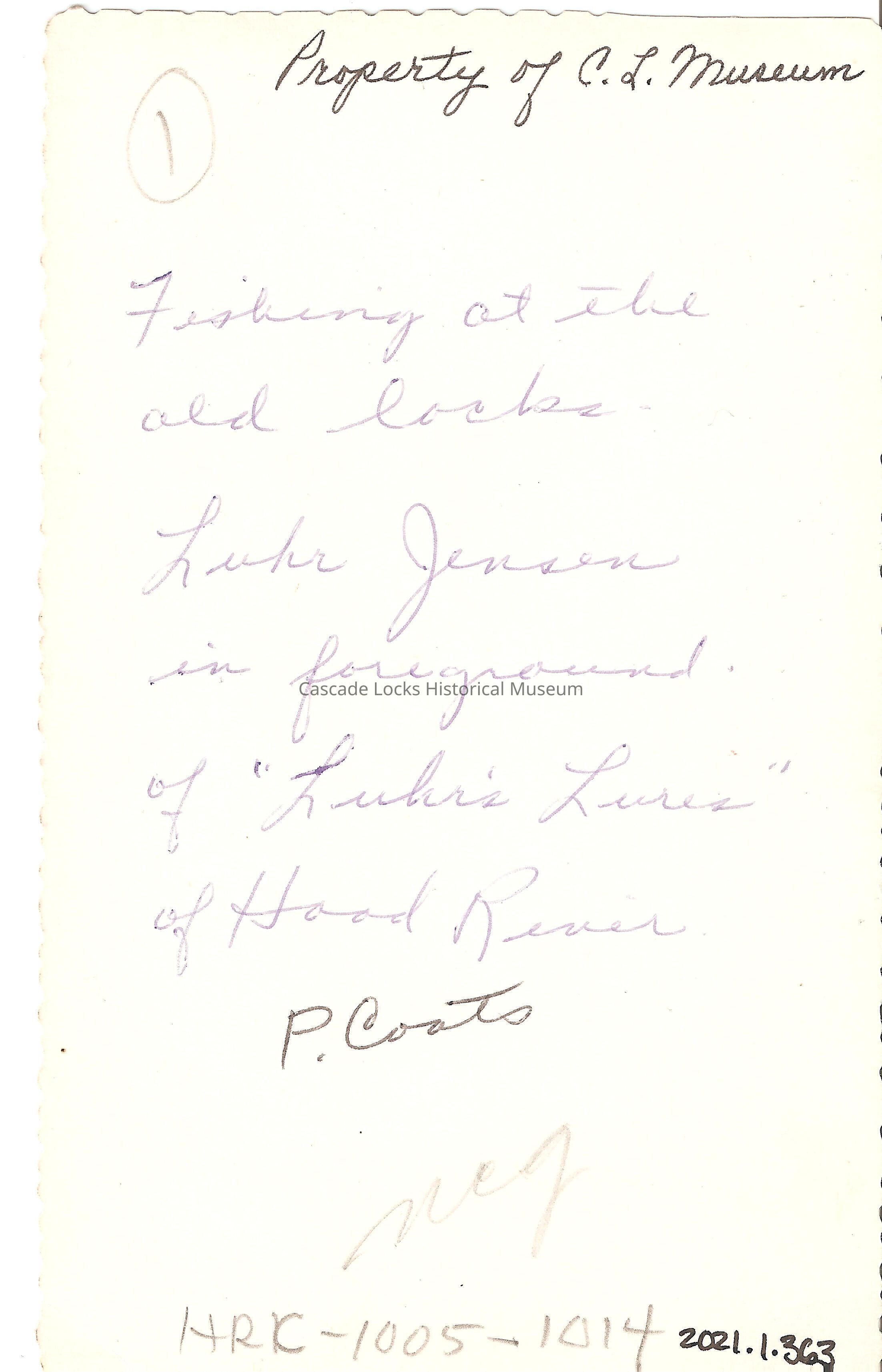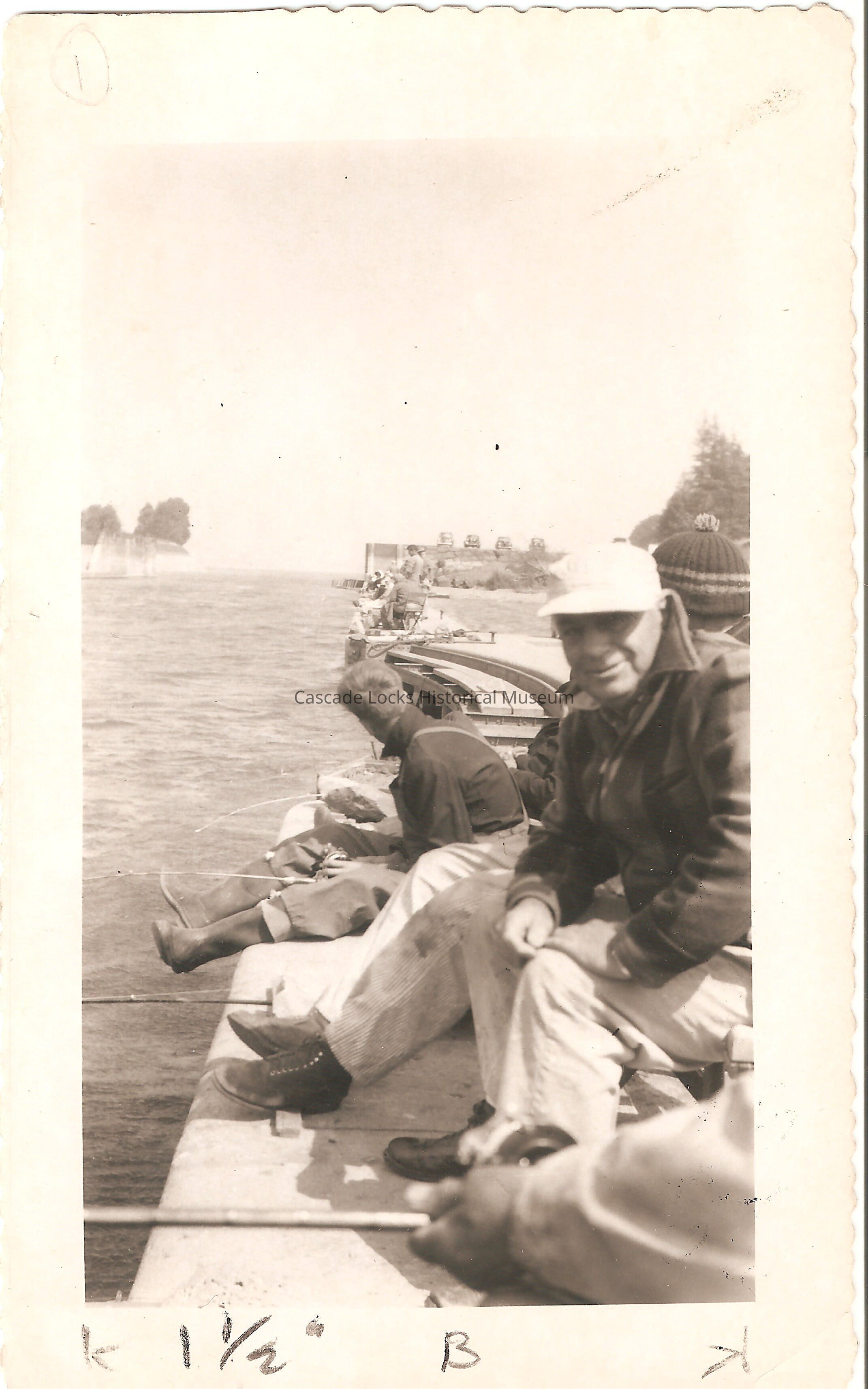 Back of image reads, "Fishing at the old locks. Luhr Jensen in foreground of "Luhr's Lures" of Hood River. P. Coats, Neg, HRC-1005-1014."Inscription/Signature/Marks