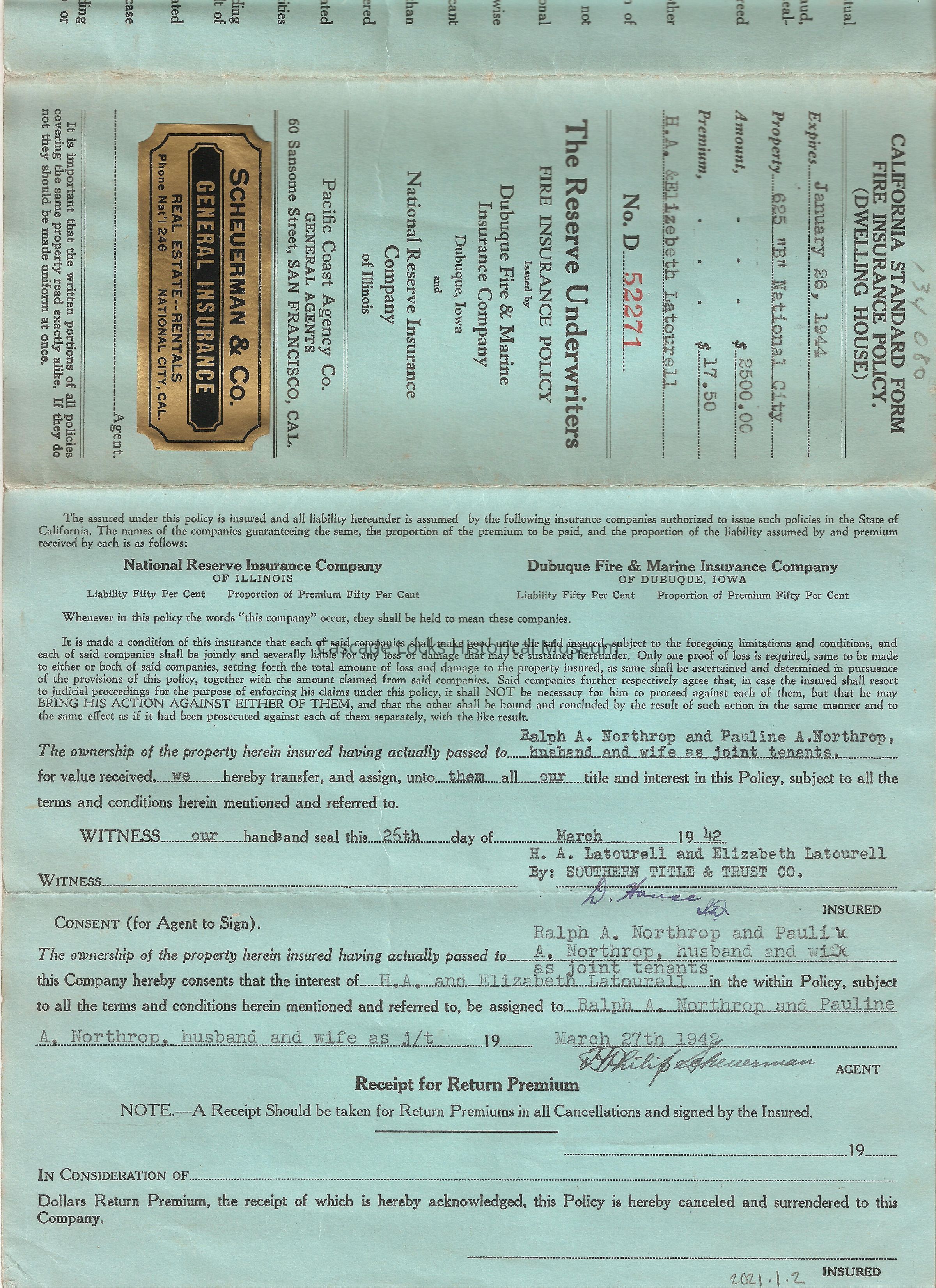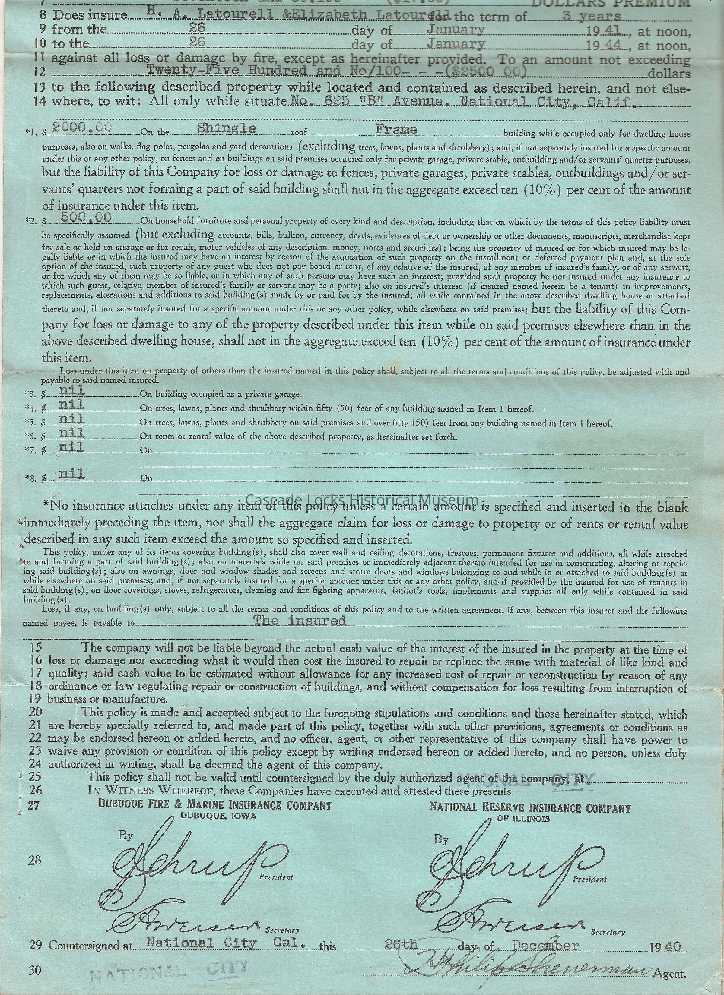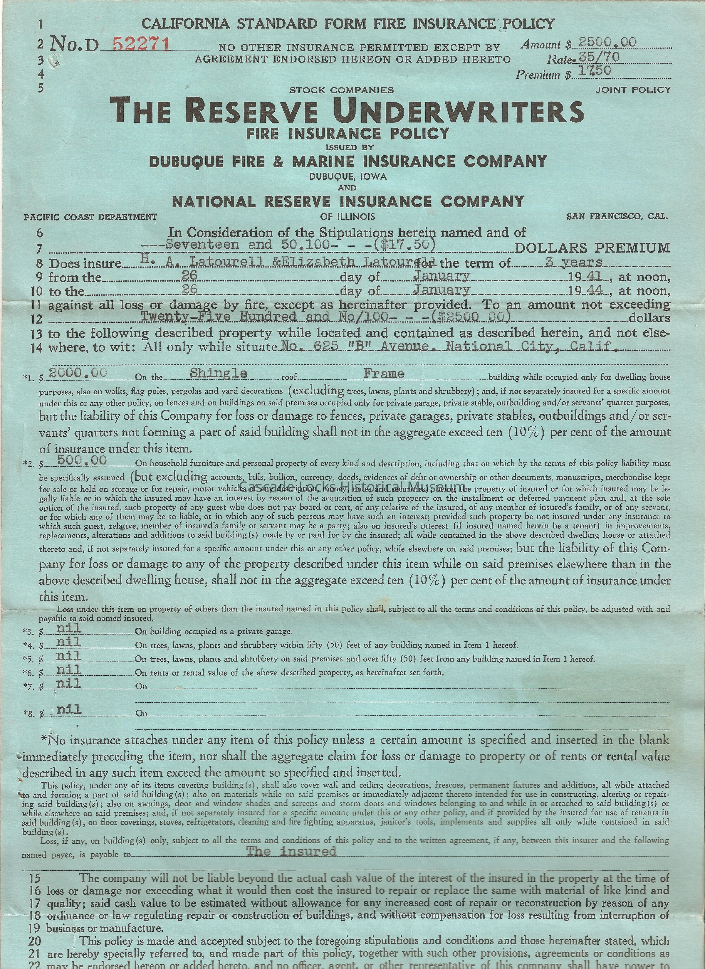 California Standard Form Fire Insurance Policy. (Dwelling House). Expires Jan 26, 1994. Property 625 "B" National City Amount $2,500.00 Premium $17.50. H. A. & Elizabeth Latourell. No. D 52271. Fire insurance policy issued by Dubuque Fire & Marine Insurance Company. Dubuque, Iowa and National Reserve Insurance Company of Illinois. Dec 26, 1940.Lexicon