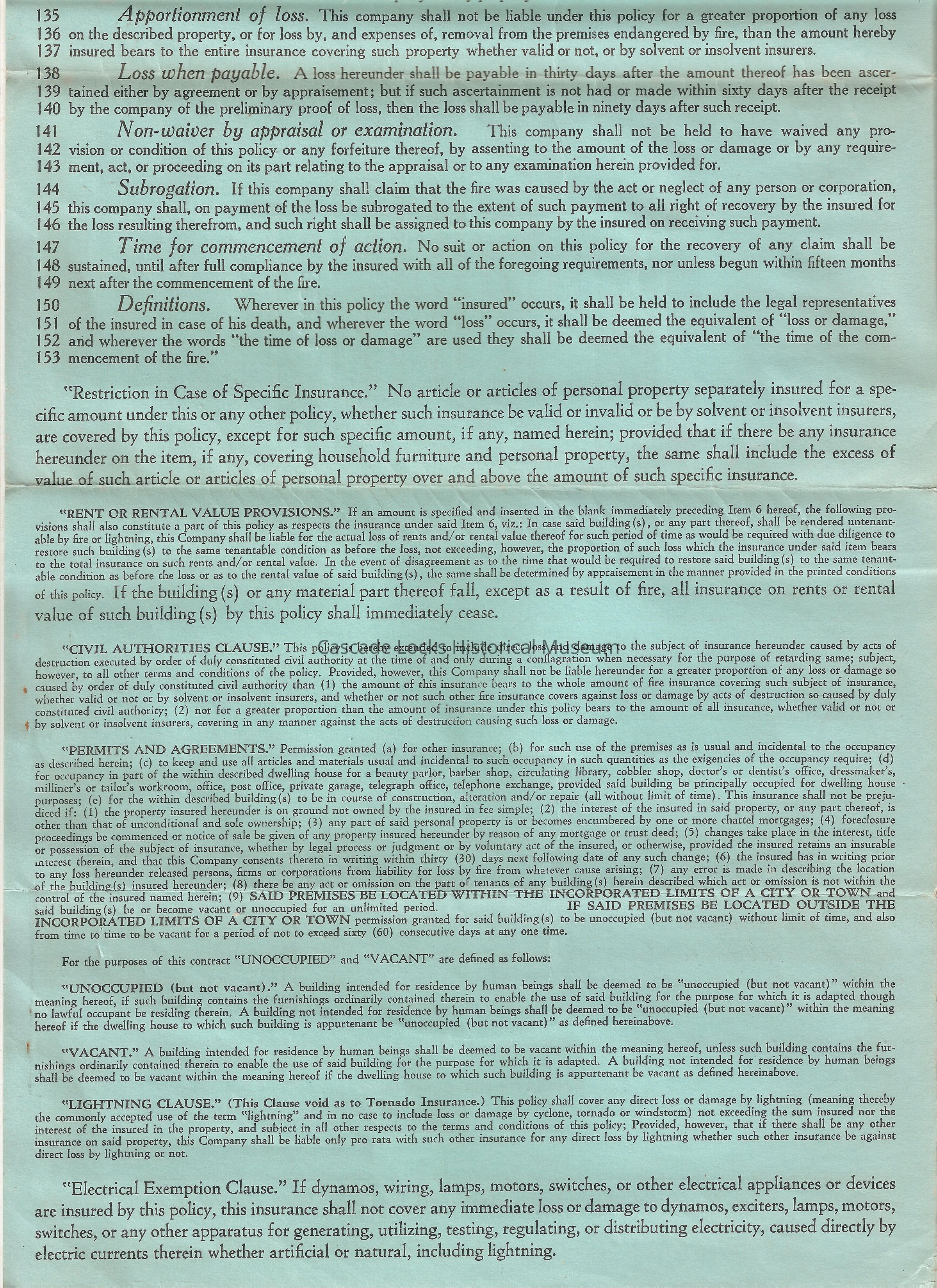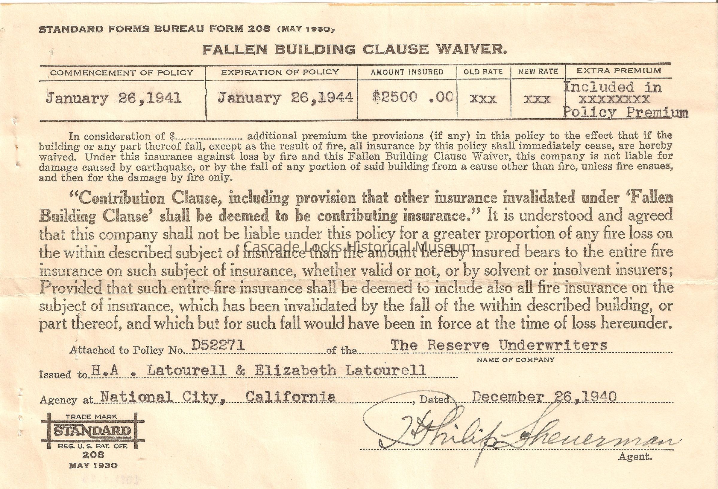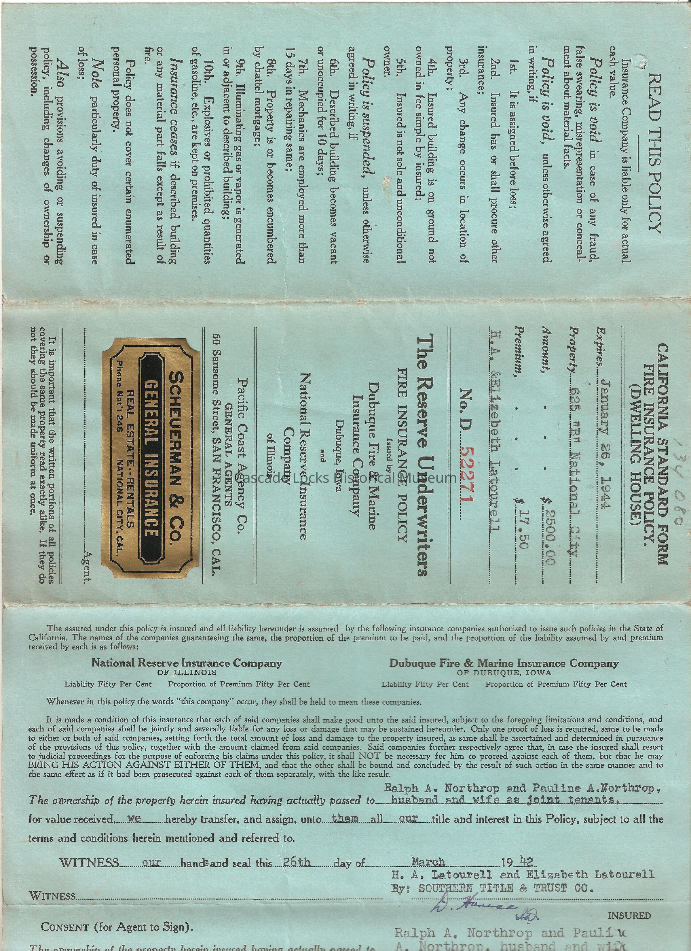 California Standard Form Fire Insurance Policy. (Dwelling House). Expires Jan 26, 1994. Property 625 "B" National City Amount $2,500.00 Premium $17.50. H. A. & Elizabeth Latourell. No. D 52271. Fire insurance policy issued by Dubuque Fire & Marine Insurance Company. Dubuque, Iowa and National Reserve Insurance Company of Illinois. Dec 26, 1940.Lexicon