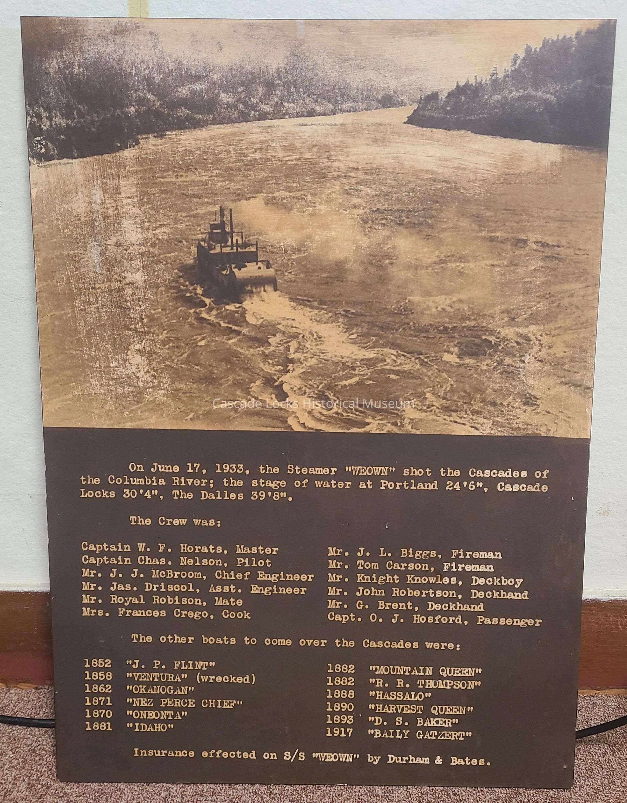 On June 17, 1933 the steamer "Weown" shot the Cascades of the Columbia River; the stage of water at Portland 24'6", Cascade Locks 30'4", The Dalles 39'8".