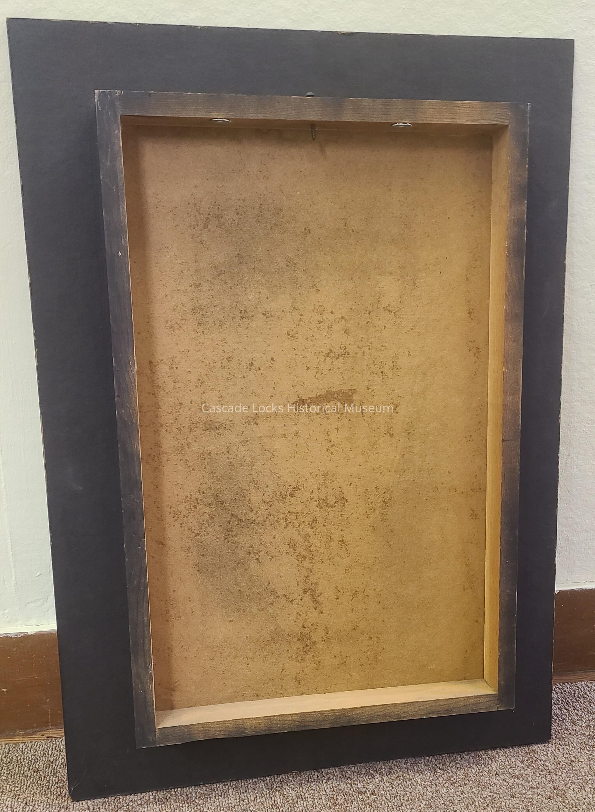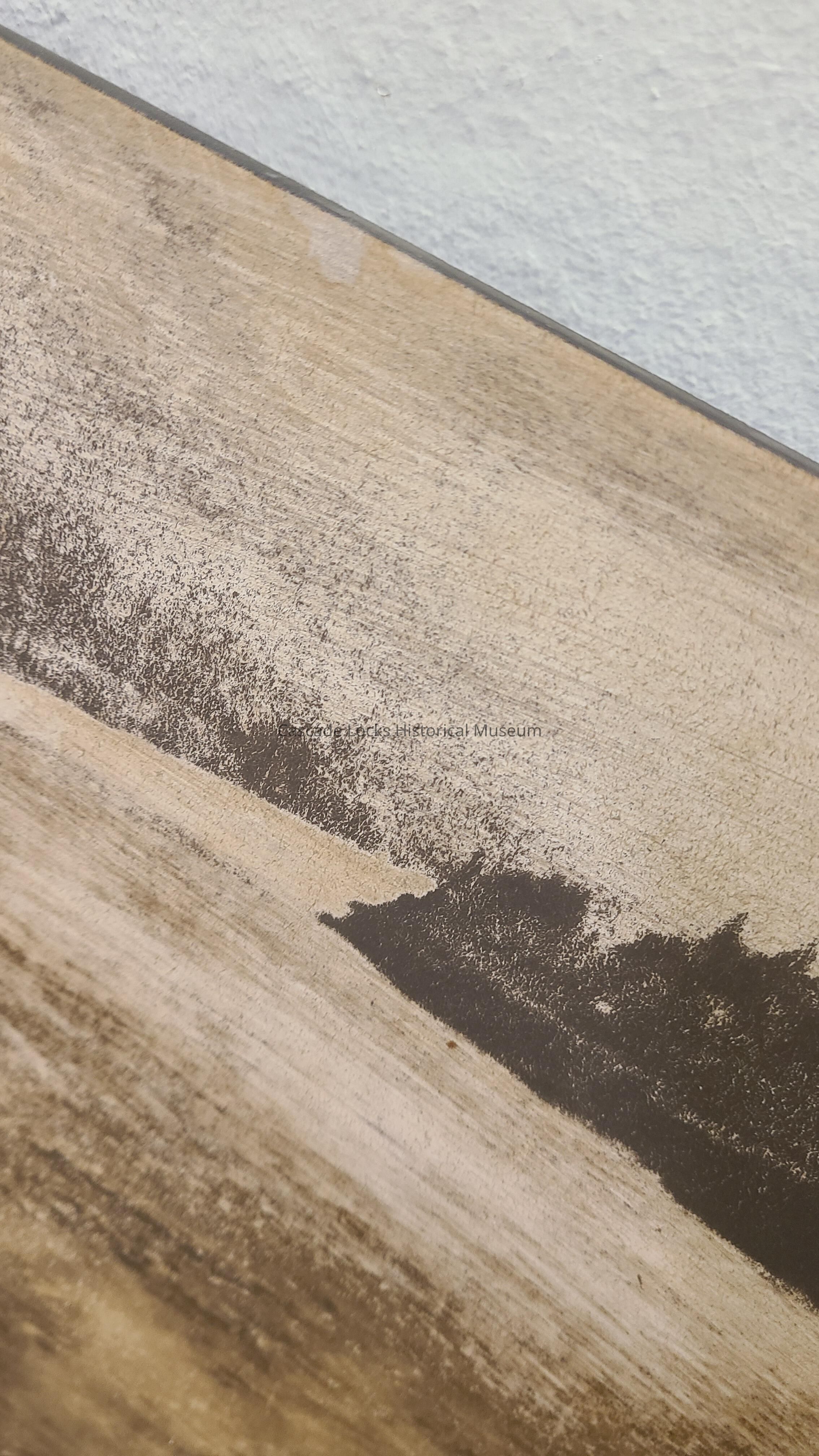 Front of text panel is a printed photo graphic image in brown, light tan and off-white. The top of the image is worn away to a light near white. The bottom of the panel is brown with off-white text. It is possible that the brown was at one point black.
