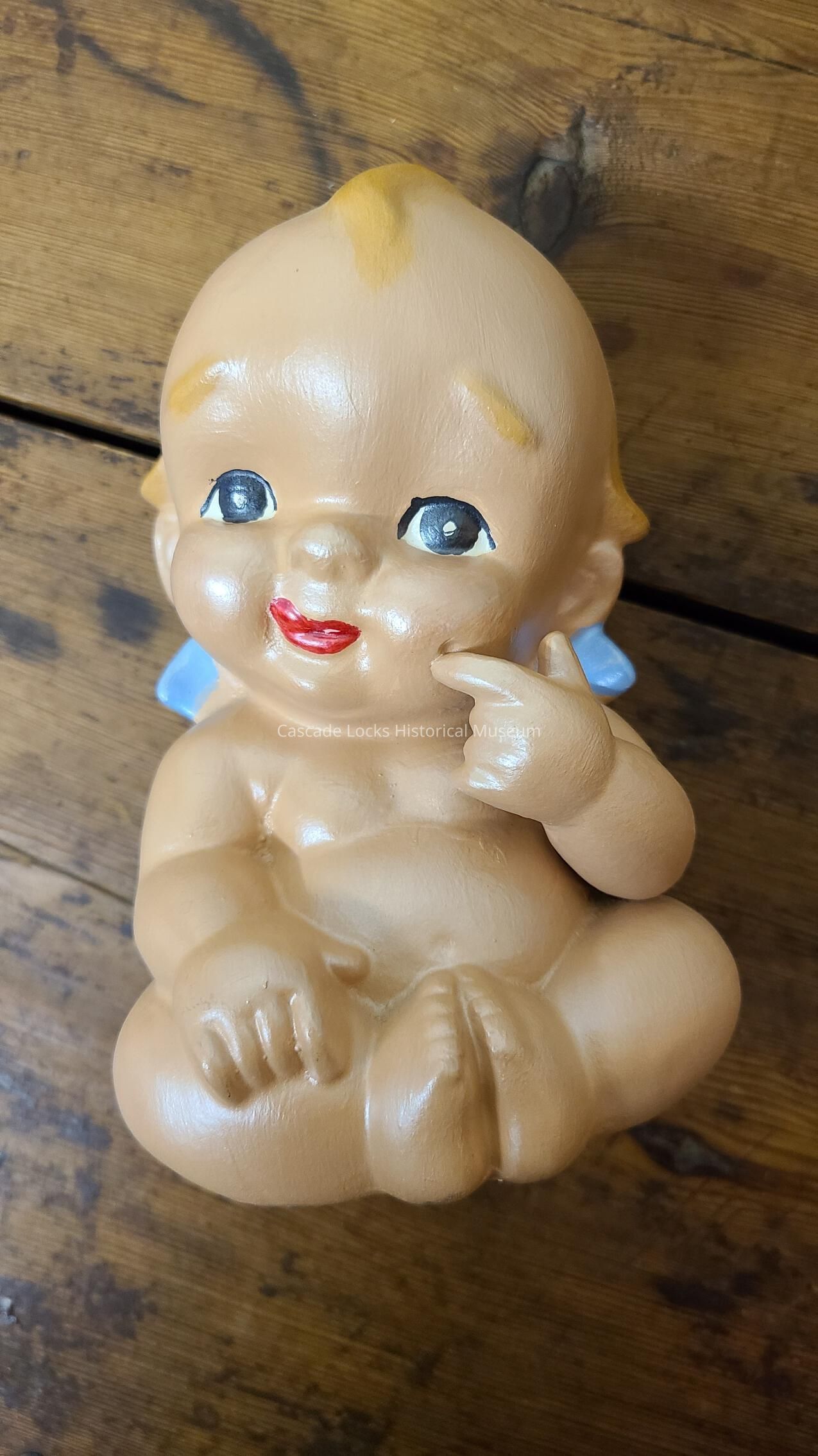 Statue of a Kewpie Doll. Doll is naked and has blue under its ears that could be wings or earrings. Appears to be hand painted with initial, L. H., on the bottom.
