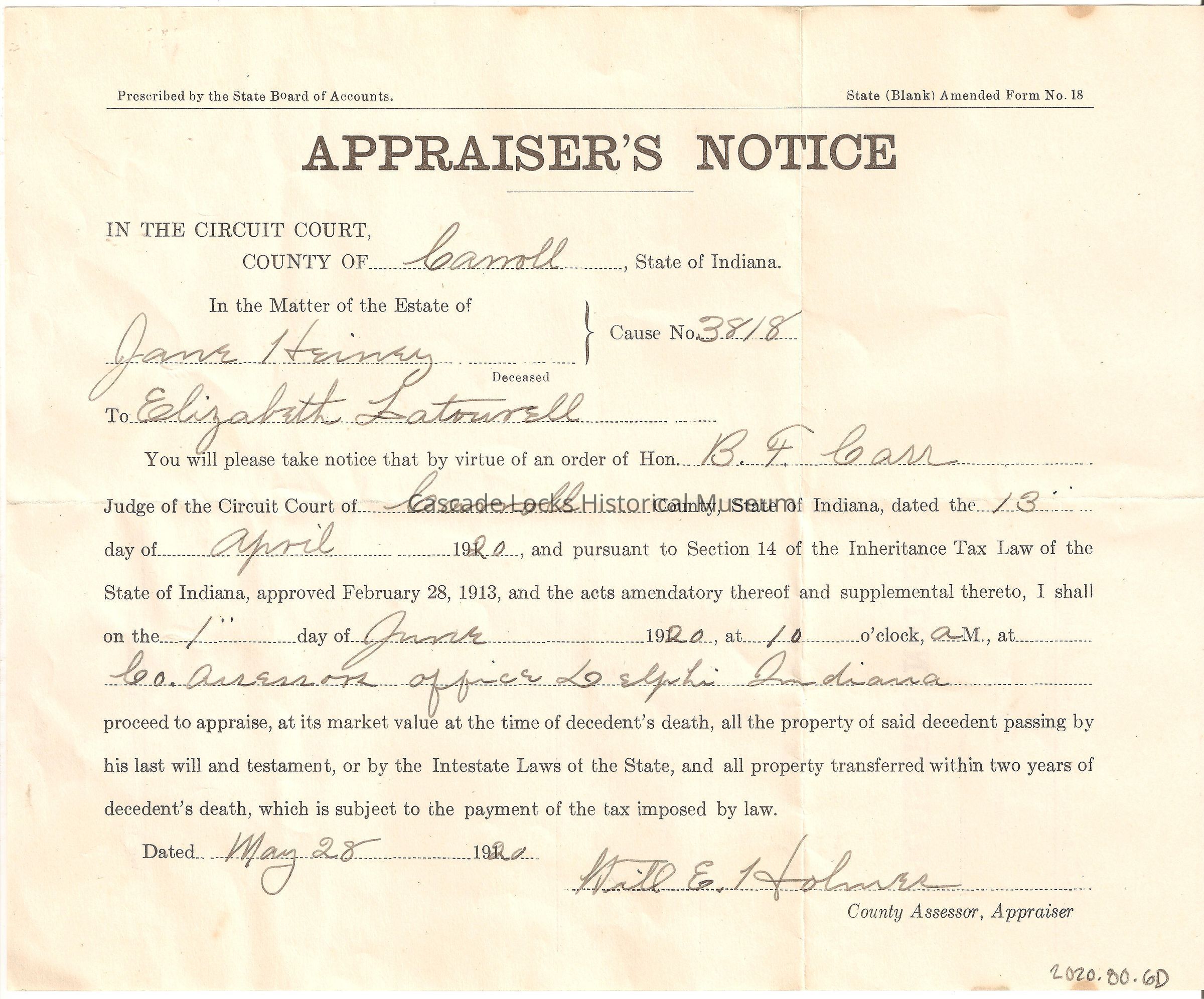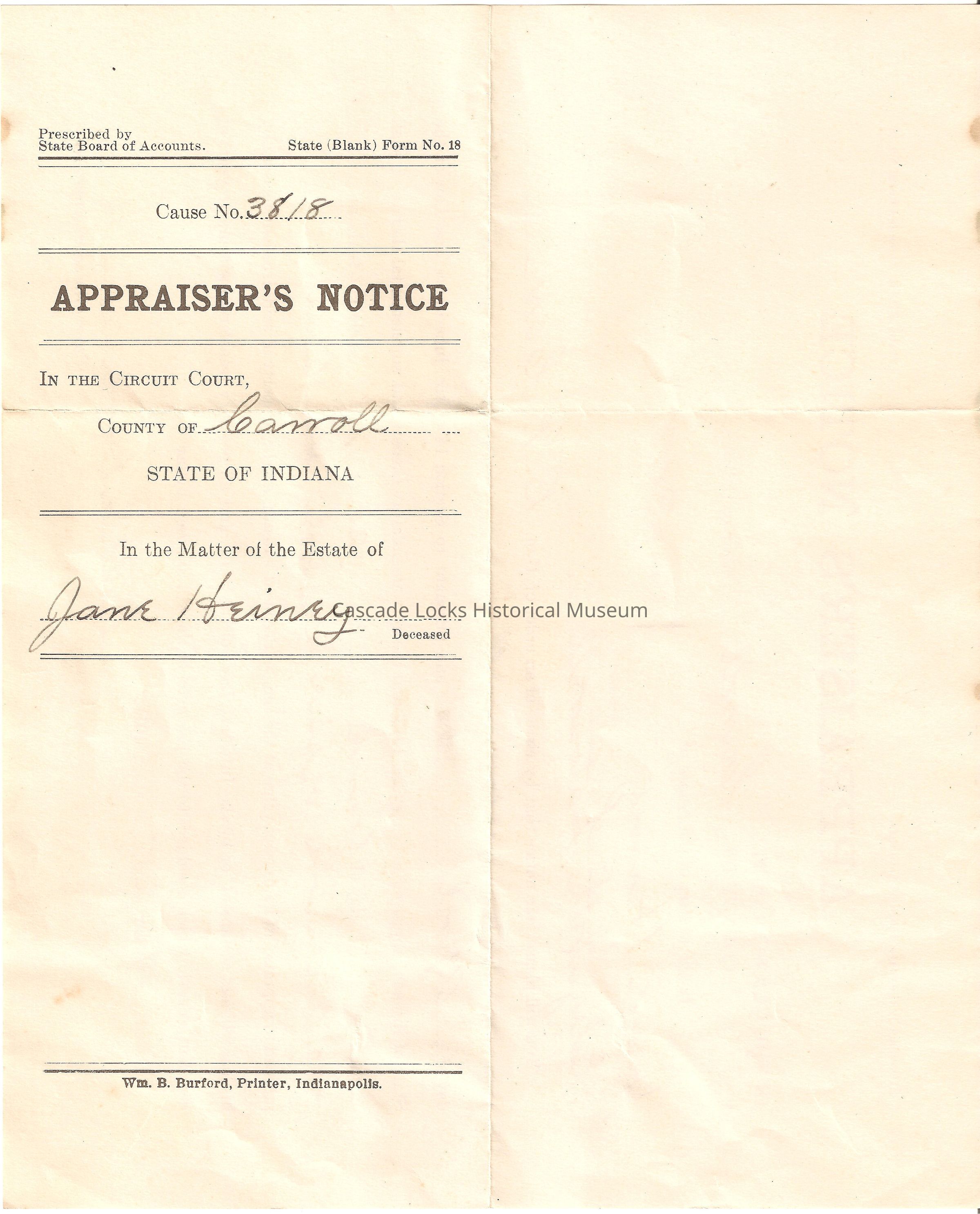 Prescribed by State Board of Accounts State (Blank) Form No. 18. Cause No. 3818 Appraiser's Notice. In the Circuit Count, County of Carroll State of Indiana. In the matter of the Estate of June Heiney. Wm. B. Burford, Printer, Indianapolis.