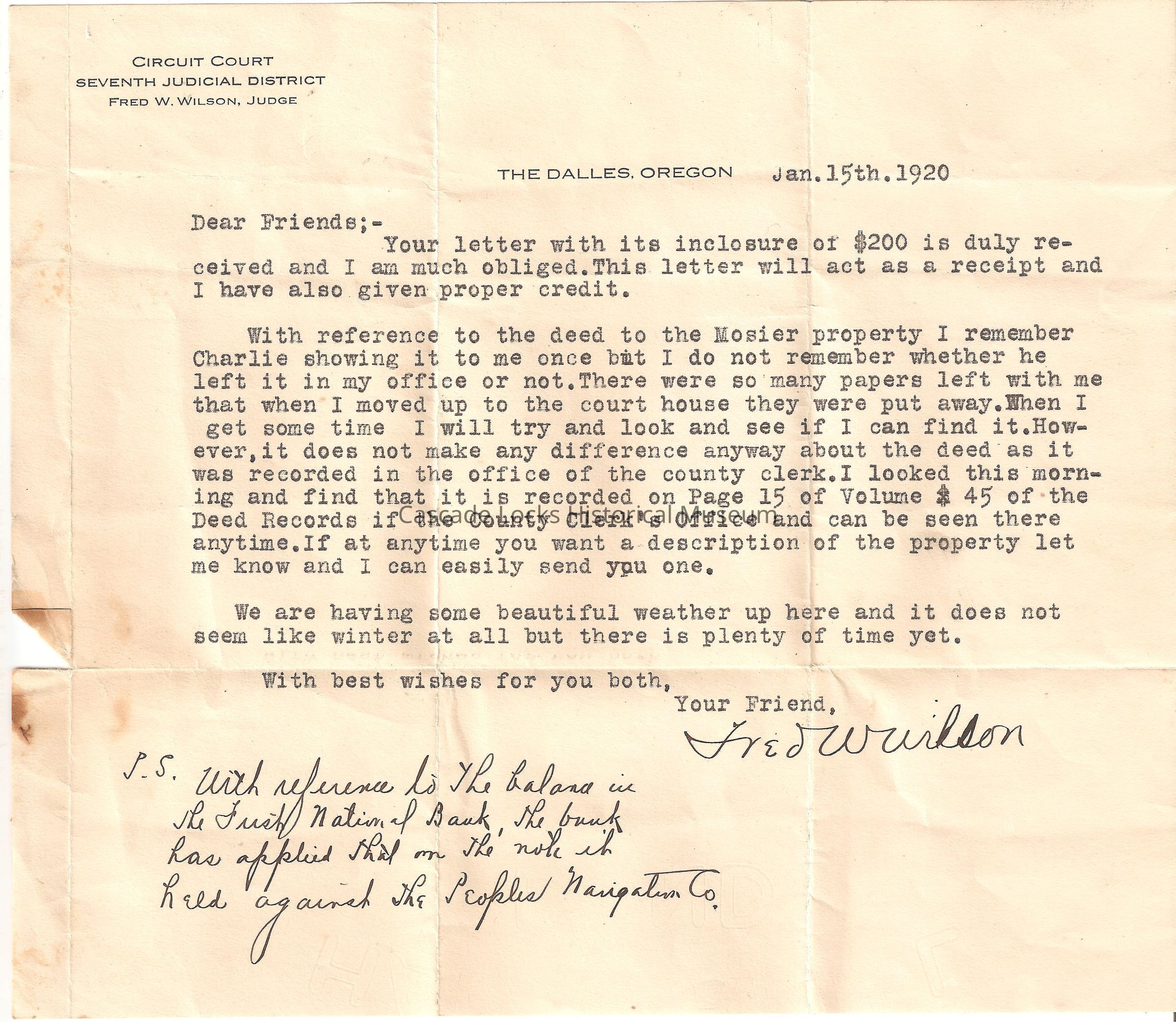 With reference to the deed of the Mosier property I remember /charlie showing it to me once but I do not remember whether he left it in my office or not. There were so many papers left with me that when I moved up to the court house they were put away. When I get some time I will try and look and see if I can find it. However, it does not make any difference anyways about the deed as it was recorded in the office of the county clerk. I looked this morning and find that it is recorded on page 15 of volume $45 of the deed records if the county clerks office and can be seen there anytime. If at anytime you want a description of the property let me know and I can easily send you one.