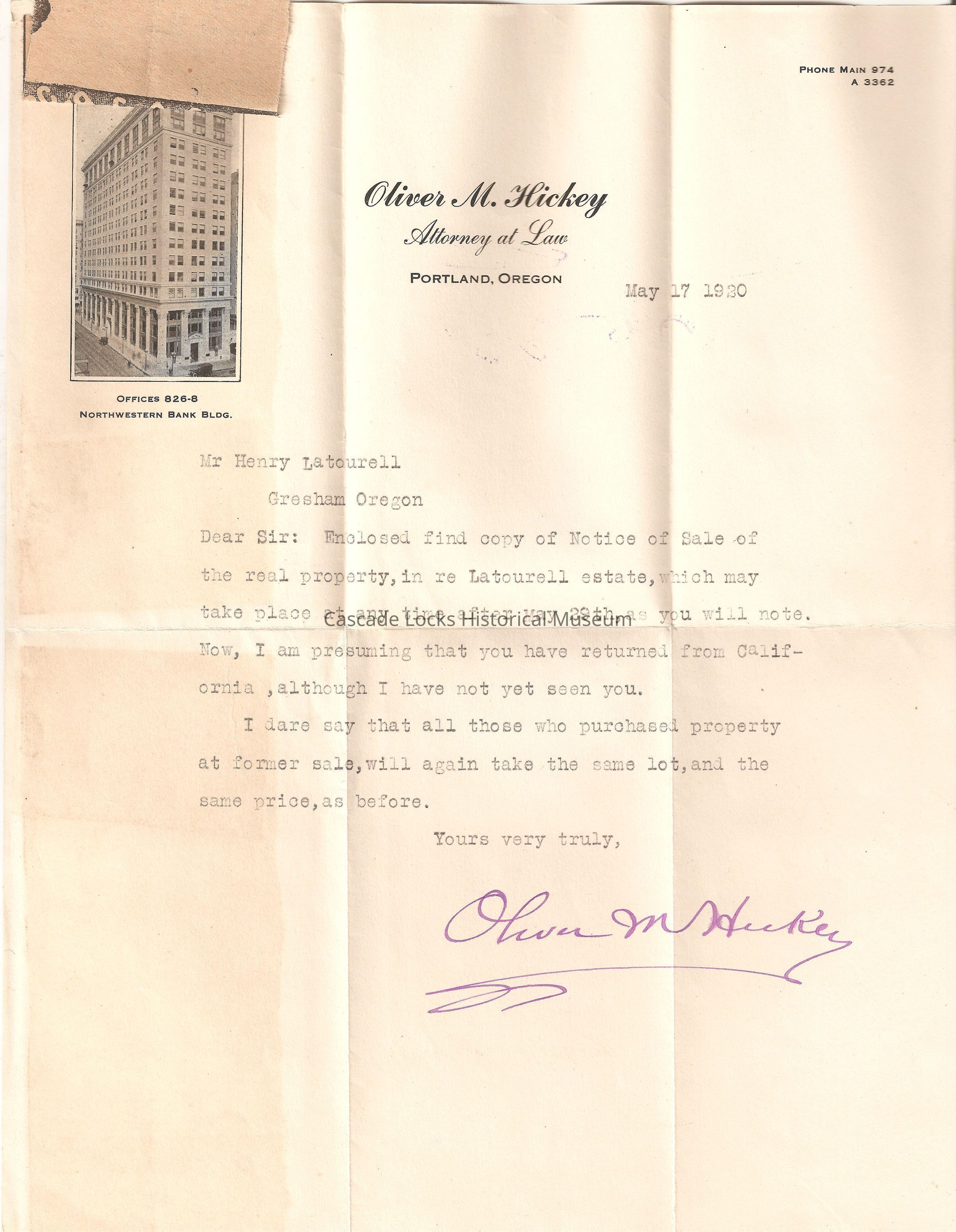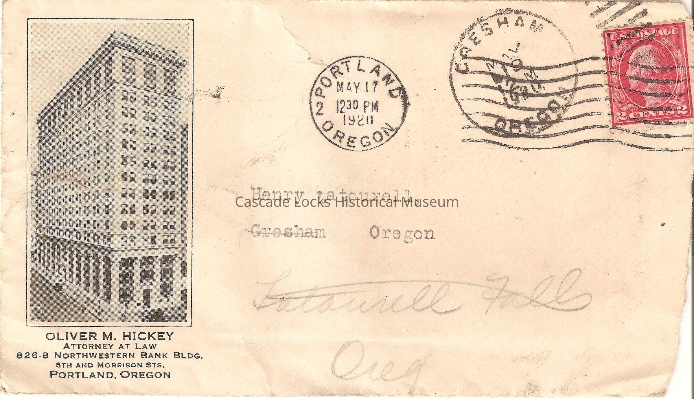 Envelope- Oliver M. Hickey. Attorney at Law. 826-8 Northwestern Bank Building. 6th and Morrison Sts. Portland, Oregon. Portland, Oregon, May 17, 1920. 12:30 PM. Gresham, Oregon, May 19, 1920. Henry Latourell, Gresham Oregon, Latourell Falls, Oreg. (Red 2 cent stamp)