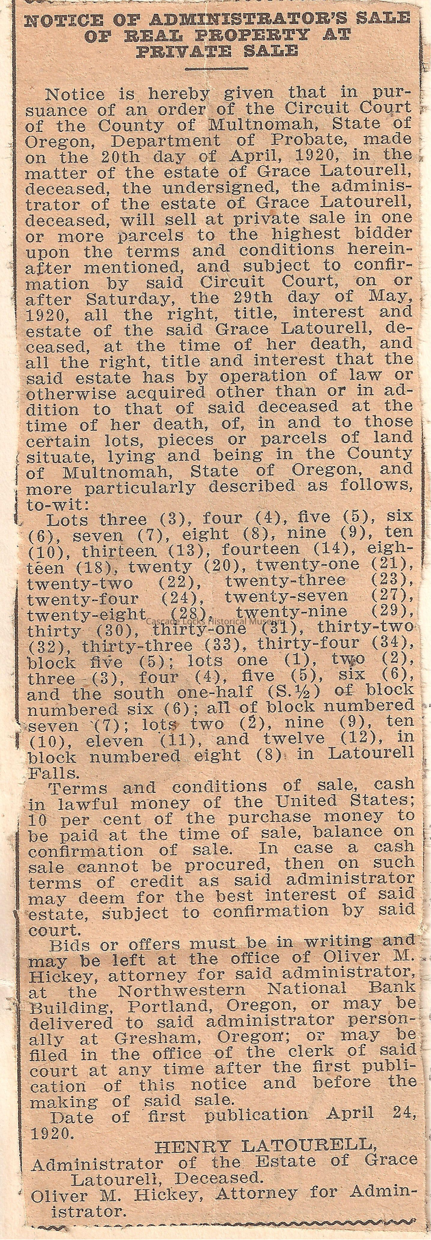 Notice is hereby given that in pursuance of an order of the Circuit Court of the County of Multnomah, State of Oregon, Department of Probate, made on the 20th day of April, 1920, in the matter of the Estate of Grace Latourell, Deceased, the undersigned, the administrator of the Estate of Grace Latourell, deceased, will sell at the private sale in one or more parcels to the highest bidder upon the terms and conditions herein after mentioned, and subject to confirmation by said Circuit Court, on or after Saturday, the 29th day of May, 1920, all the right, title, interest and estate of the said Grace Latourell, deceased, at the time of her death and all the right, title, and interest that the said estate has by operation of law or otherwise acquired other than or in addition to that of said deceased at the time of her death, of, in and to those certain lots, pieces or parcels of land situated, lying and being in the County of Multnomah, State of Oregon, and more particularly described as follows, to-wit: Lots three (3), four (4), five (5), six (6), seven (7), eight (8), nine (9), ten (10), thirteen (13), fourteen (14), eighteen (18), twenty (20), twenty-one (21), twenty-two (22), twenty-three (23), twenty-four (24), twenty-seven (27), twenty-eight (28), twenty-nine (29), thirty (30), thirty-one (31), thirty-two (32), thirty-three (33), thirty-four (34), Block five (5), Lot one (1), two (2), three (3), four (4), five (5), six (6), and the south one-half (S 1/2) of block numbered six (6); all of block numbered seven (7), Lots two (2), nine (9), ten (10), eleven (11), and twelve (12), in block numbered eight (8) in Latourell Falls.