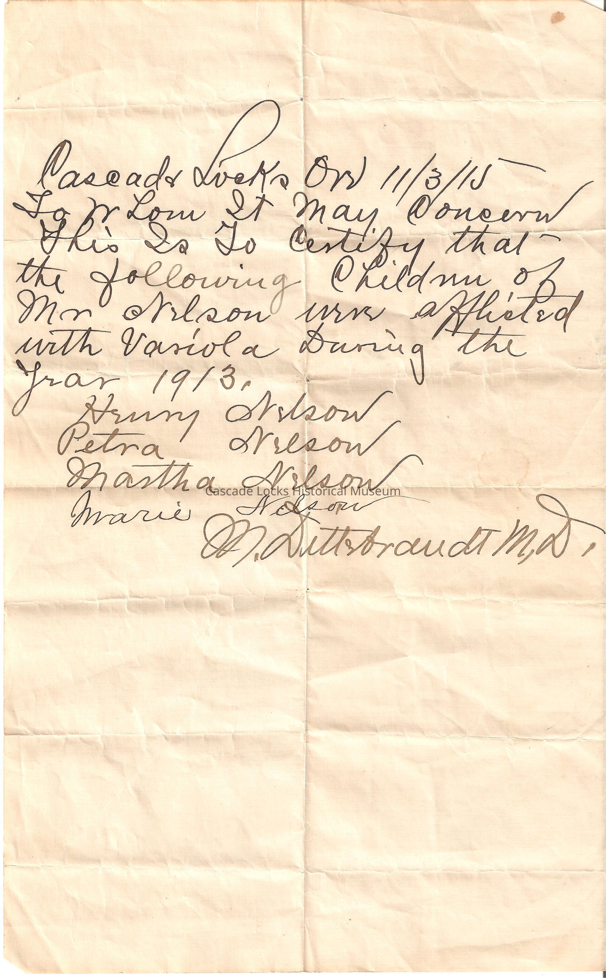 Letter from Doctor M, Ditt Araudt acknowledging that Mr Captain Charles Nelson's children where ill with smallpox (Variola) in the year 1913.