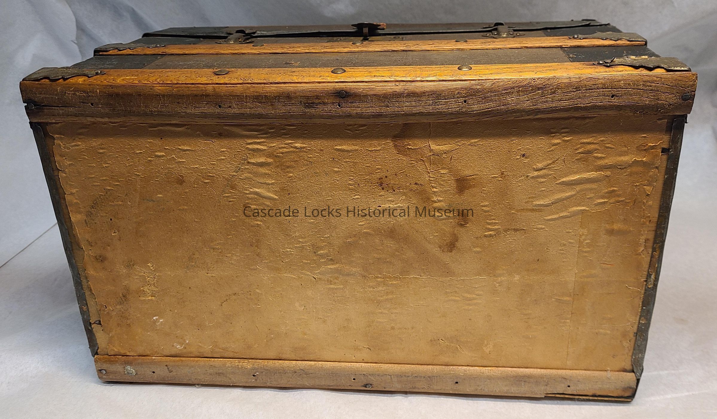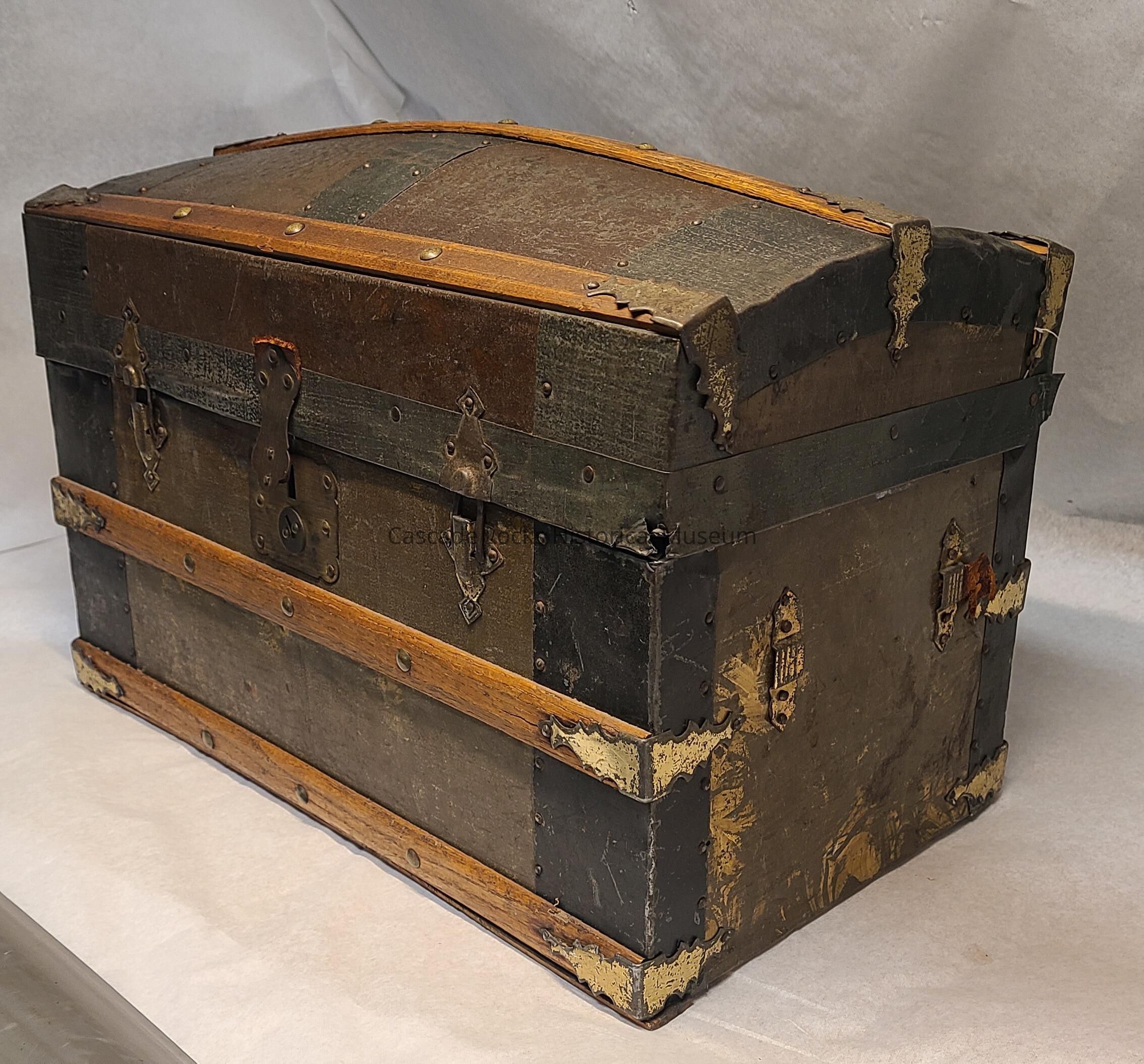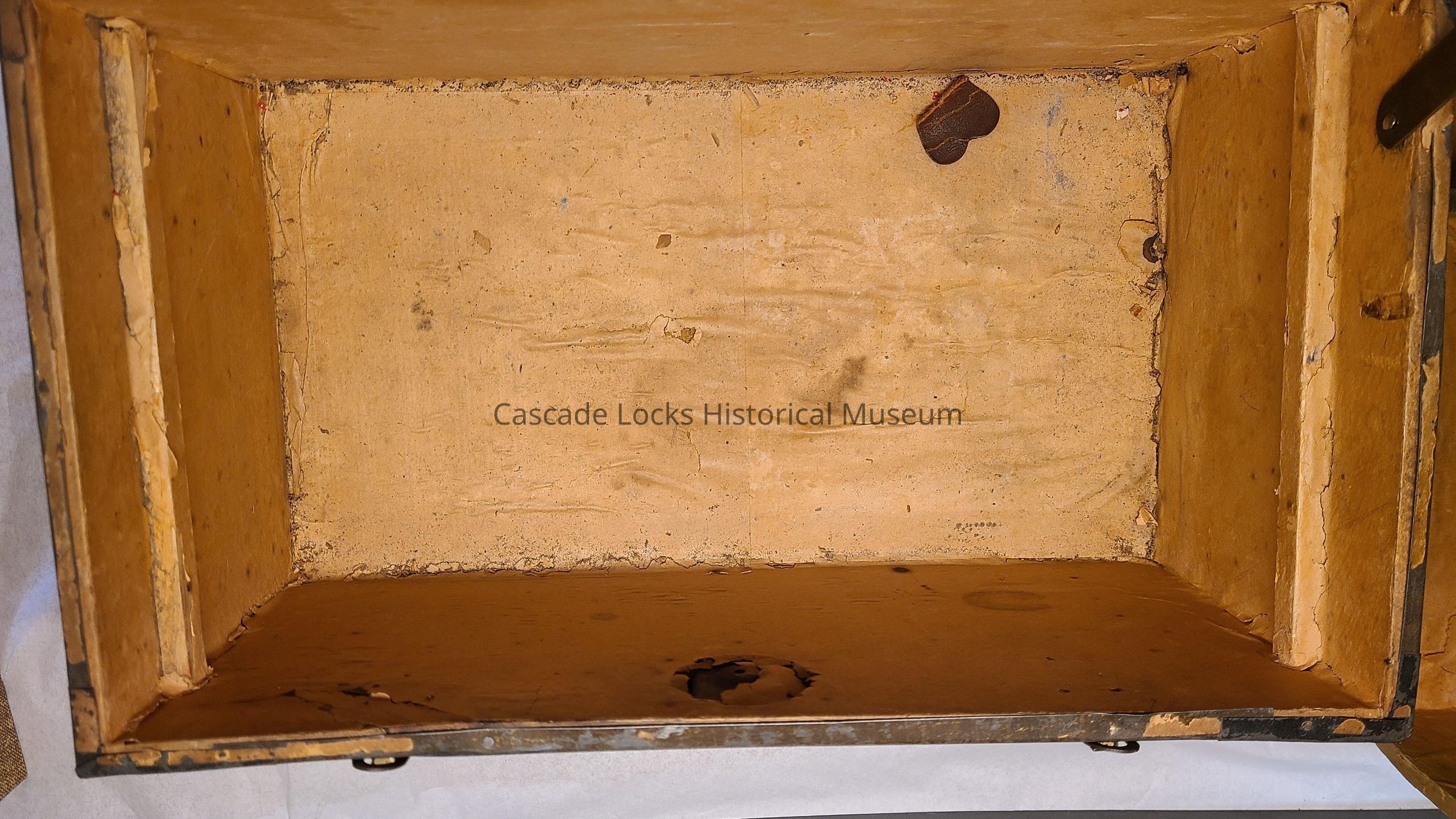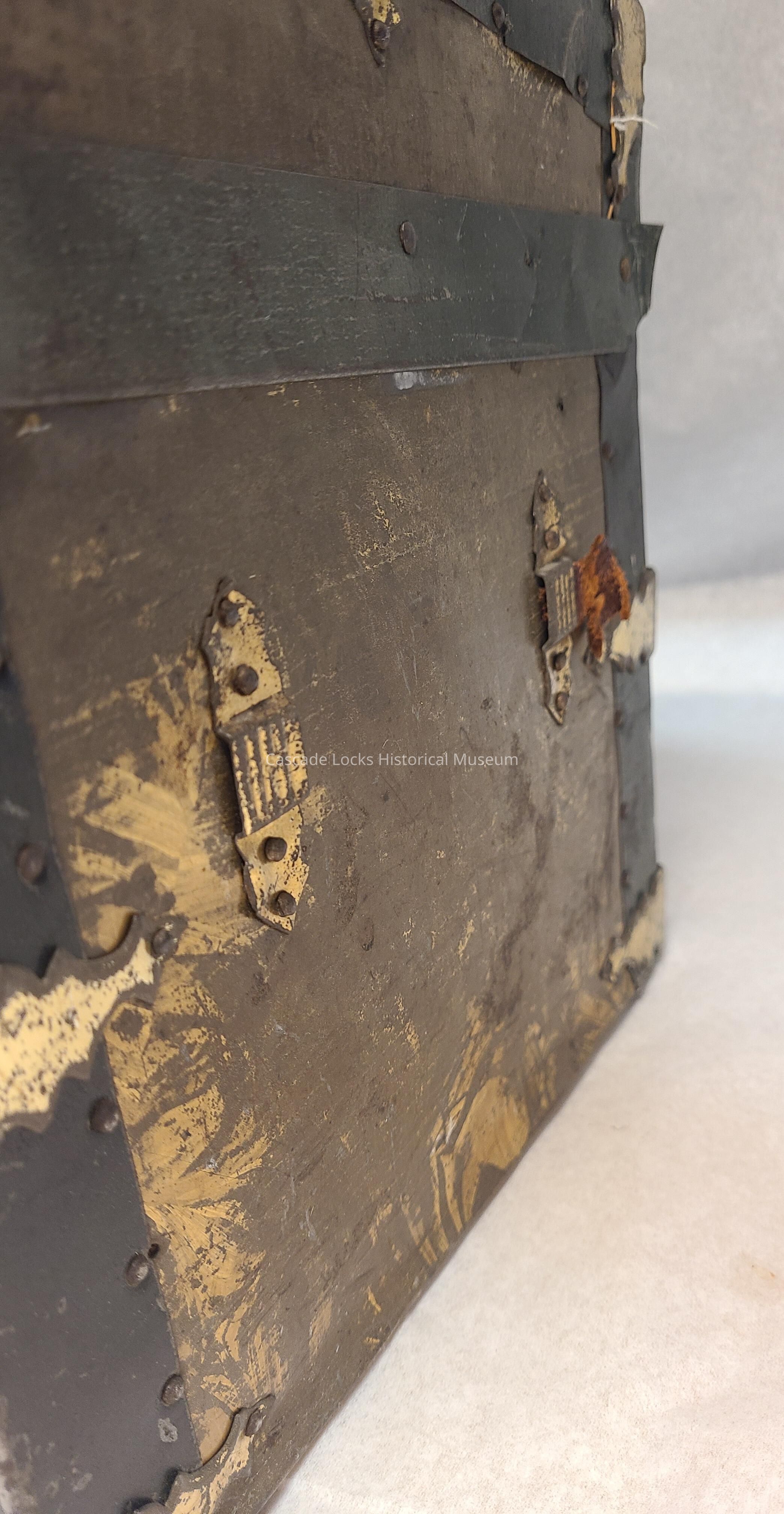 Outside of trunk is brown with tan wood and black edges. There is brown discoloration of wood and off-white discoloration of the brown fabric. The leather handles are tan and red.