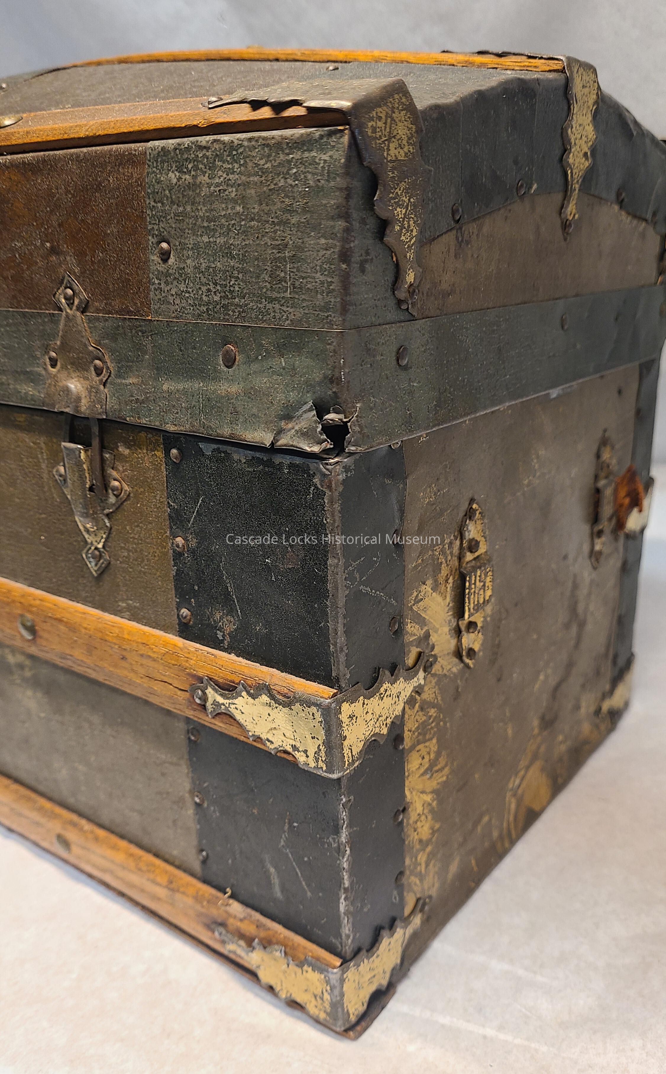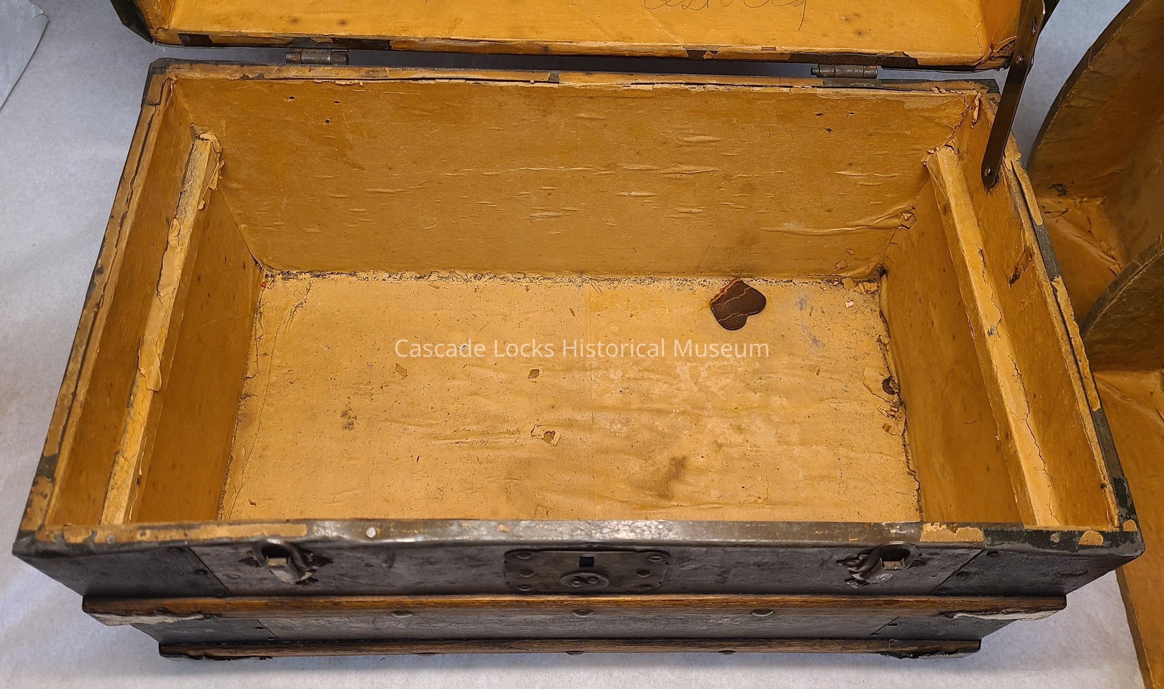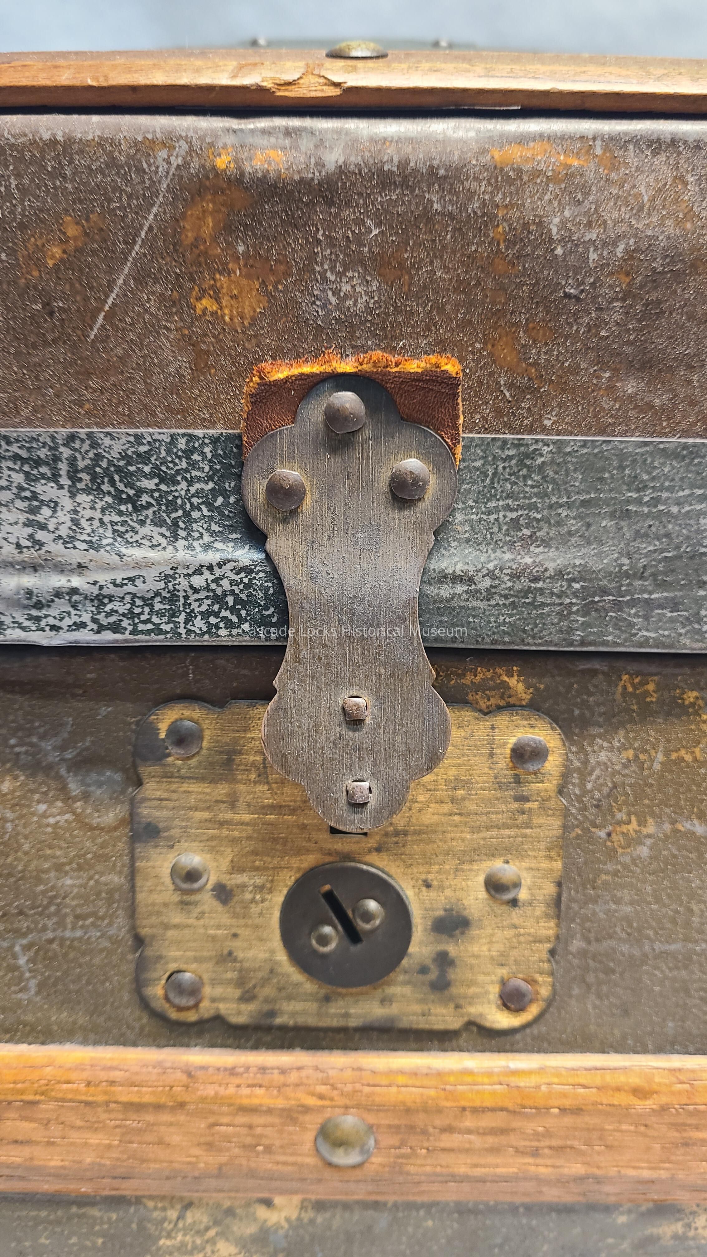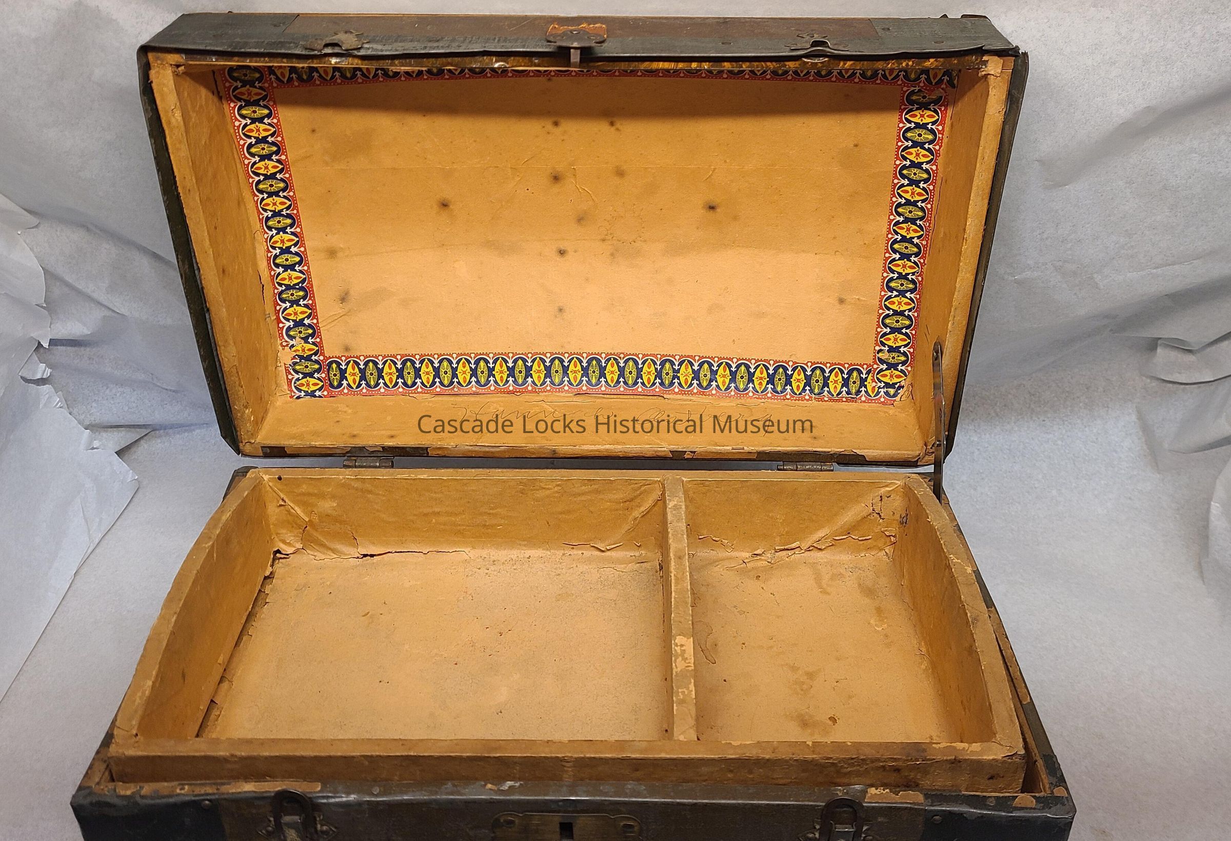 Outside of trunk is brown with tan wood and black edges. There is brown discoloration of wood and off-white discoloration of the brown fabric. The leather handles are tan and red.