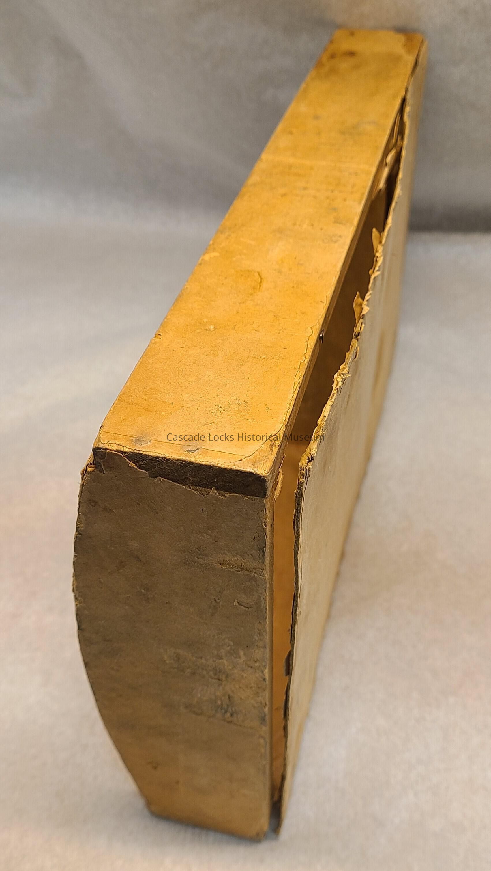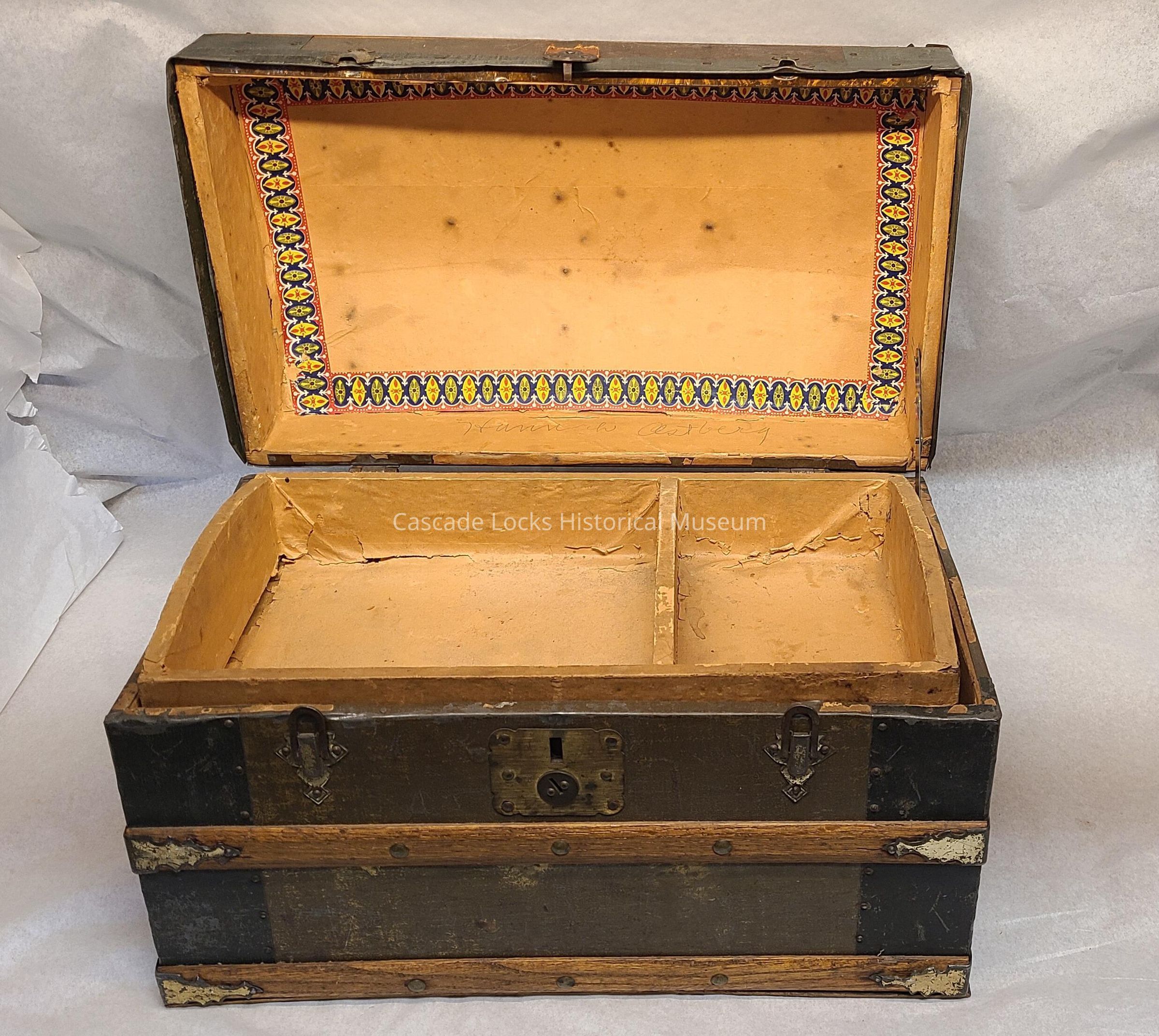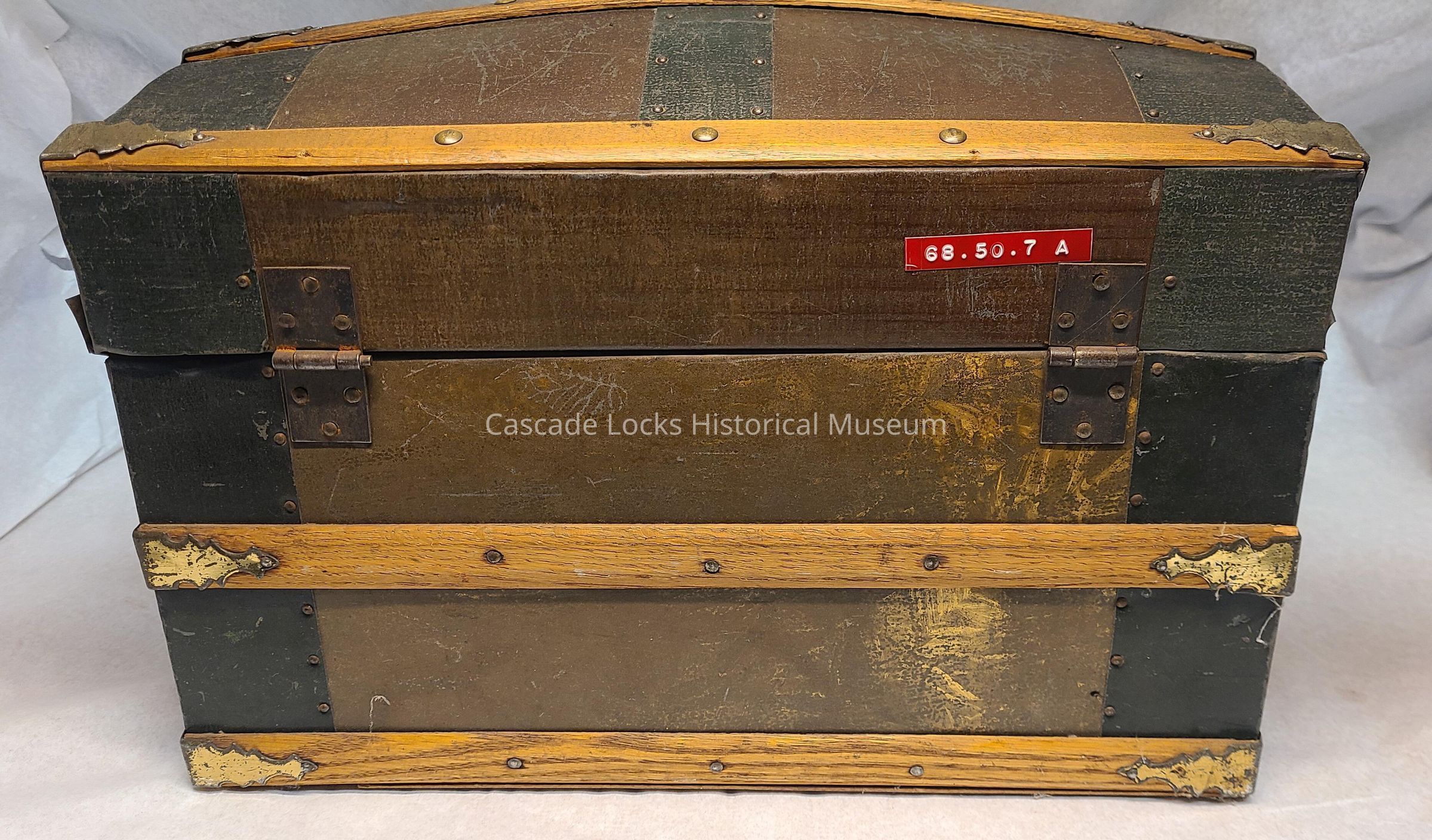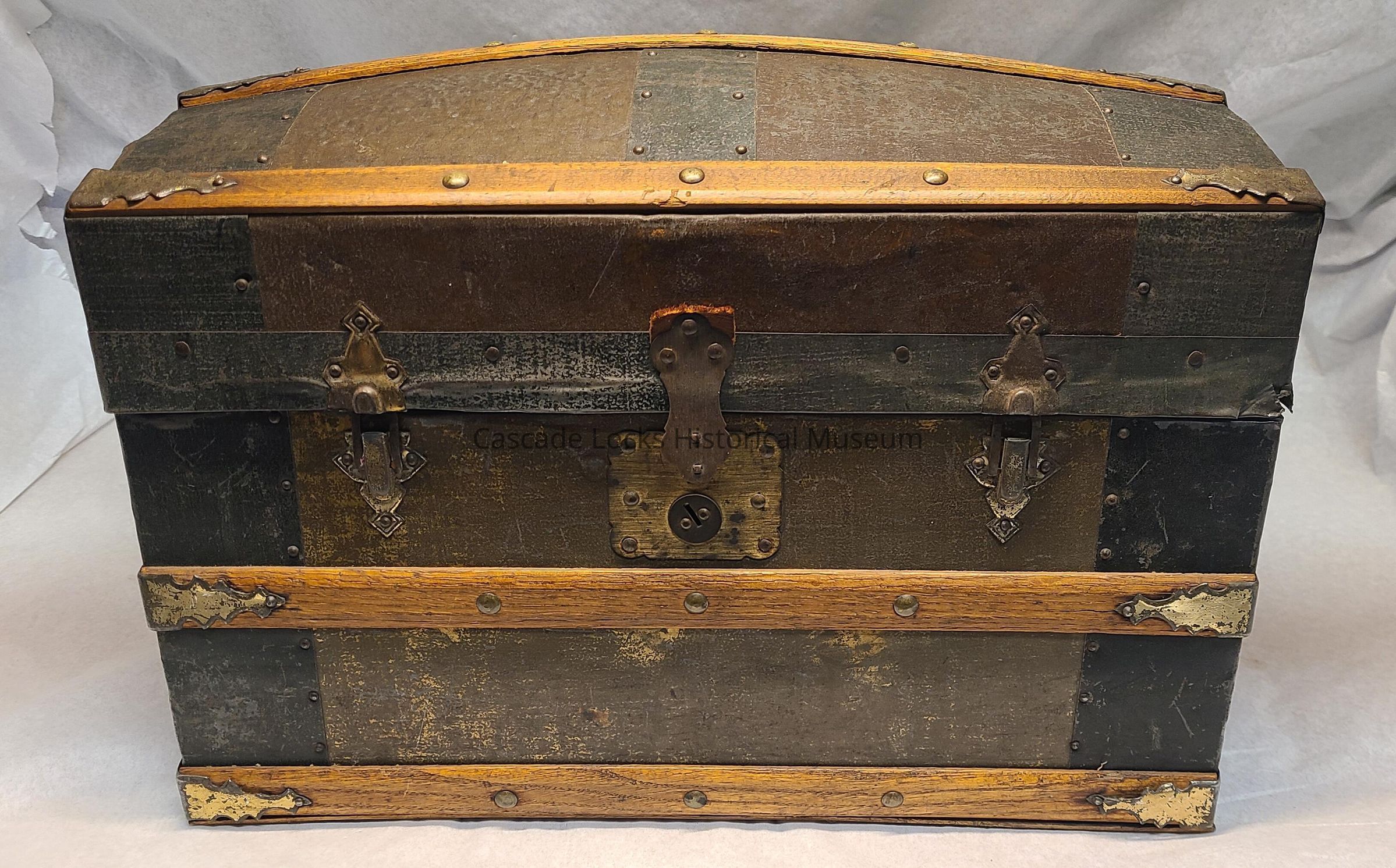 Outside of trunk is brown with tan wood and black edges. There is brown discoloration of wood and off-white discoloration of the brown fabric. The leather handles are tan and red.