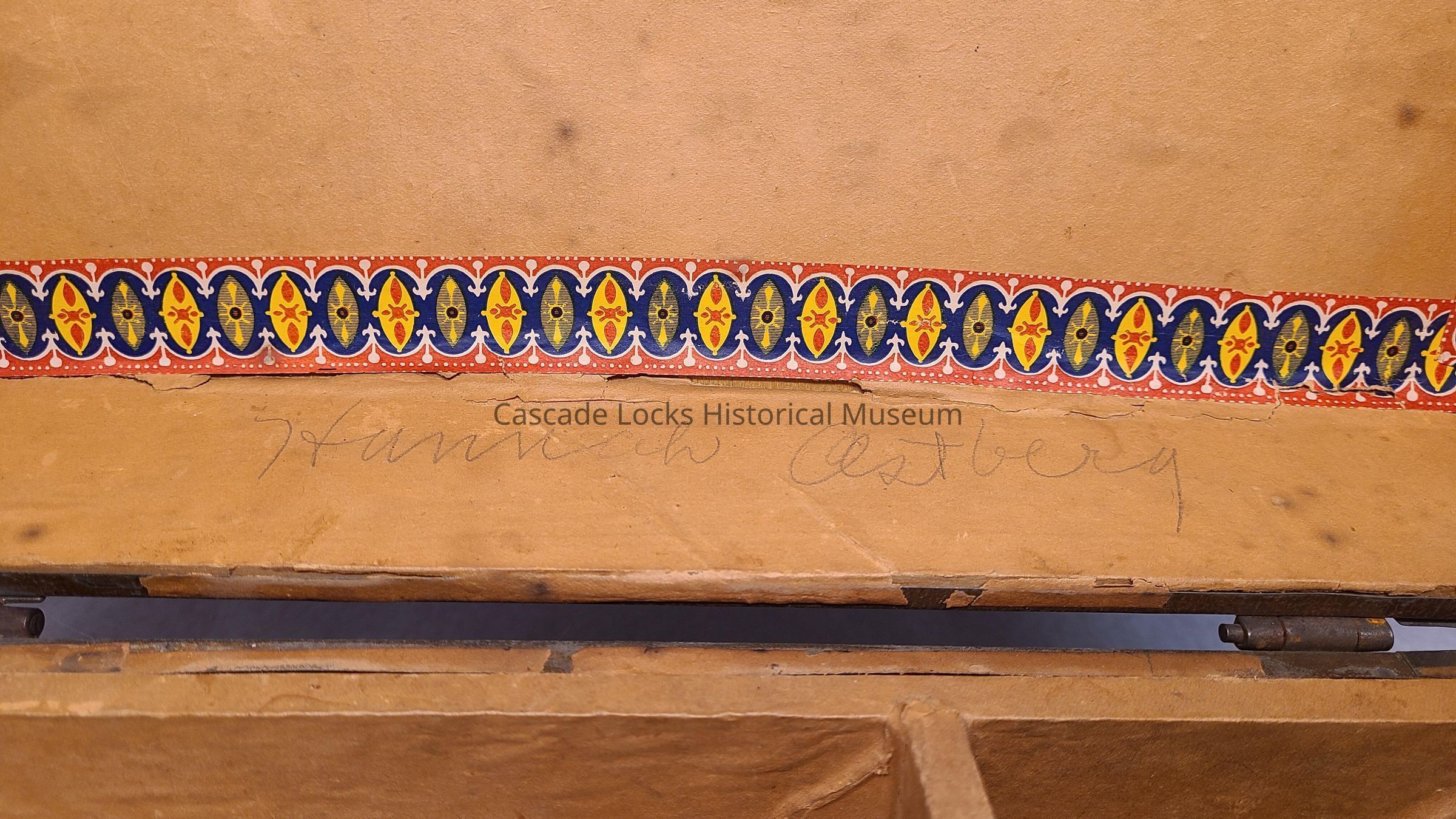 The inside of the trunk is tan with colorful boarder of red, yellow, green, blue, and black.