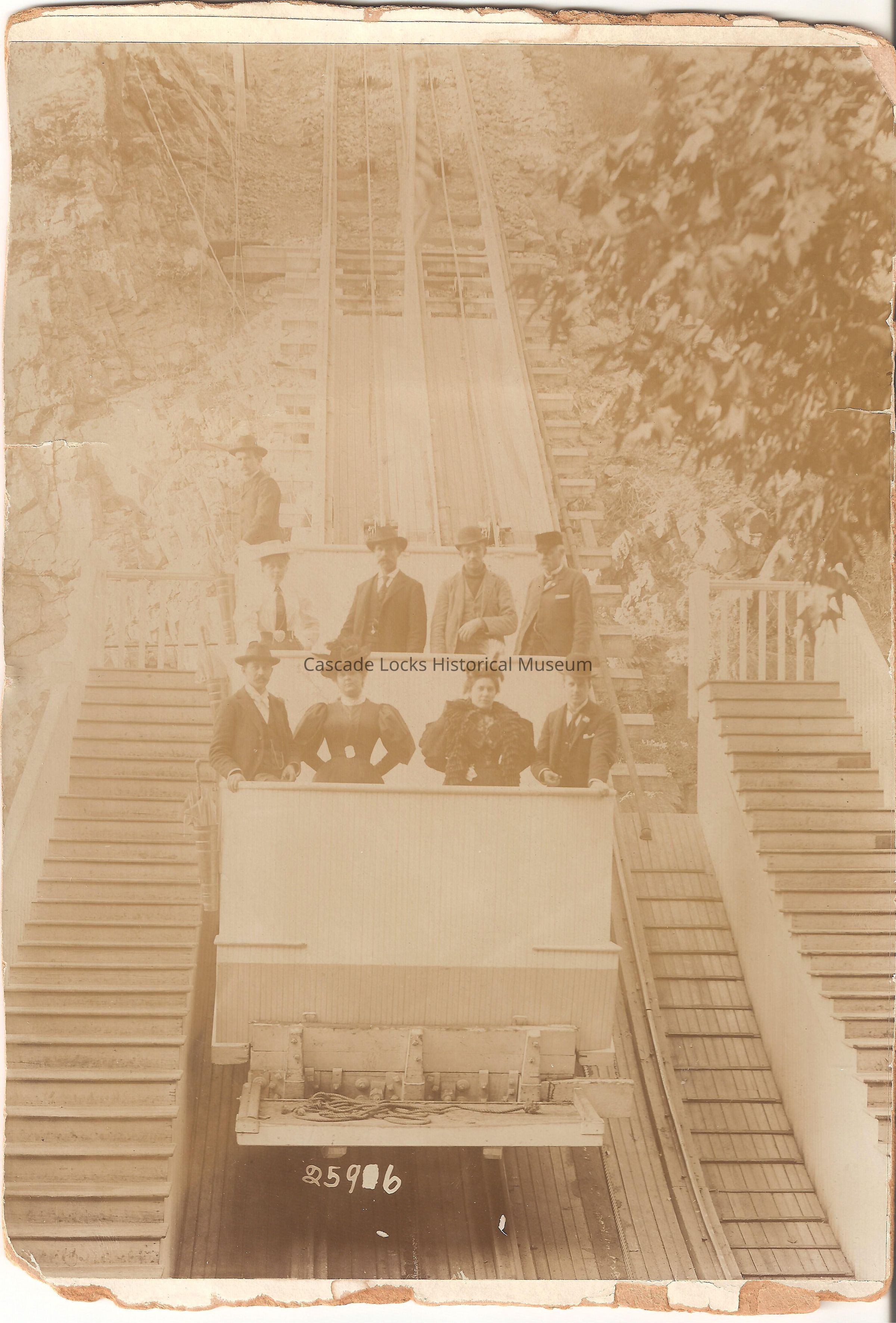 Souvenir Photograph from Mount Lowe Railway, California, Cable Cars. The front has an image of a group of people riding the cable cars up an incline. The back of the matting has a printed poem about the Mount Lowe Railway. The sides of the poem are surrounded by other attractions in the area.Inscription/Signature/Marks