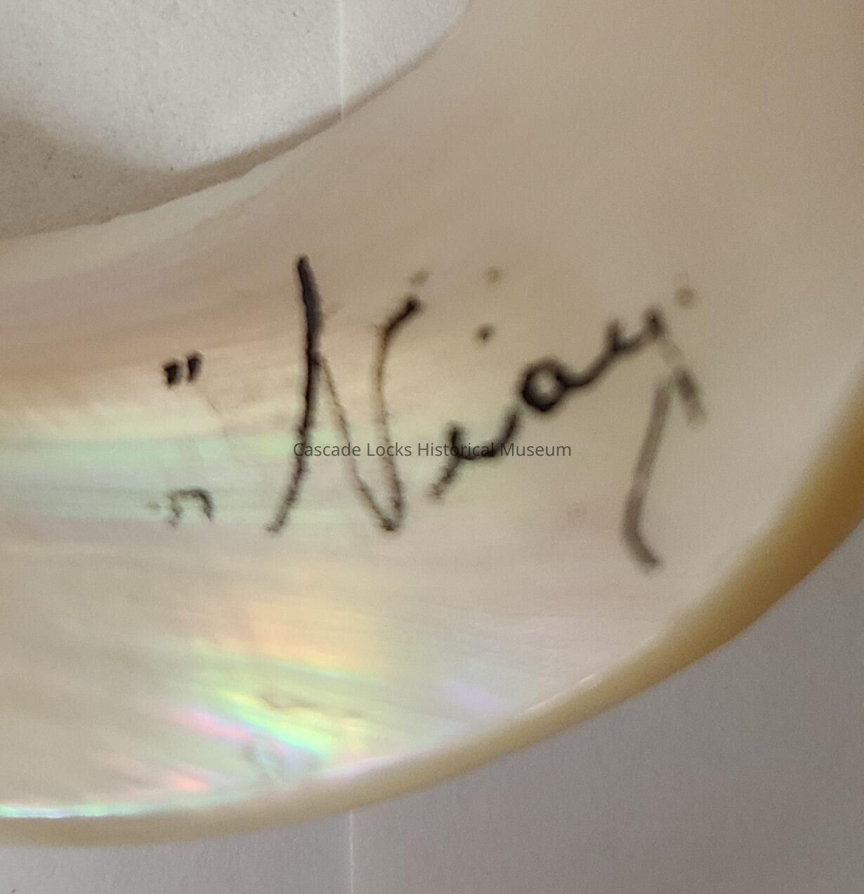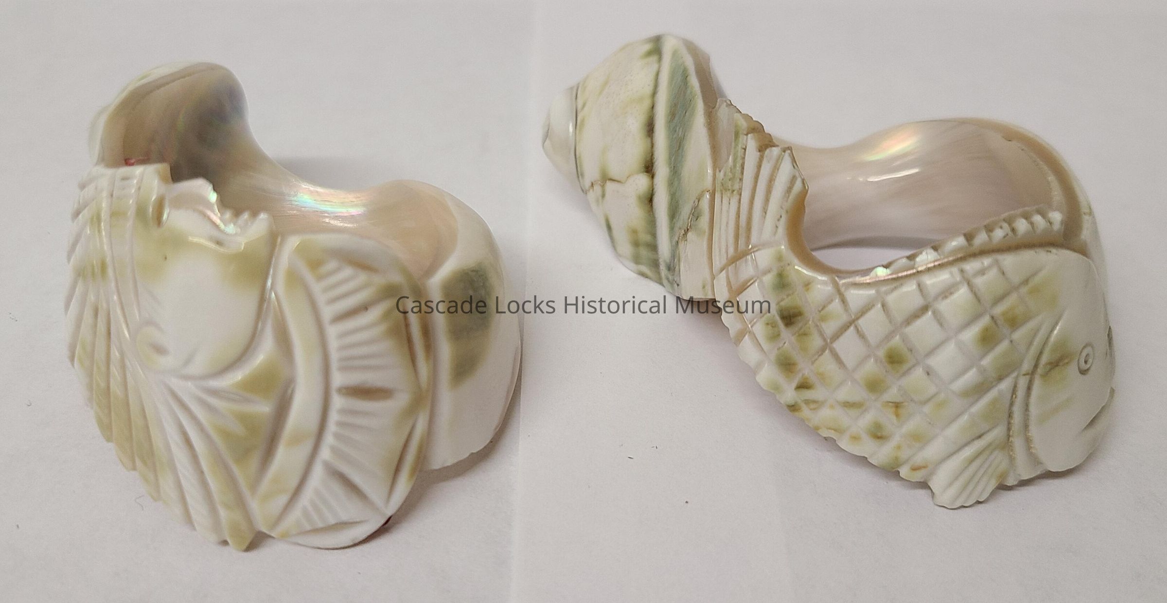 Napkin rings carved out of shells. One napkin ring carved into a Native American head (A) and the other one carved into a fish (B).Shells are spiral with green and white outer surface and mother of pearl looking interior. Inside napkin ring A there is a marking that appears to be a makers mark, with possibly japanese writing characters and the name Niay.