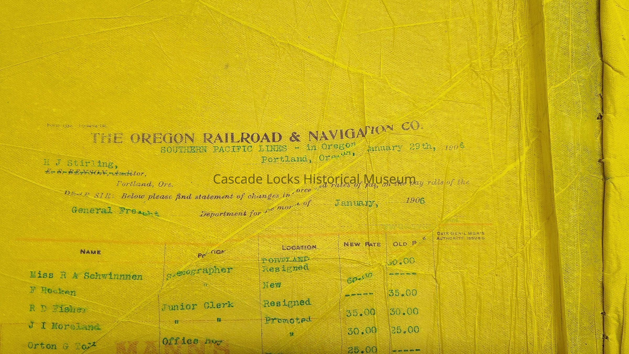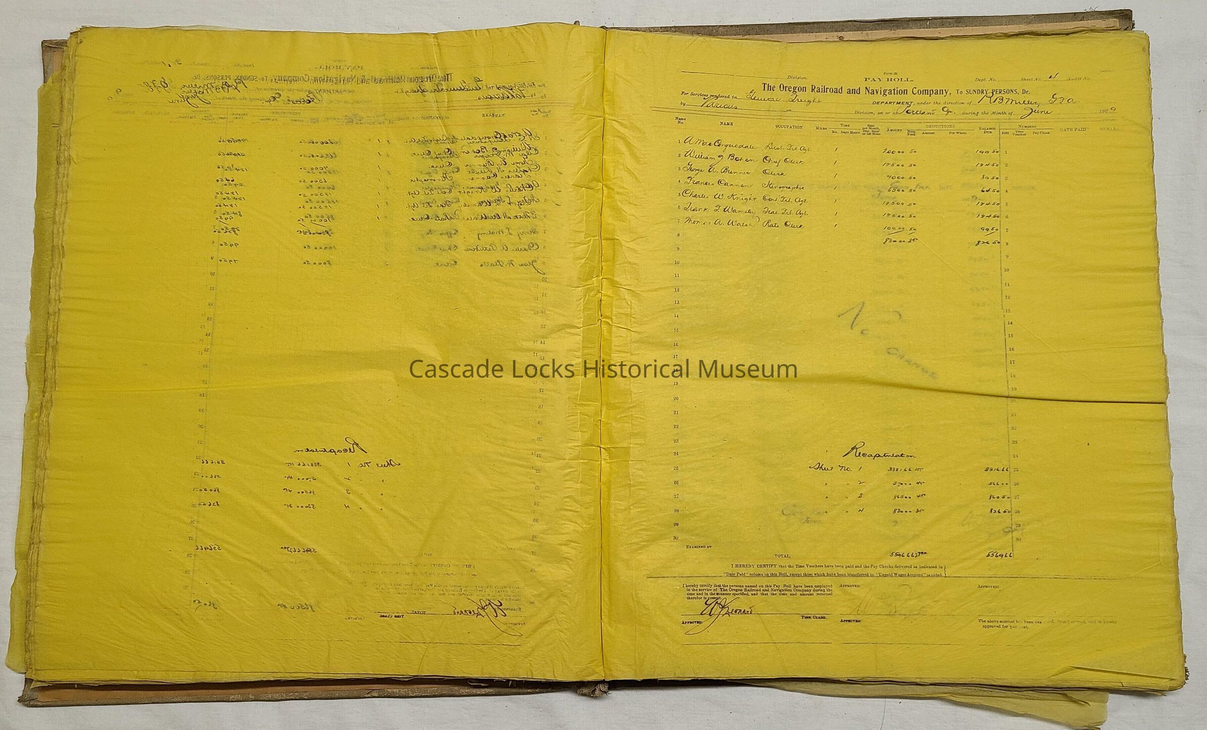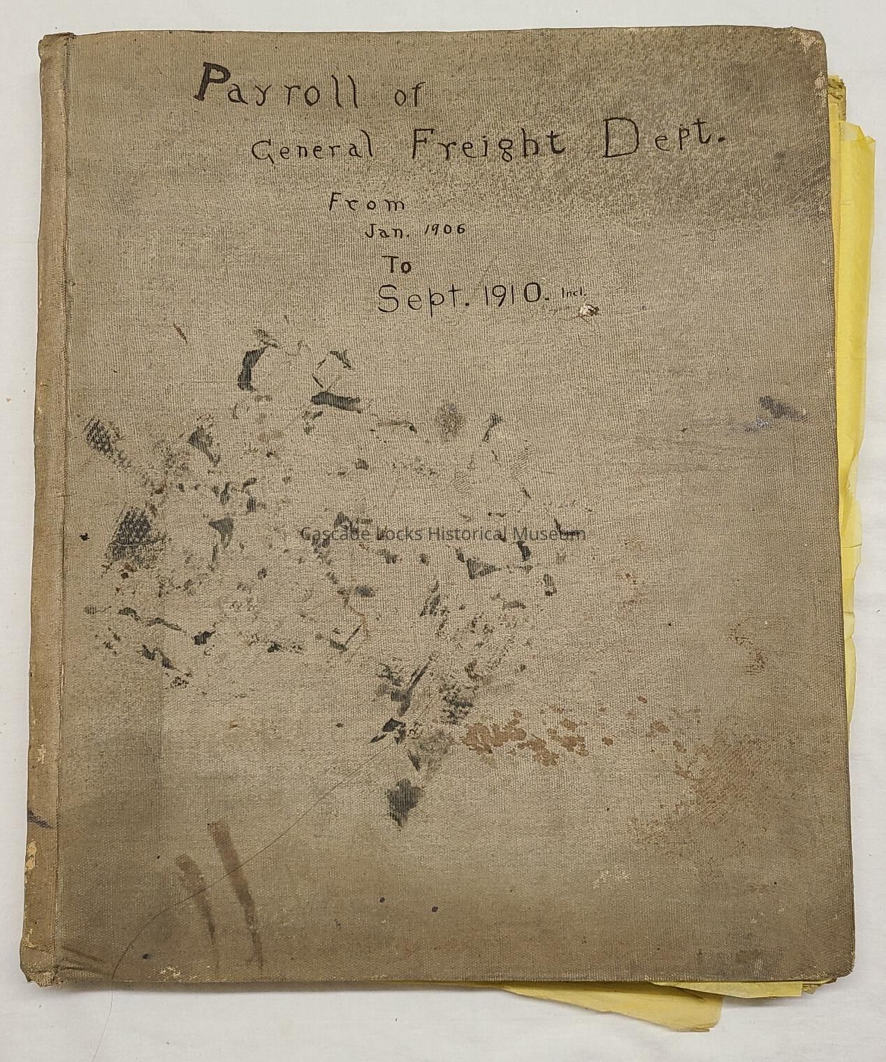 Oregon Railway and Navigation Company payroll ledger book from 1906-1910. Book is compressed paper hard cover wrapped in cloth with yellow onionskin paper. These books, set of 4, give detailed descriptions of who was paid money by the O.R. & N. Co., their amount of work done in days and payment per day, and the total payment made out to said individual.