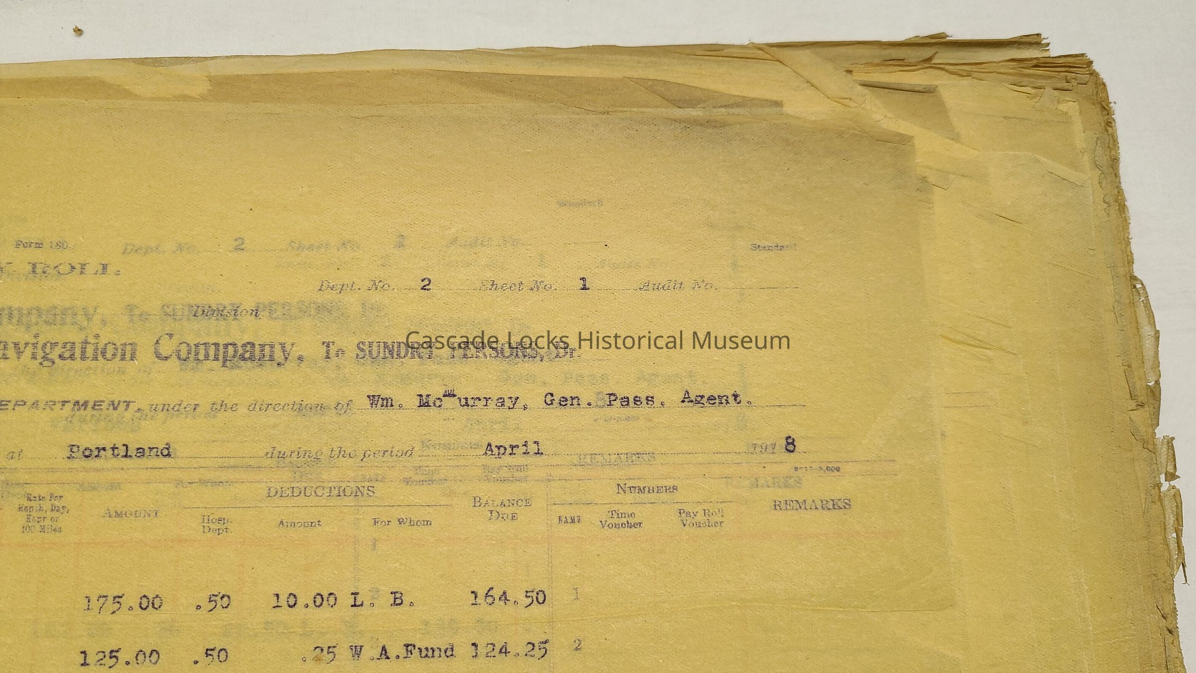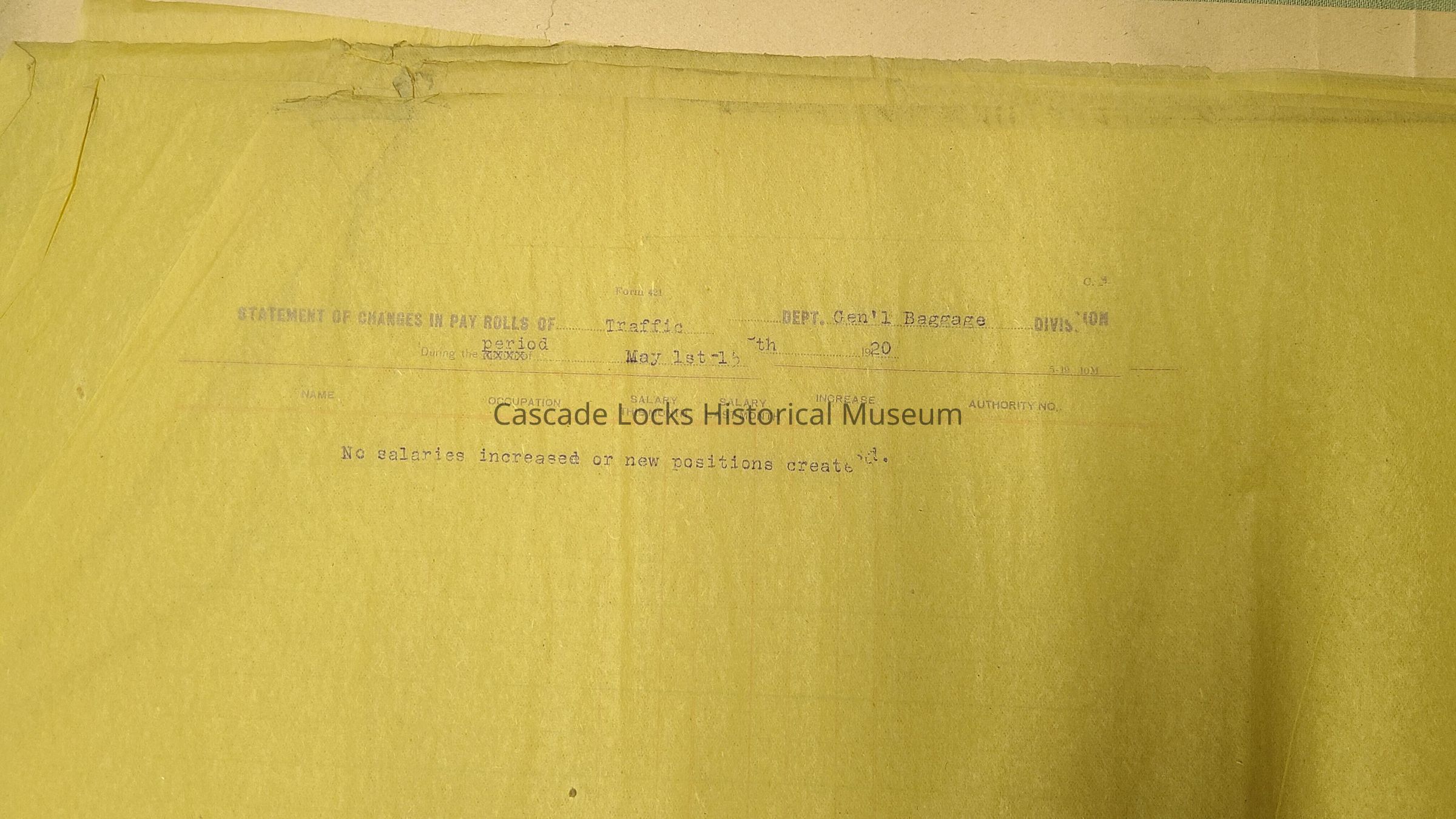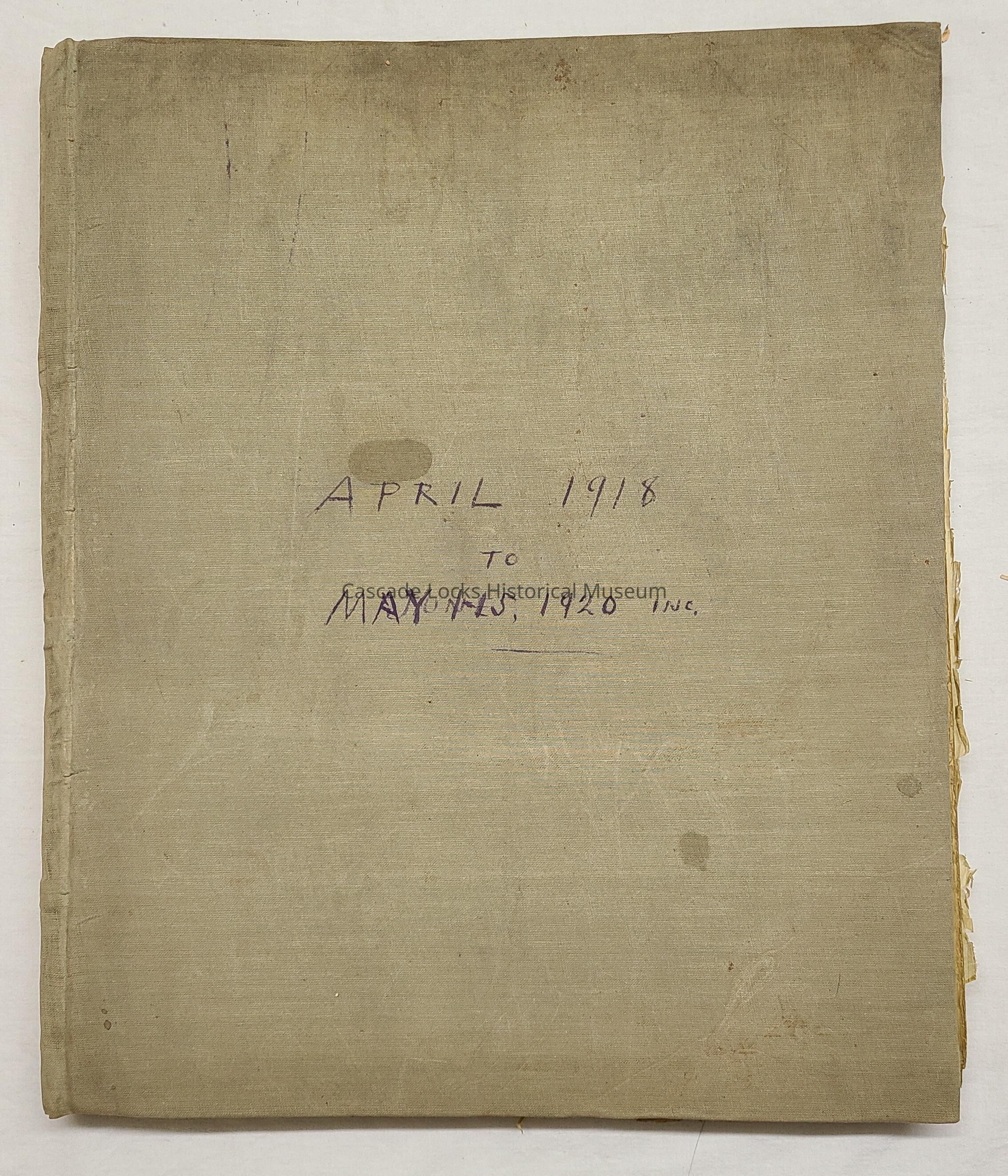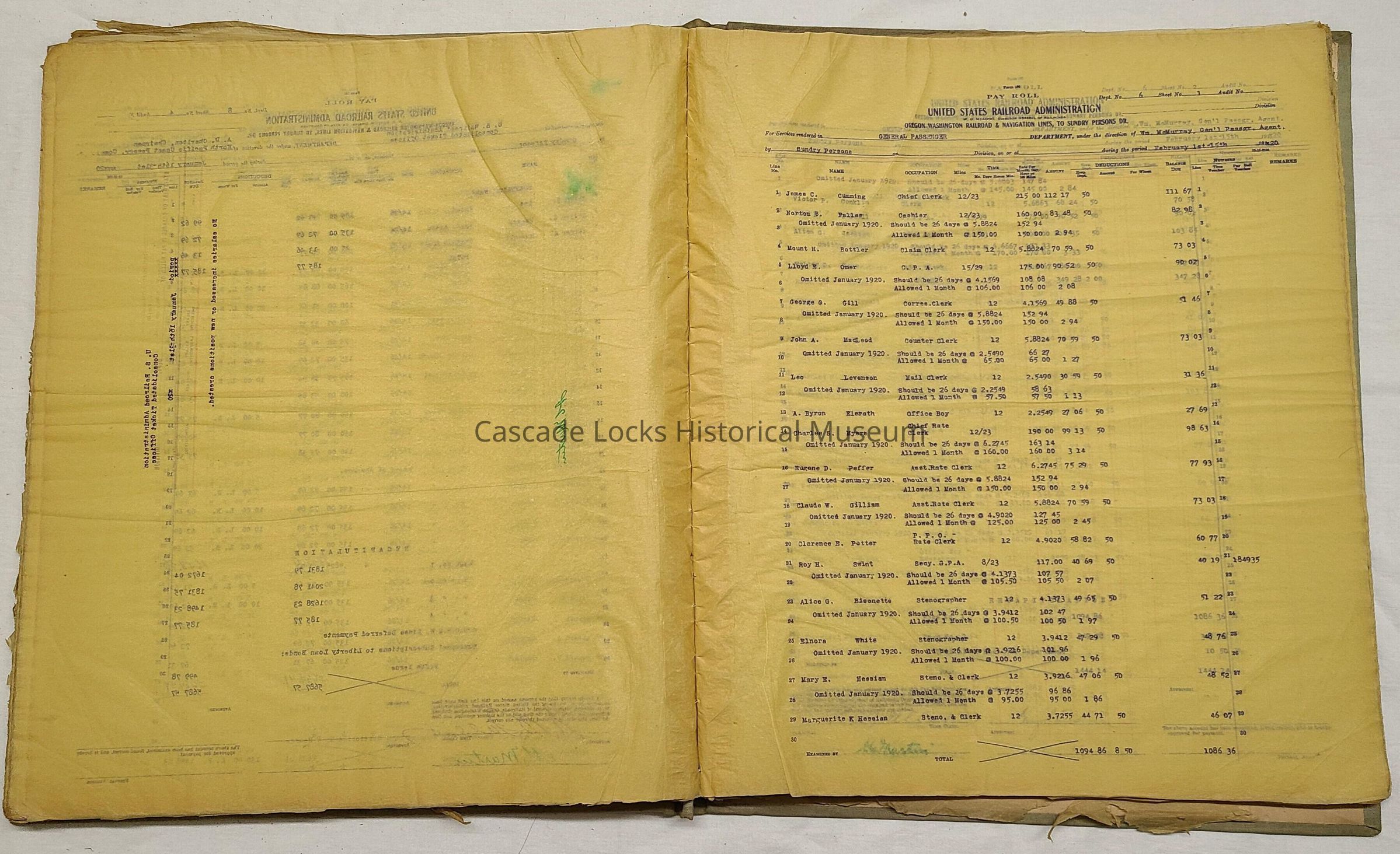 Oregon Railway and Navigation Company payroll ledger book from 1918-1920. Book is compressed paper hard cover wrapped in cloth with yellow onionskin paper. These books, set of 4, give detailed descriptions of who was paid money by the O.R. & N. Co., their amount of work done in days and payment per day, and the total payment made out to said individual.