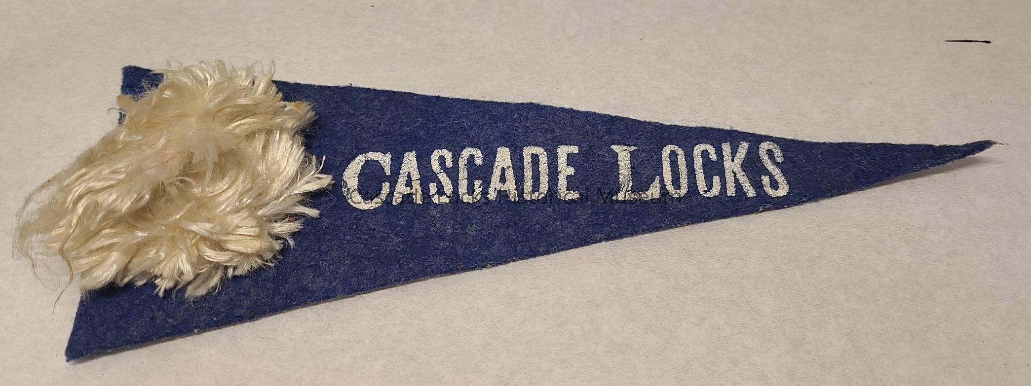 Pennant tapered flag. Flag is blue and white with white font and white pom. Pennant flag is small in size compared to the average size of a pennant.