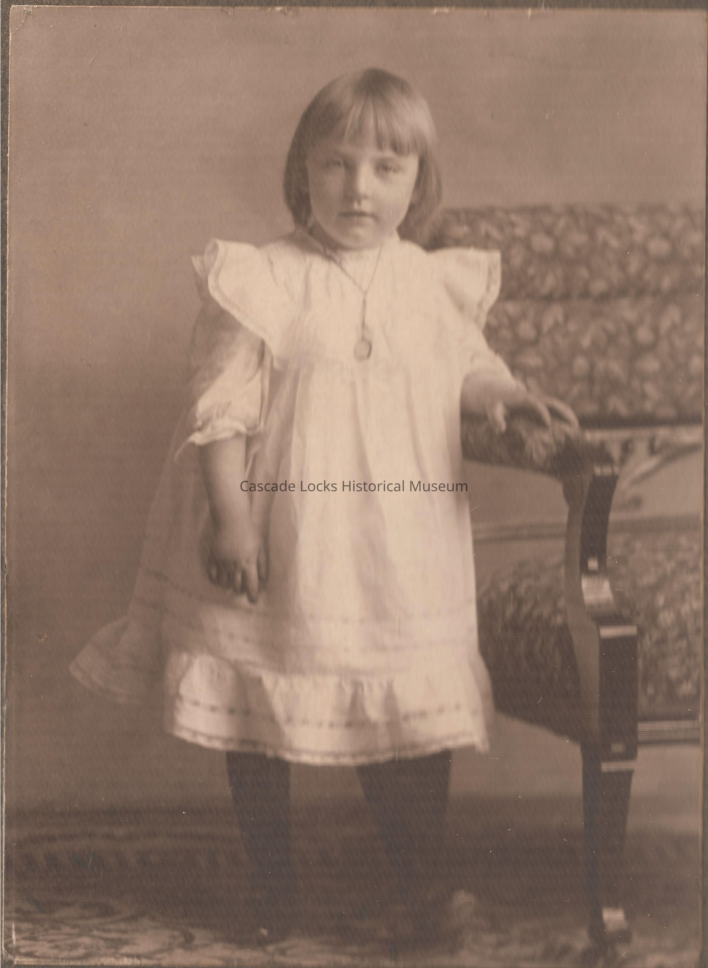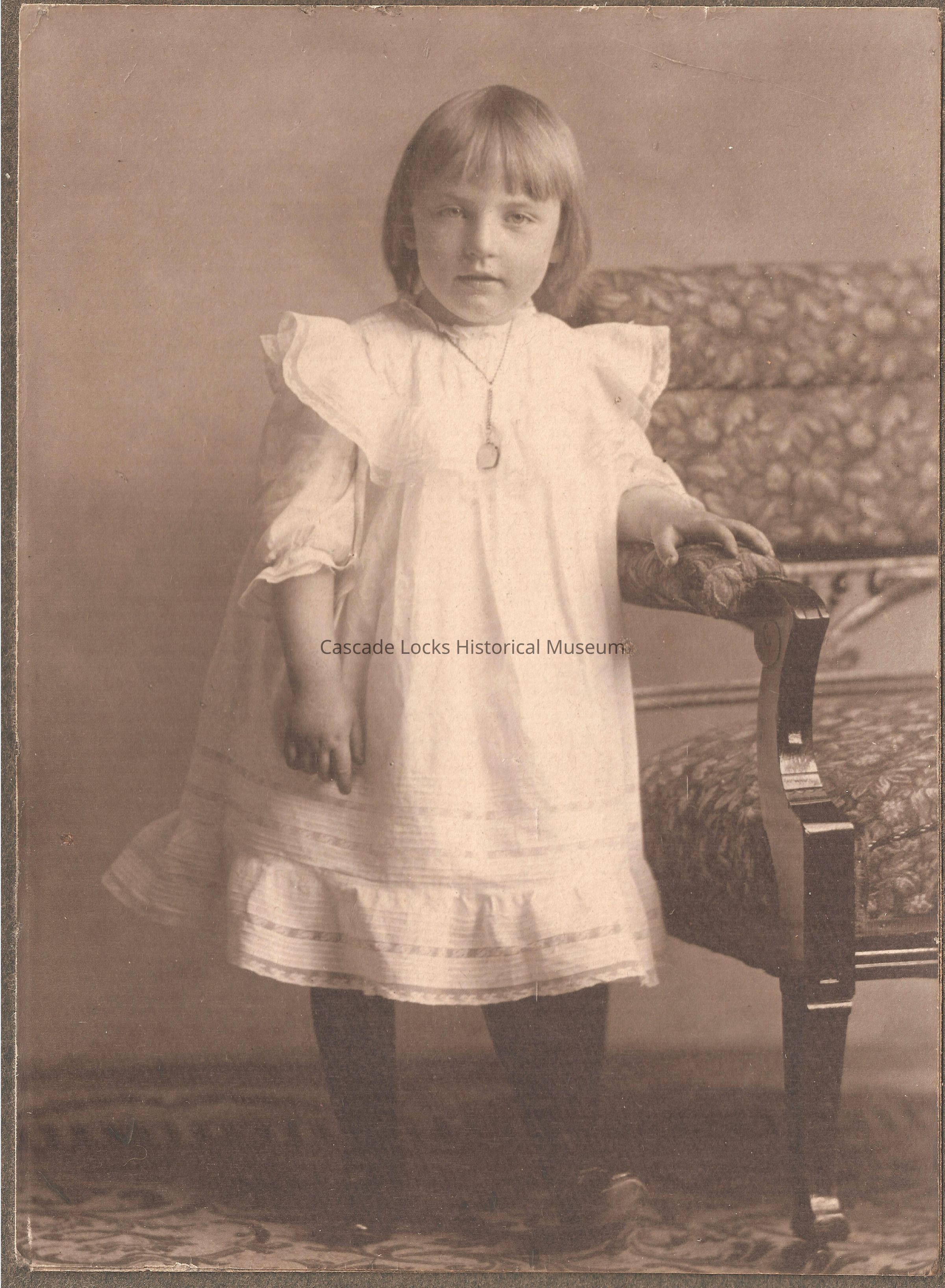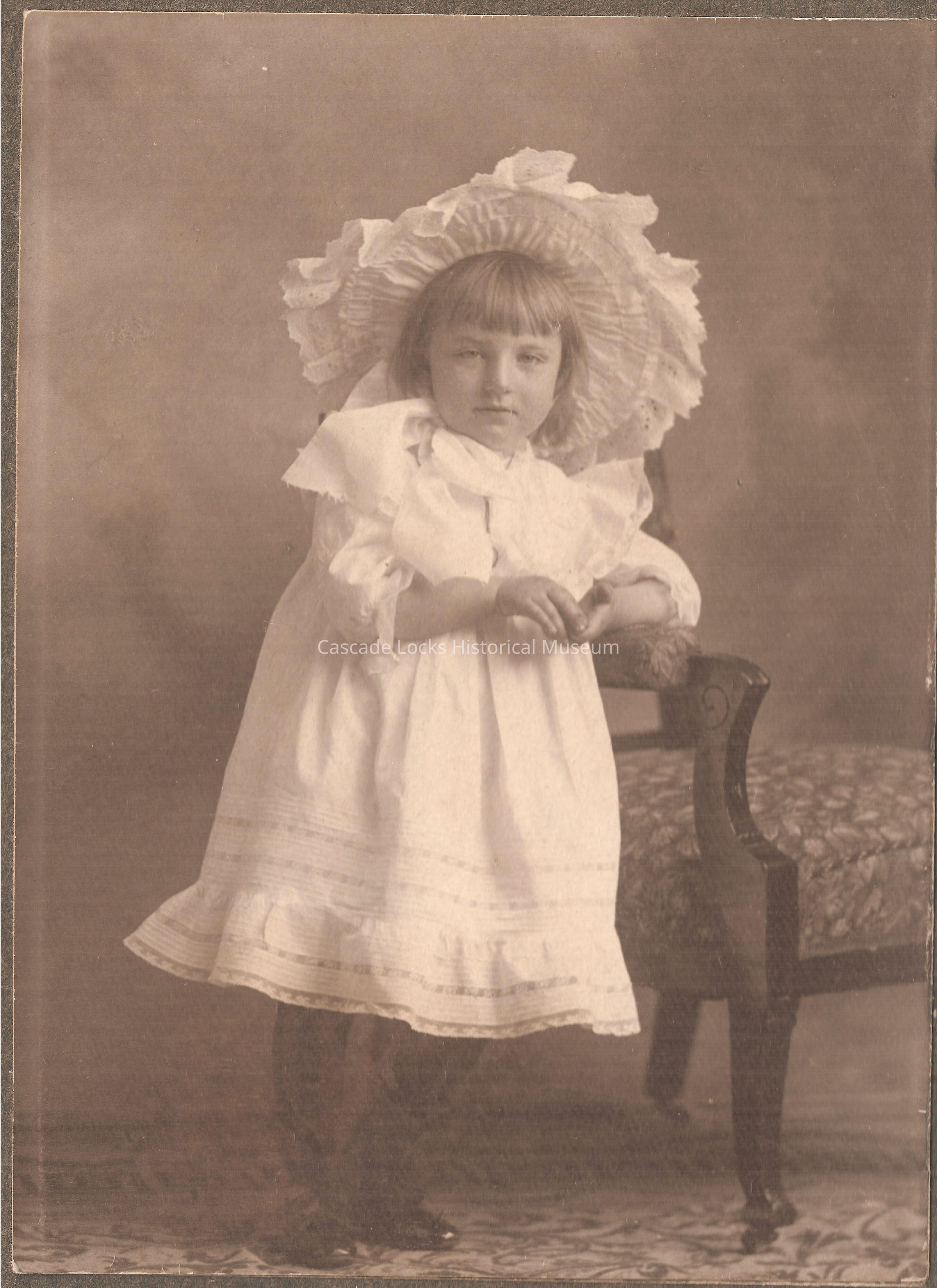 Photographic images of a young girl. There are three images mounted on one matting in a sequence. The first image is of a young girl clasping her hands together leaning on a chair with an expressionless facial expression. The second image is of a young girl clasping her hands together leaning on a chair with an expressionless facial expression wearing a large white hat. The last image is of the girl casually leaning with one arm n the chair smiling at the camera. Base of images is a glued strip of paper that says Marie.