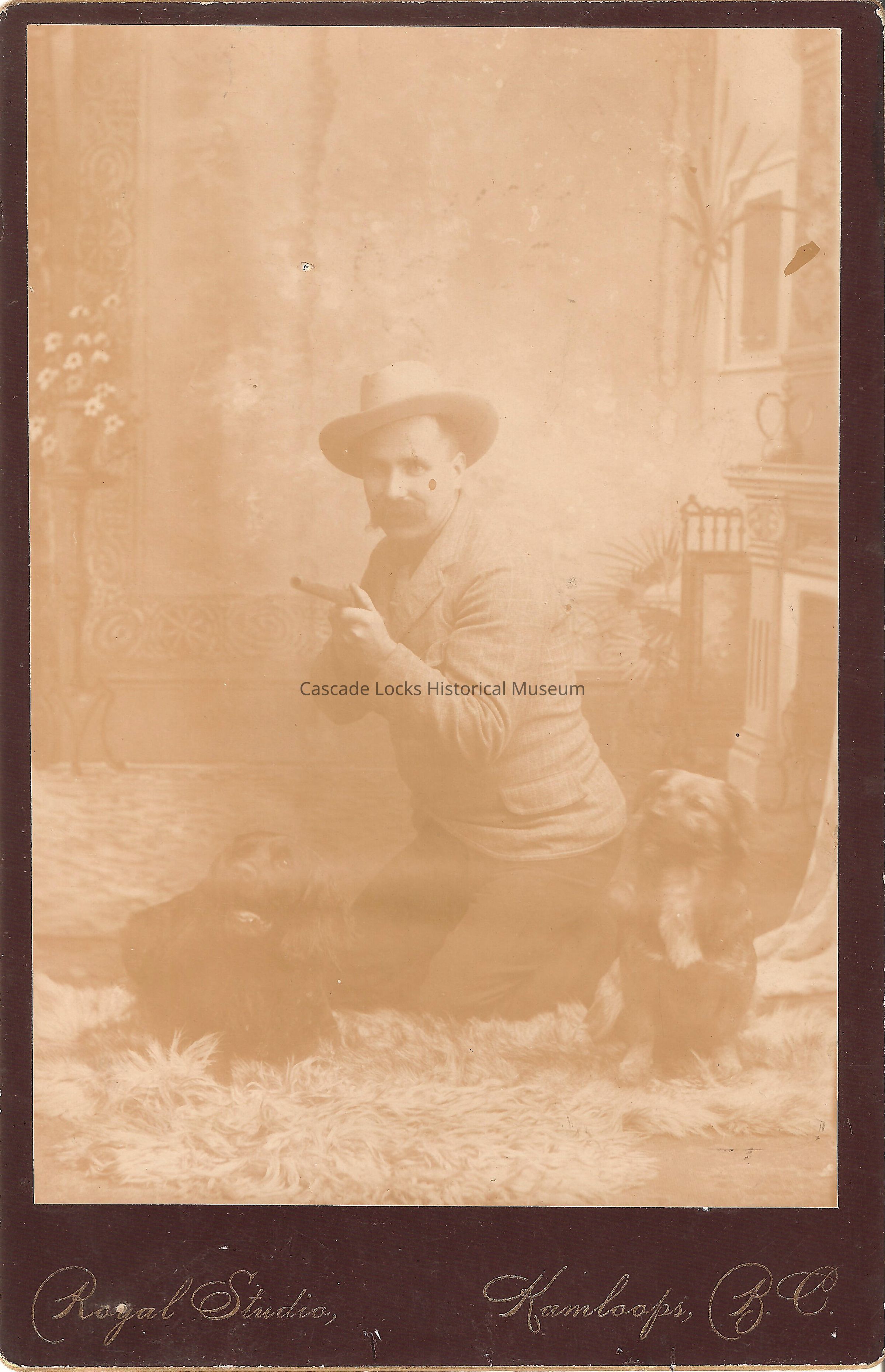 Photo portrait of Alex Watt, a man wearing a hat and over coat wielding a gun in a home living space (photography background) in a kneeling pose on what appears to be a fur rug accompanied by two small dogs. Image is in black and white. Image is on brownish-red cabinet card with gold font. Card reads: Royal Studio, Kamloops, B. C. Previously located in photo album 2020.1.19 photo slot 27.