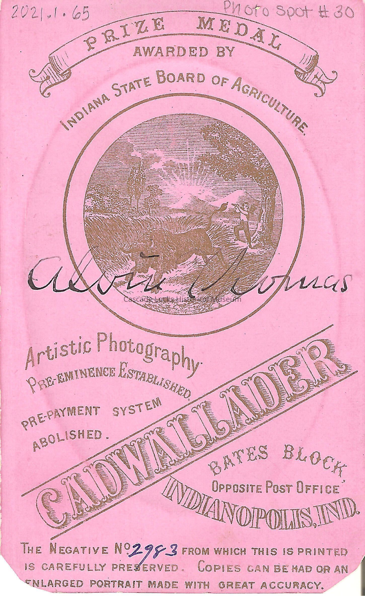 Photo portrait of Aluis Thomas. Image is in black and white of a man in a suit and bow tie. Man has short dark hair with side burns and a mustache. Image is on pink cabinet card or card has turned pink with age. Back of card reads: Aluis Thomas (written in ink). Prize Medal awarded by Indiana State Board of Agriculture. Artistic Photography. pre-eminence Established. Pre-payment system abolished. Cadwallader. Bates Block, opposite Post Office, Indianapolis, Ind. The negative No. 2983 (written in ink) from which this is printed is carefully preserved. Copies can be had or enlarged portrait made with great accuracy. Illustration on back of person shooting at a buffalo. Previously located in photo album 71.74.4 in spot number 30 donated by Margret Johnson.