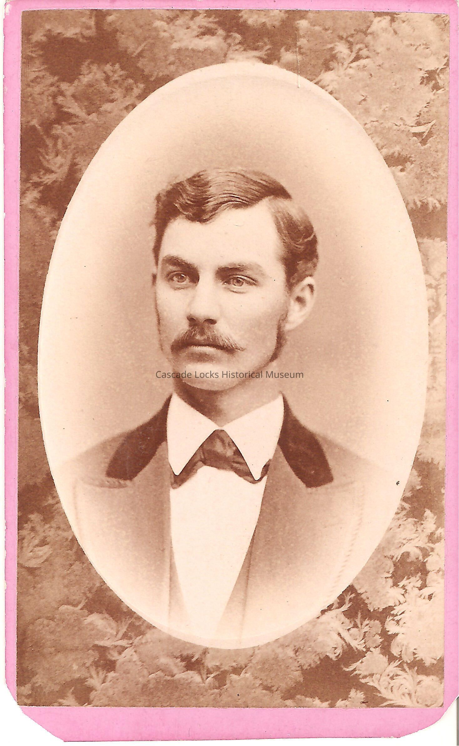 Photo black, white, tan, off-white. Cabinet card is pink with gold font.