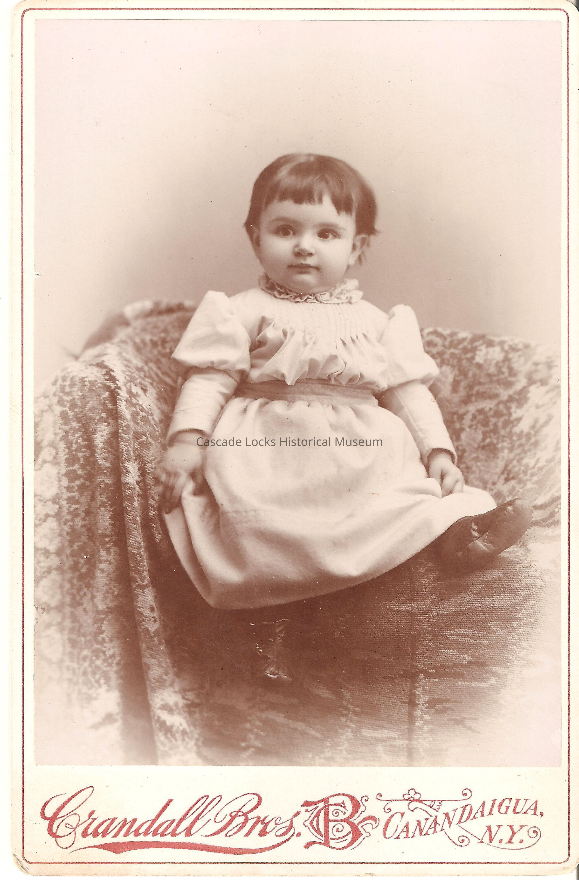 Photo portrait of an infant with medium dark hair wearing an ankle length white/light dress fitted around the mid-section with pleated chest and dark shoes. Image is in black and white. Image is on white cabinet card. Card reads: Crandall Bros. Canandaiqua, N. Y. Previously located in photo album 2020.1.17.