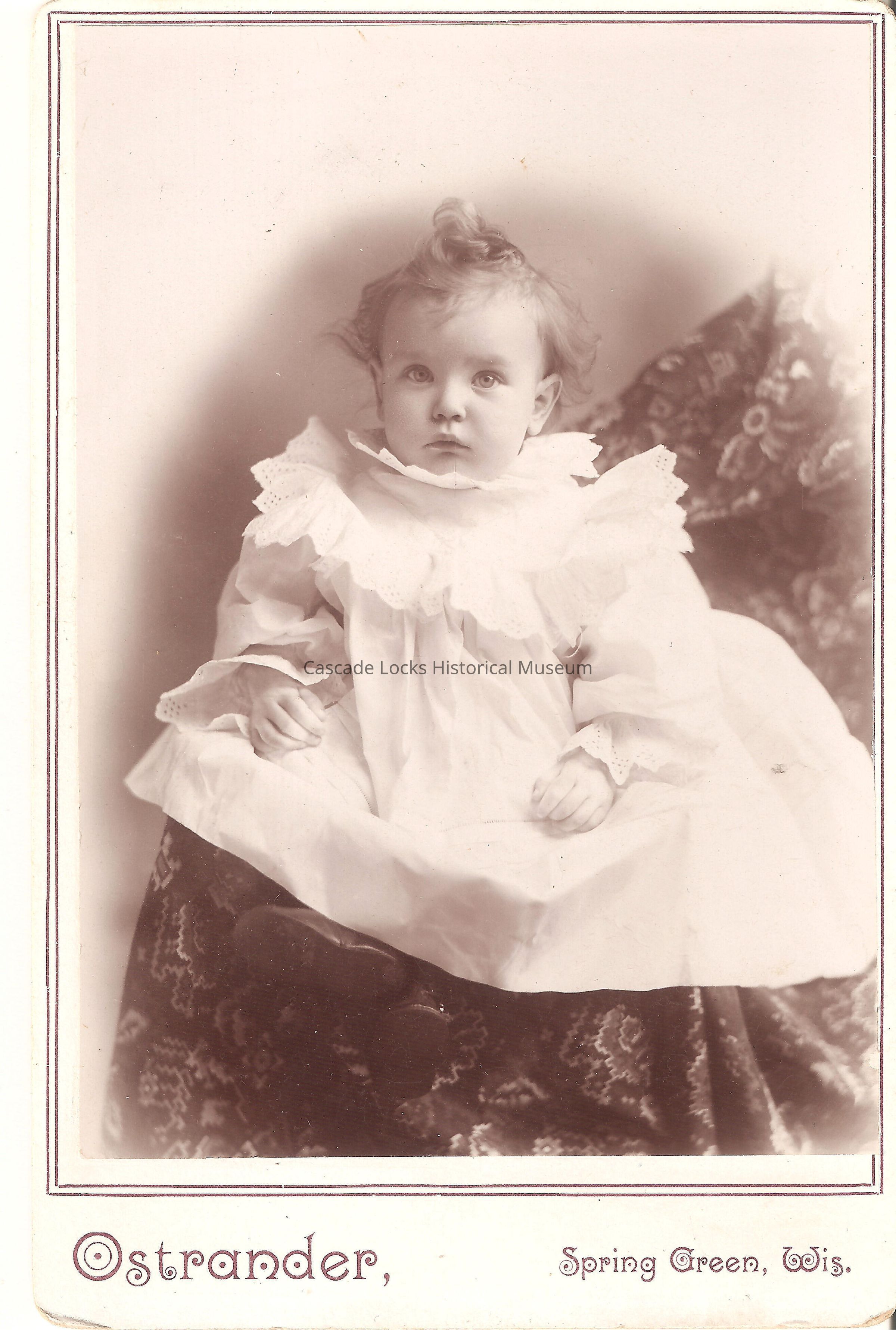 Photo portrait of an infant with medium dark hair wearing an ankle length white/light dress with dark shoes. Image is in black and white. Image is on white cabinet card with maroon boarder and font. Card reads: Ostrander, Spring Green, Wis. Previously located in photo album 2020.1.17.