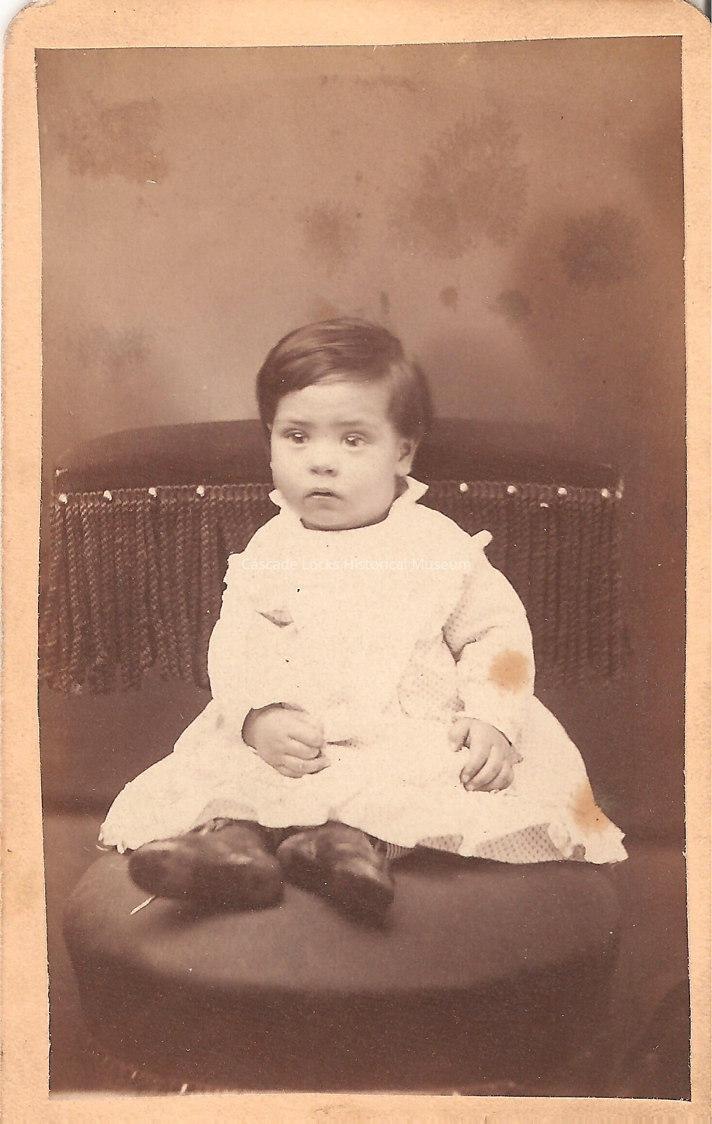 Photo portrait, baby photo, of dark haired infant in a light/white dress with dark shoes. Image is in black and white. Image is on of-white cabinet card. Previously located in photo album 2020.1.17