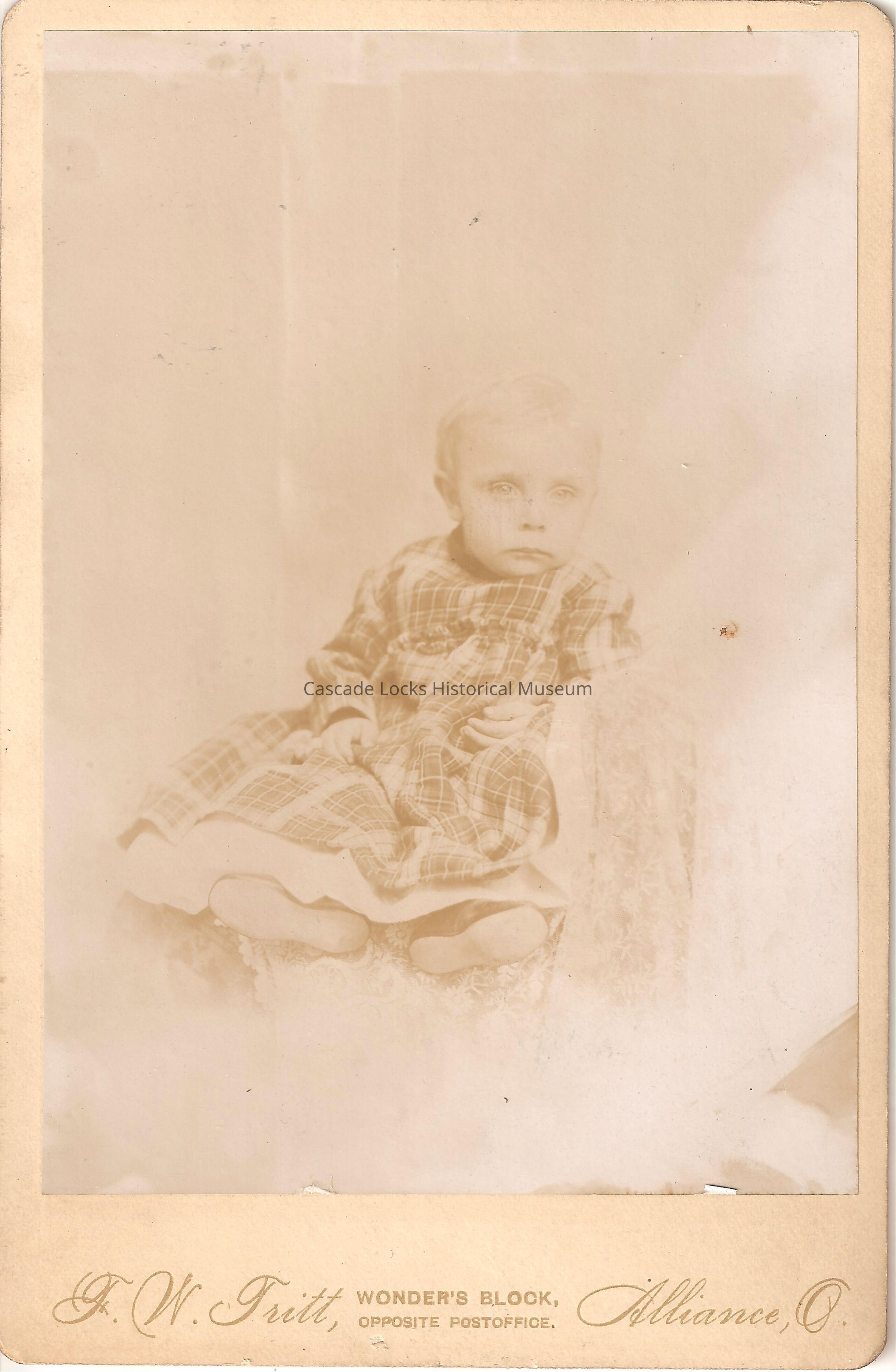 Photo portrait, baby photo, of an infant wearing a plaid dress. Image is in black and white. Image is on tan cabinet card with tan font. Card reads: F. W. Tritt, Wonder's Block, opposite post office. Alliance, O. Previously located in photo album 2020.1.17.