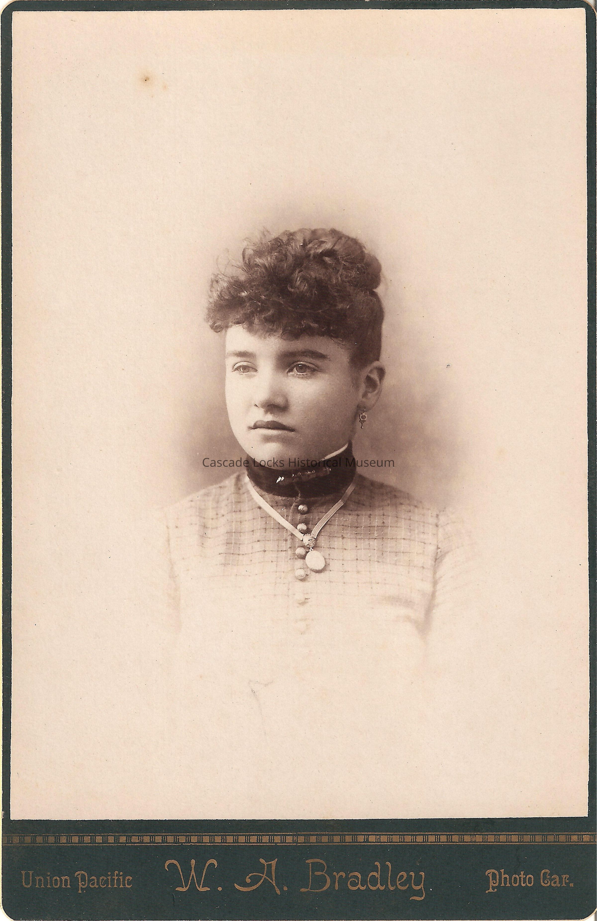 Photo portrait of Carry Boothet, a woman with dark hair wearing a plaid coat that buttons up the middle, with a necklace. Image is in black and white. Image is on dark blue cabinet card with gold font. Card reads: Union Pacific, Photo Car. W. A. Bradley. Previously located in photo album 2020.1.19 photo slot 7.