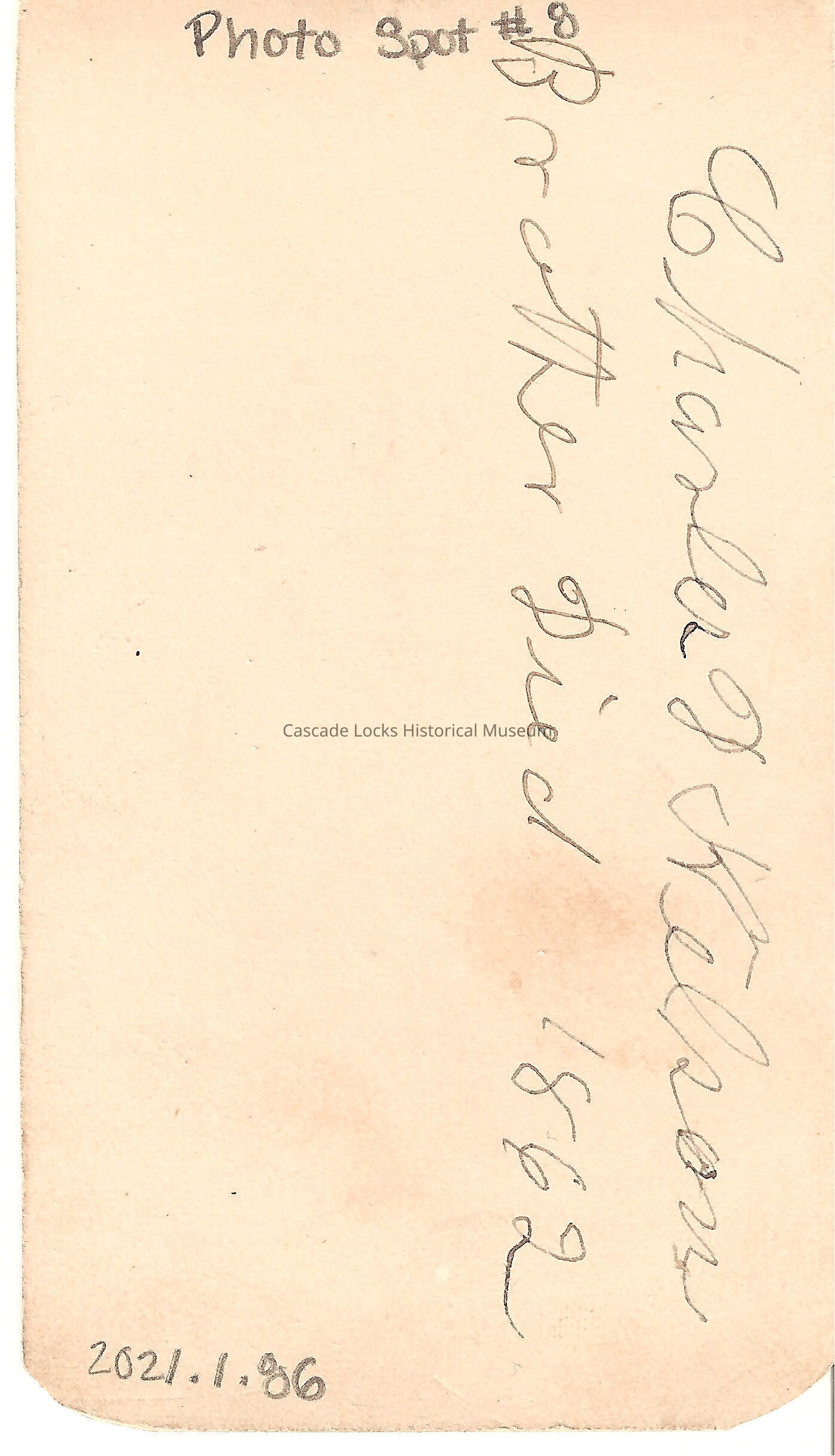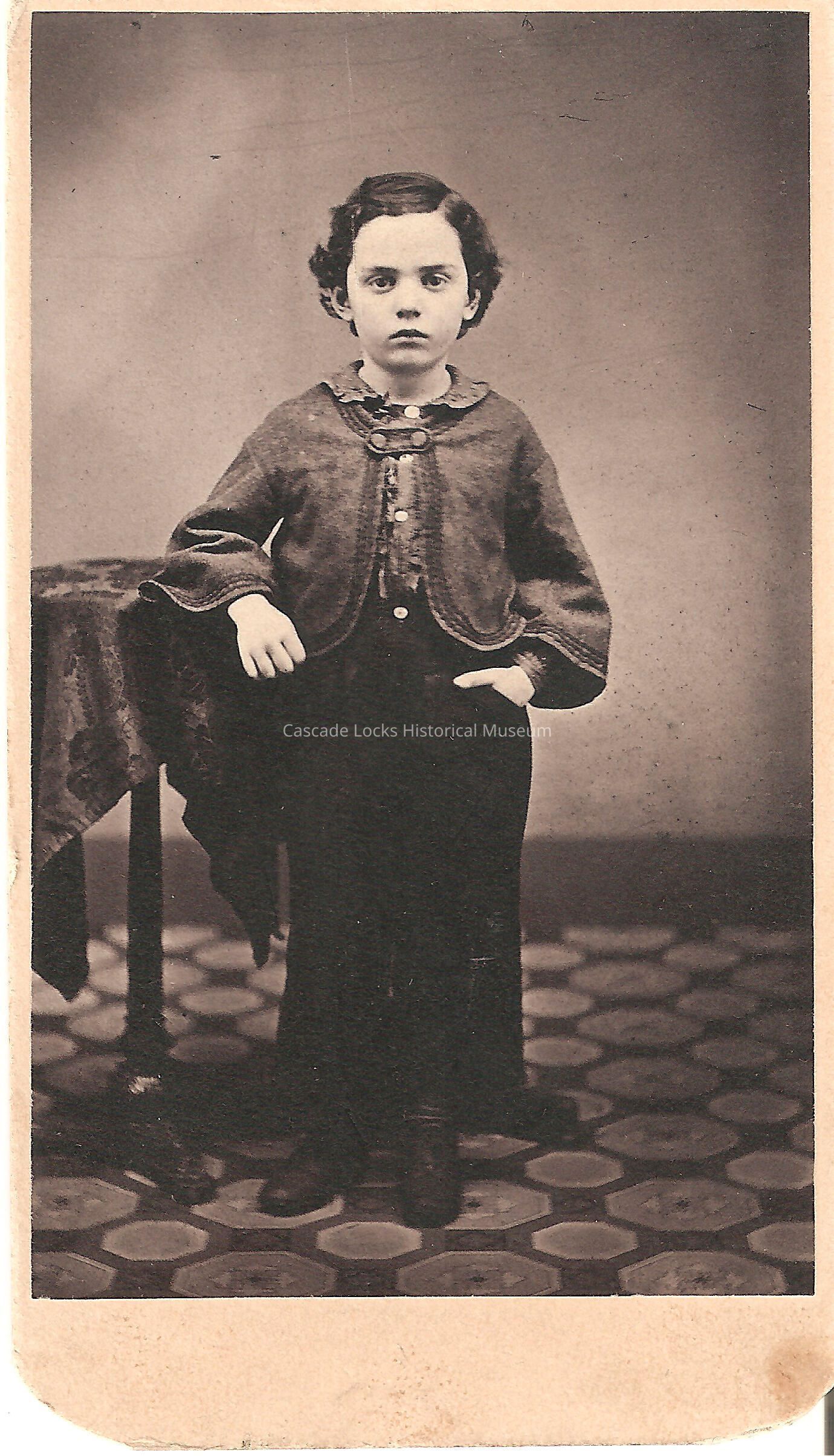 Photo portrait of Charles D. Nelson. The image is in black and white of a young boy with dark hair wearing a short cloak coat that fastens at the neck. Photo is on a white cabinet card. Back of card reads: Charles D. Nelson, Brother, 4 Year, Died 1862. Previously located in photo album 71.74.4 in spot number 8 donated by Margret Johnson