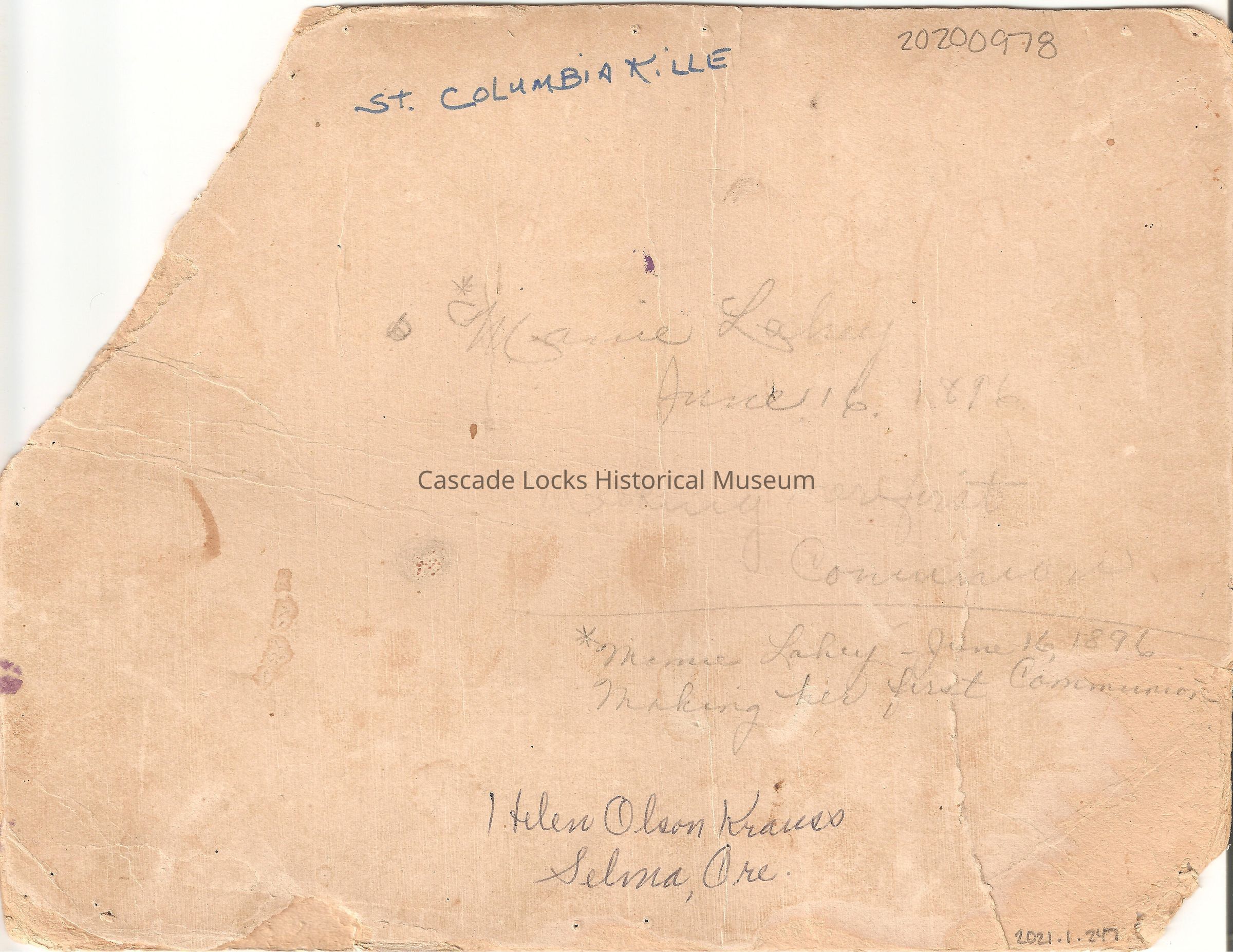 Back of card reads; St. Columbia Kille. Mamie Lahey, June 16, 1896, making her first communion. Helen Olson Krause, Selma, Ore. - believed to be donor information.Made/Created