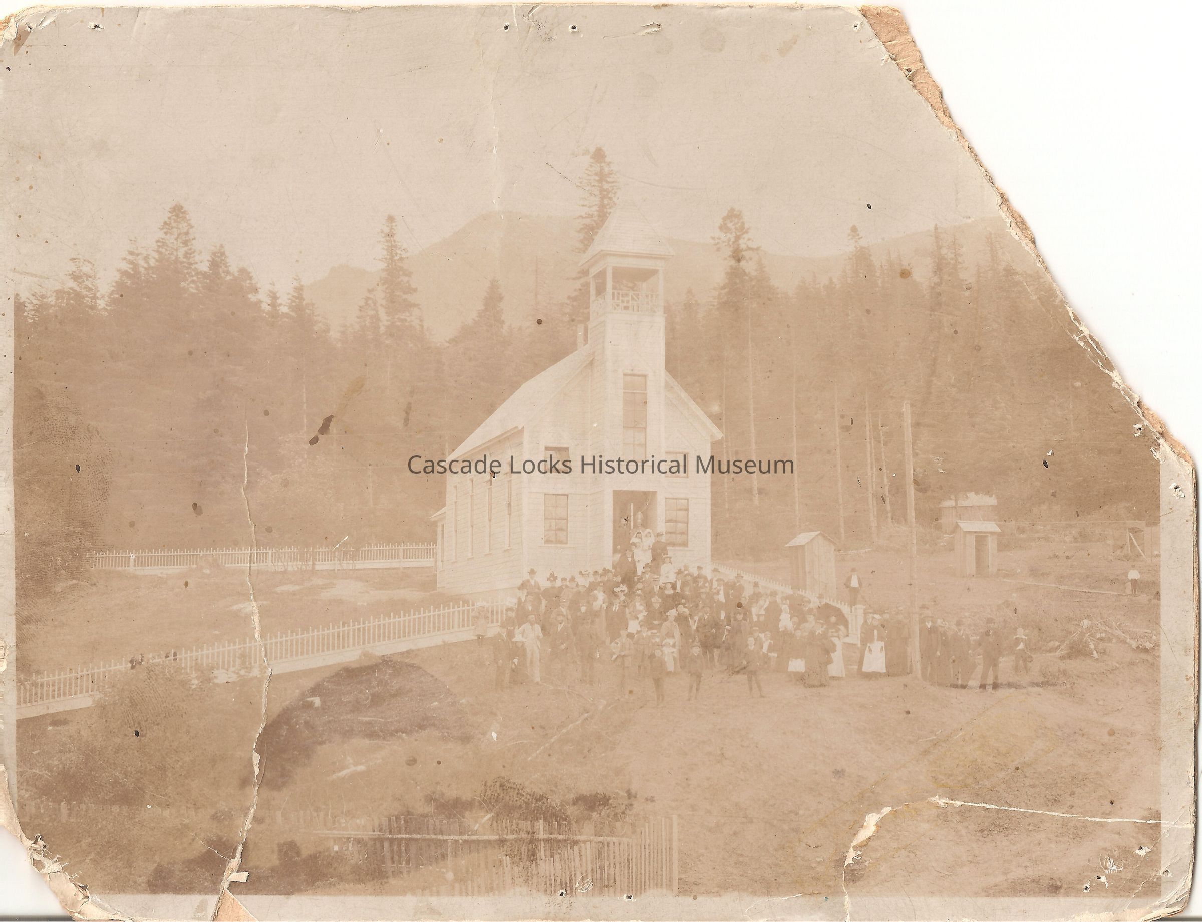Photograph of a group of people roughly 100 individuals outside a church building. Image is taken as a panoramic shot with the landscape and church in the background width the group standing outside the church and church steps. Individuals are dressed i their finest clothing. Two women in the doorway are dressed in white gowns and veils, and there is a man behind them dressed in religious robes and a tall hat worn by Roman Catholics Priests.