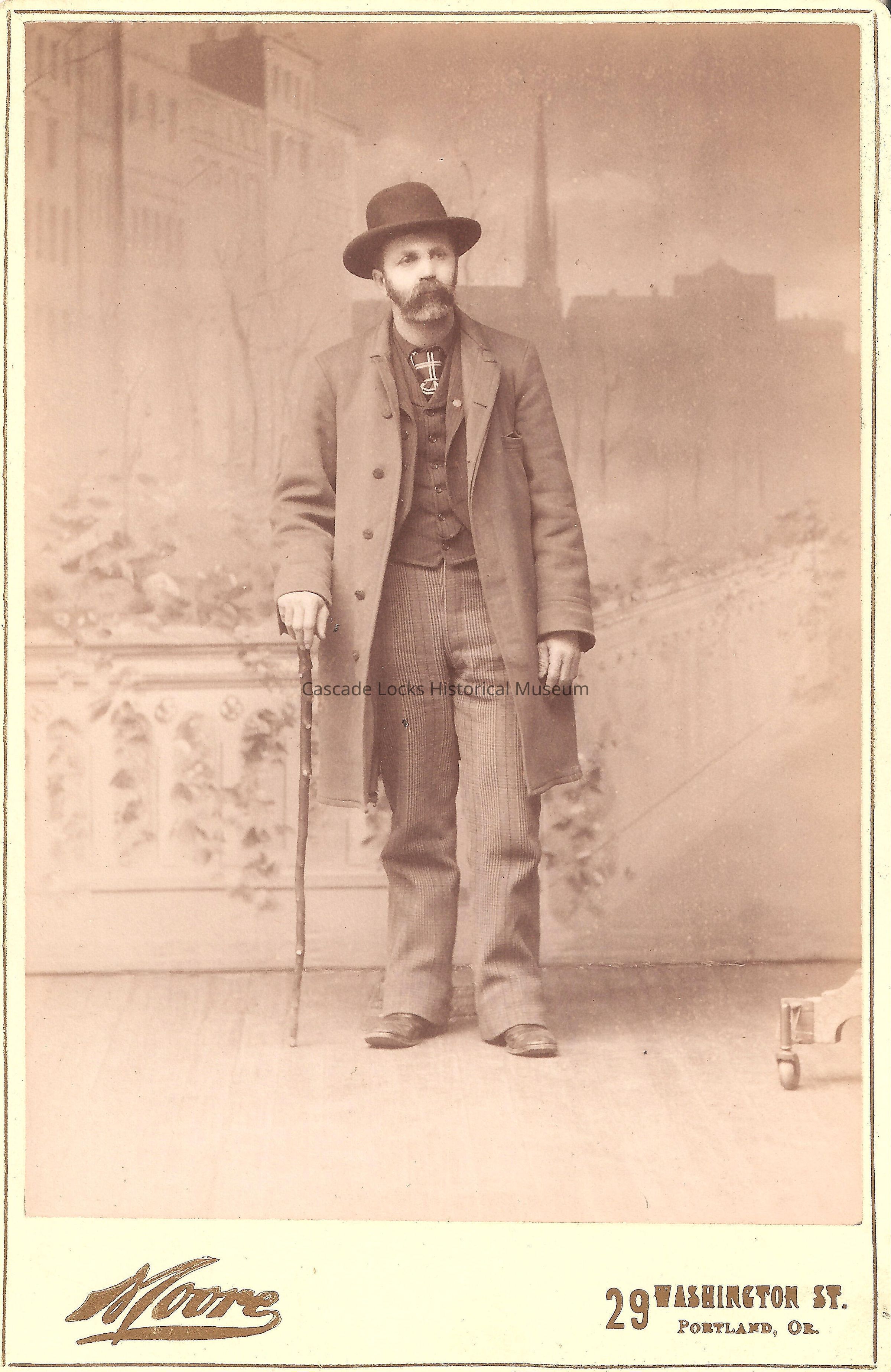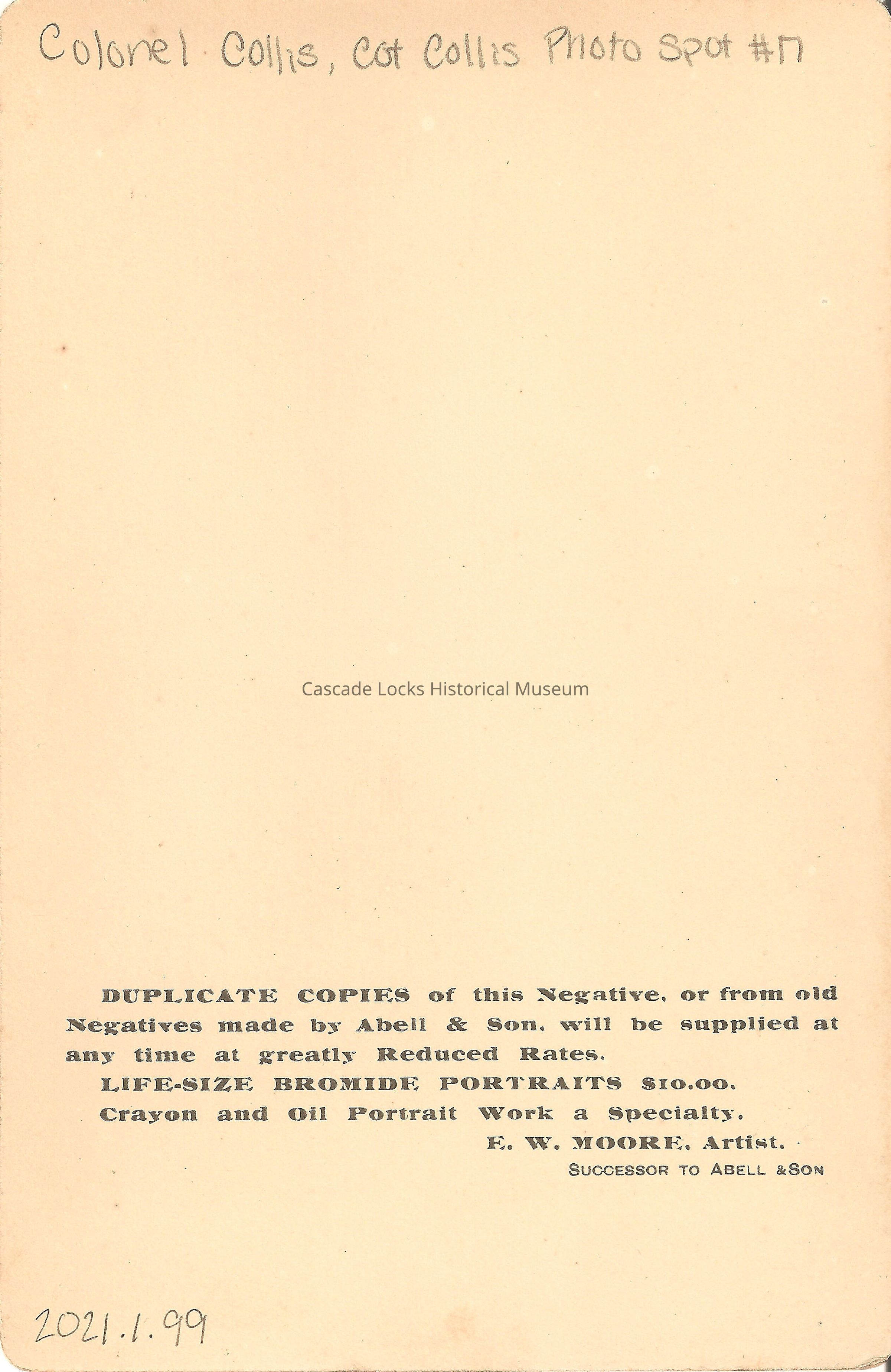 Photo portrait Colonel Collis, a man with dark hair and a dark greying beard wearing a suit with four part suit with hat and using a wooden cane. Image is in black and white. Image is on off-white cabinet card with gold boarder. Card reads: Moore 29 Washington St. Portland, Or. Back of card reads: Duplicate copies of this negative or from old negatives made by Abell & Son, will be supplied at any time at greatly reduced rates. Life-Sized bromide portraits $10.00, crayon and oil portrait work a specialty. E. W. Moore, Artist. Successor to Abell & Son. Previously located in photo album 2020.1.19 photo slot 17.