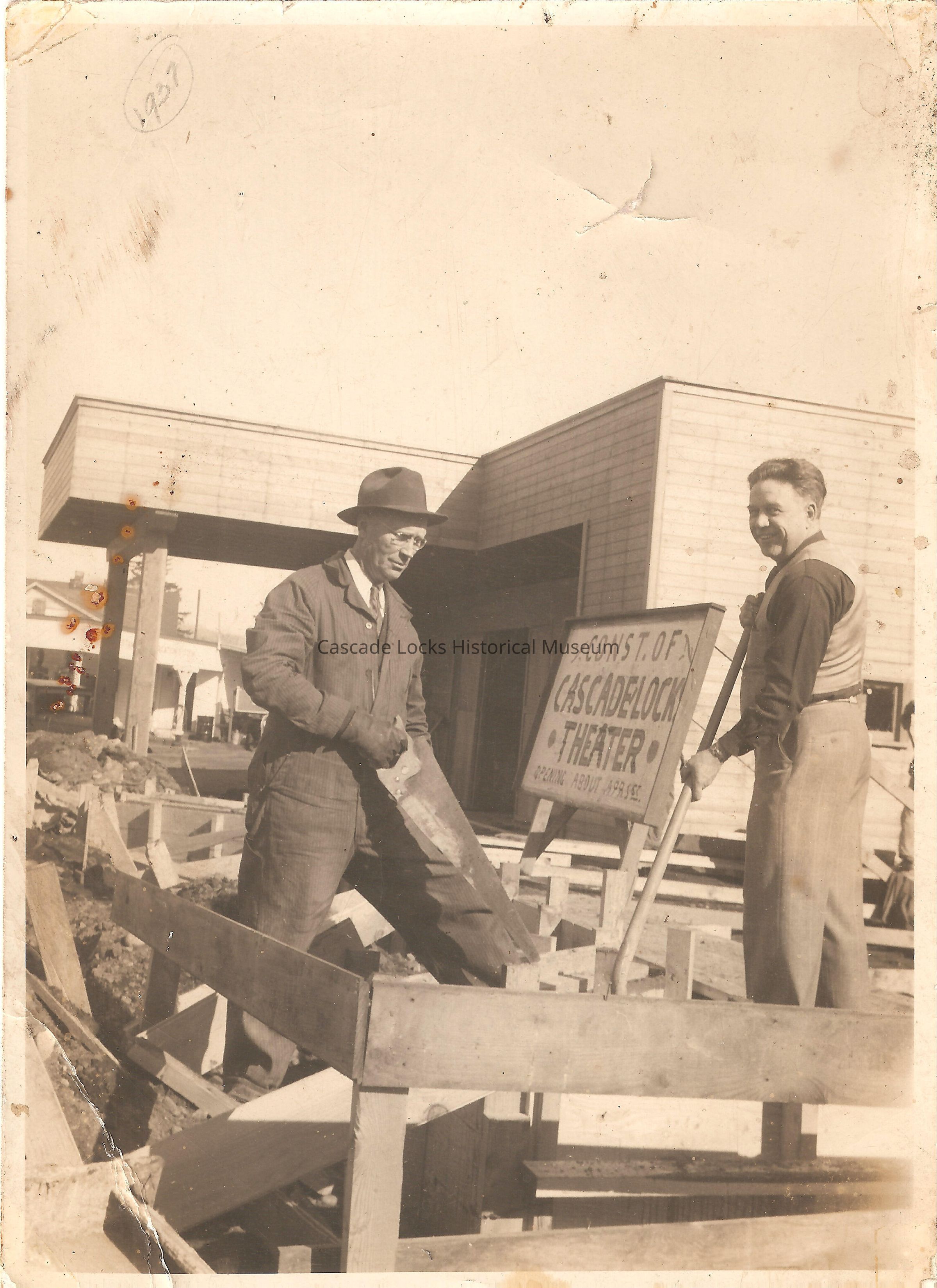 Photographic image of two male individuals working on he construction of the Cascade Locks Theater. The first man on the left is wearing a suit and tie with coveralls over his suit and a top hat. The second man is wearing a suit vest, long sleeve shirt, and slacks. Sign visible in the image states, "CONST. OF CASCADE LOCKS THEATER OPENING ABOUT APR 1St." Top left corner says 1937 in pencil.