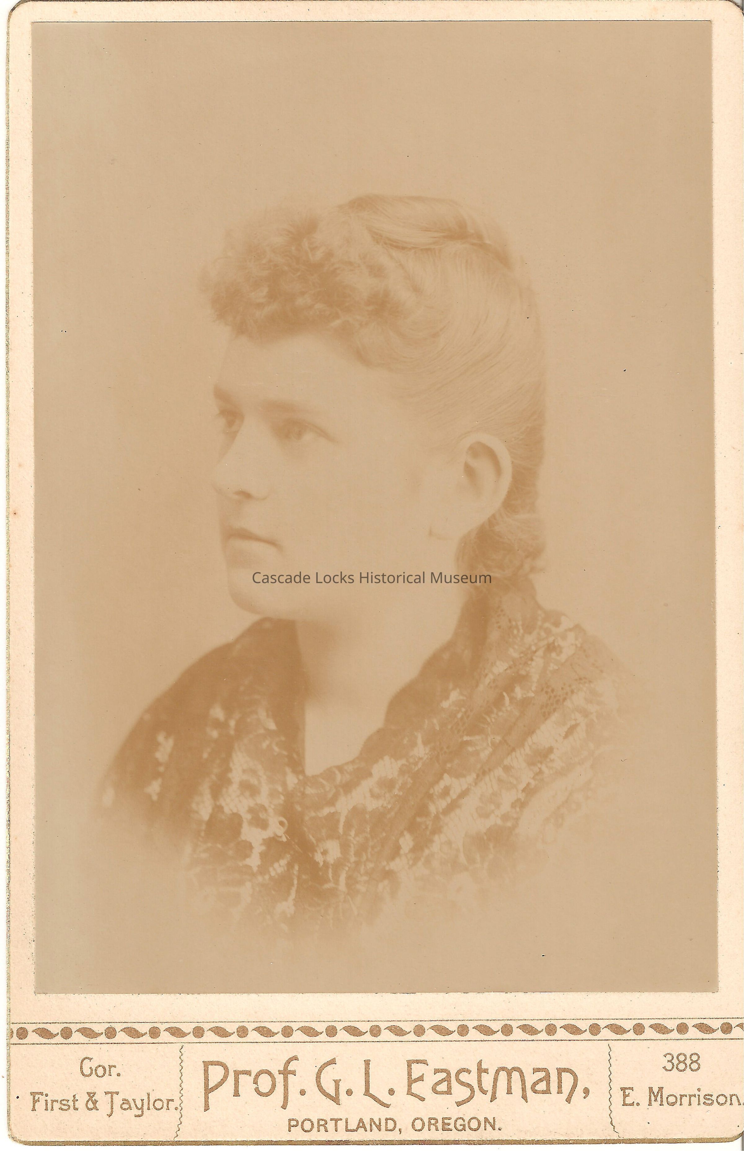 Photo portrait of a young woman with hair pulled back into a beehive style with fluffed front bangs wearing a patterned top of white covered in black lace. Image is in black and white. Image is on white cabinet card with gold font and edging. Card reads: Cor. first 7 Taylor. Prof. G. L. Eastman, Portland, Oregon. 388 E. Morrison. Previously located in photo album 2020.1.19 photo slot 24.