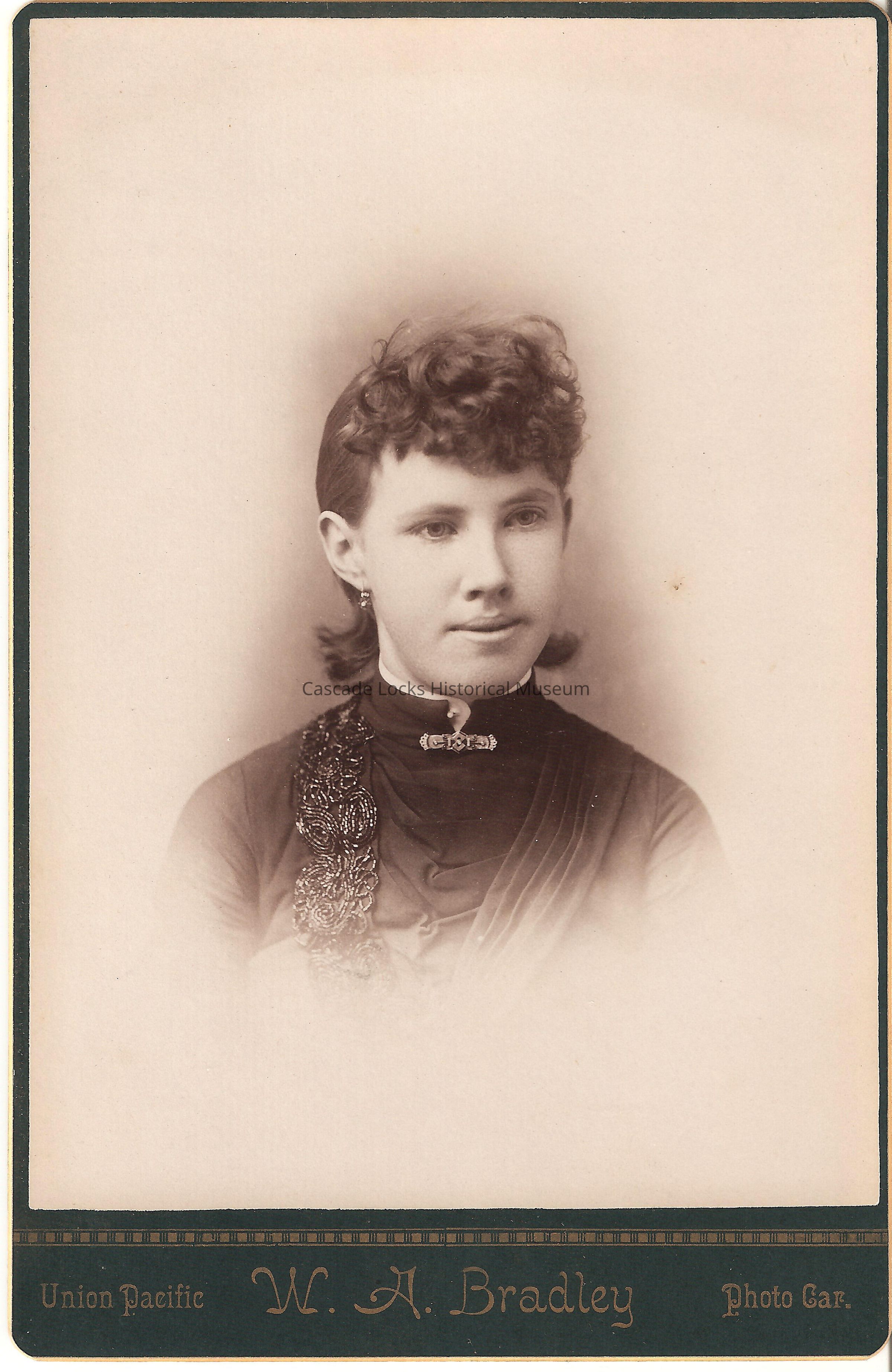 Photo portrait of Eva Larms, a young woman with dark hair wearing an overcoat with beaded embroidery, high neck collar with white men's collar under neither and large rectangular neck pin. Image is in black and white. Image is on dark blue/green cabinet card with gold font. Card reads: Union Pacific, Photo Car. W. A. Bradley Previously located in photo album 2020.1.19 photo slot 10.