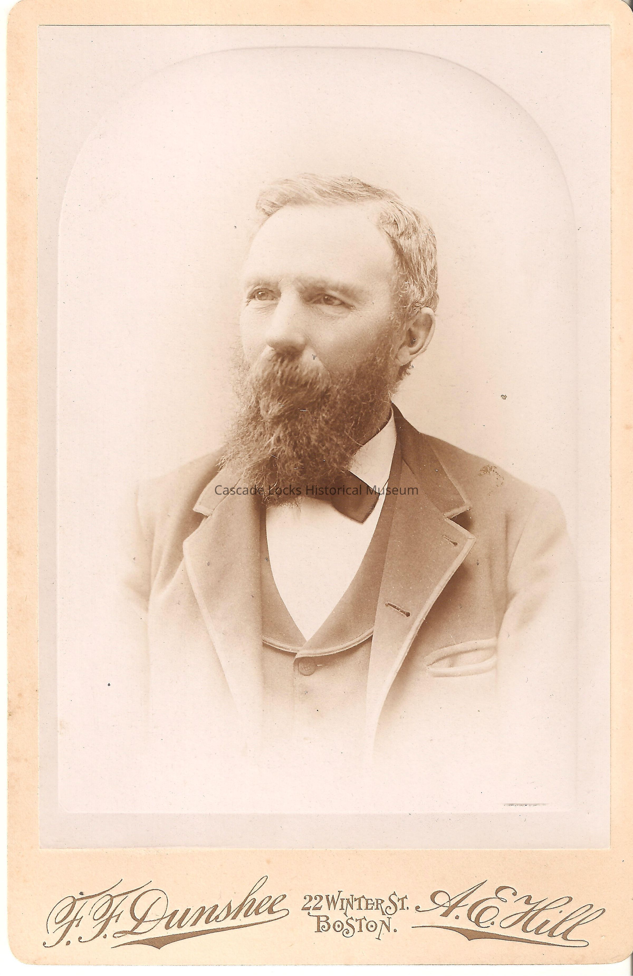 Photo portrait of a man with graying hair and beard wearing a suit with ribbon tie. Image is in black and white. Image is on white cabinet card with gold font. Card reads: F. F. Dunshee, A. E. Hill, 22 Winter St. Boston. Previously located in photo album 2020.1.19 photo slot 25.