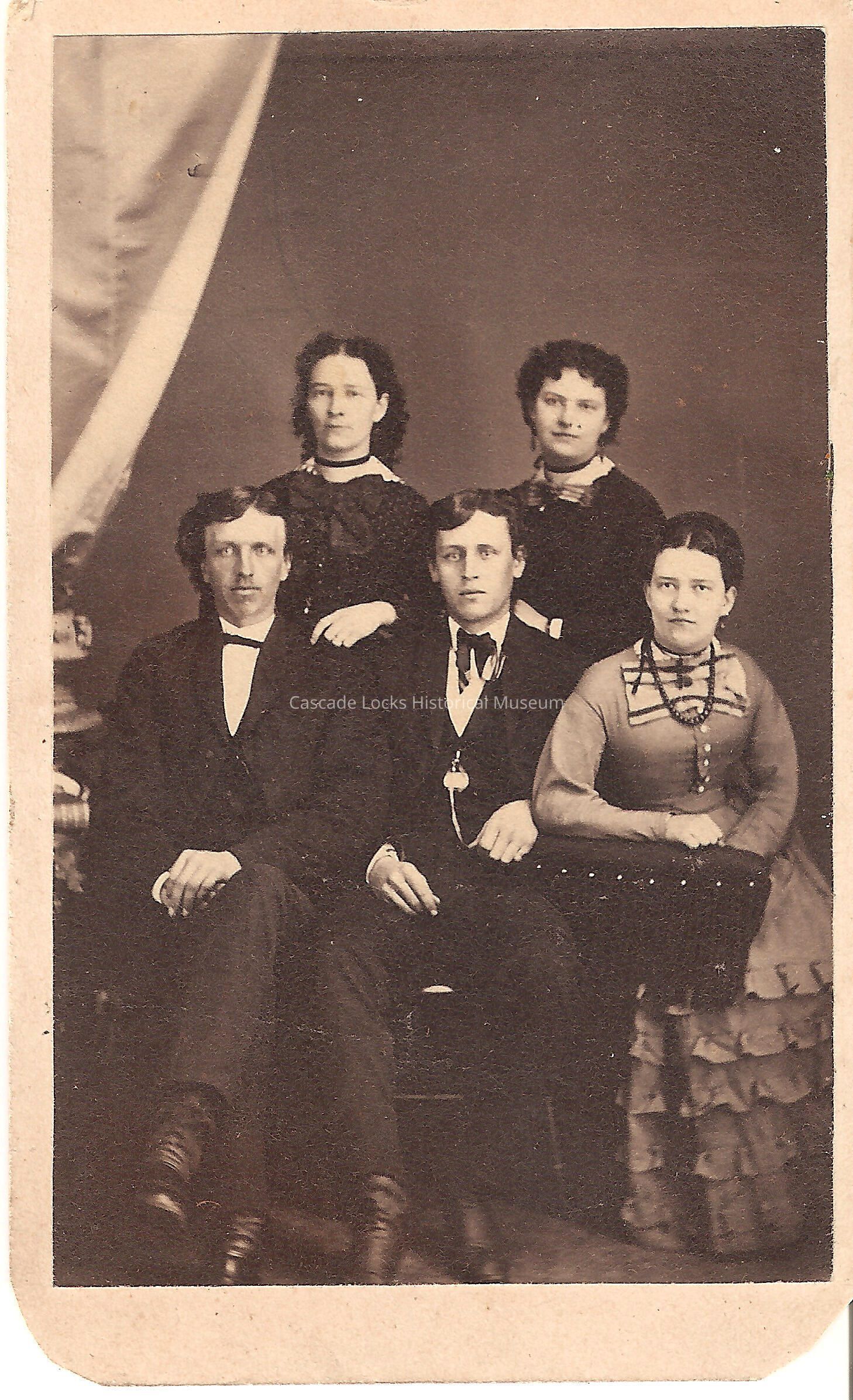 Photo portrait of five individuals, J. Graham, S. Graham, M. P. Nelson, C. Nelson and B. T. Nelson. Image is in black and white of five individuals, two males and three females. The males are wearing suits, vests, dress shirts and bowties. The back two women are wearing dark dresses with large bowties while the font women is wearing a lighter colored dress with a large beaded necklace. Image is on white cabinet card with gold detailing on back.