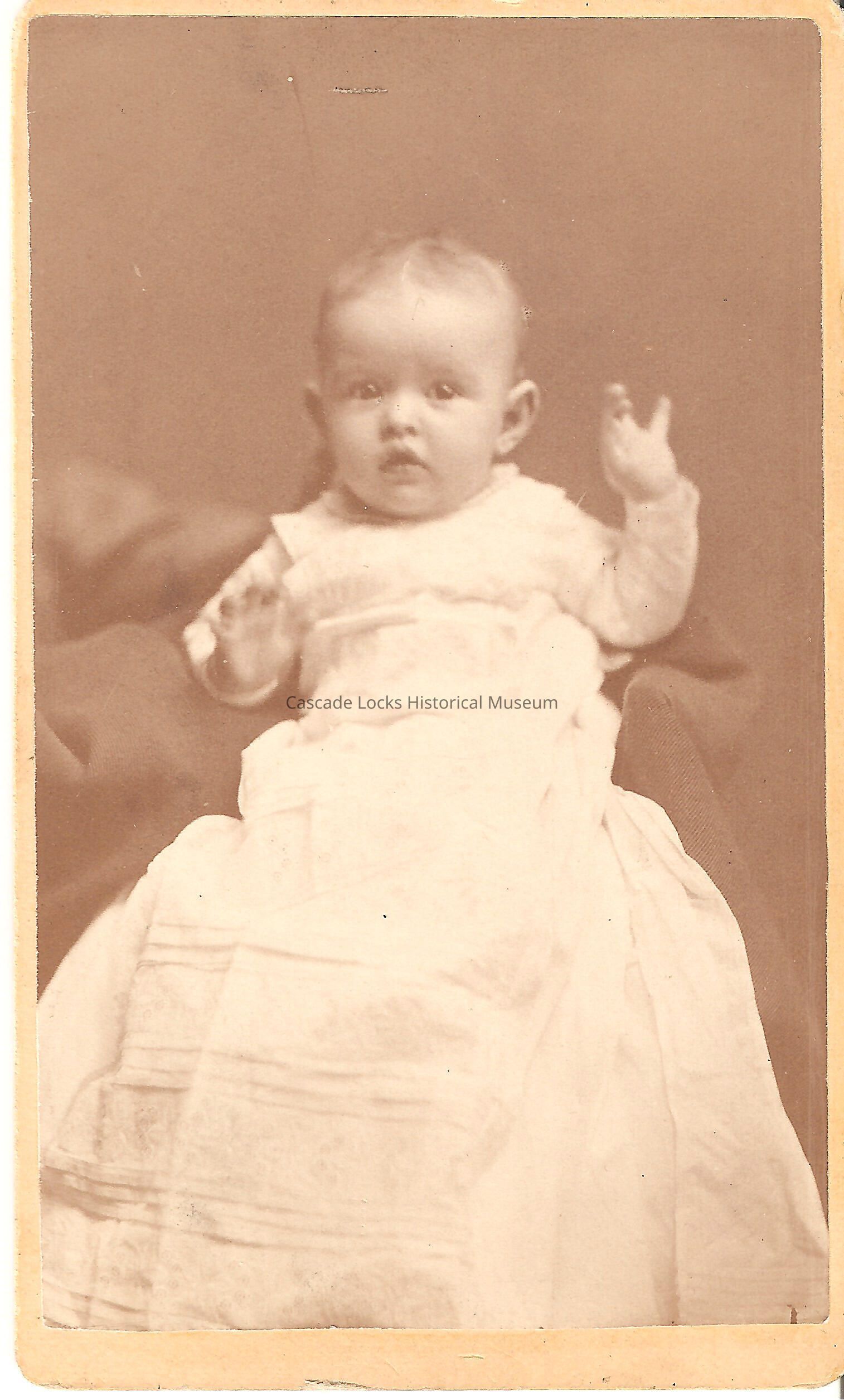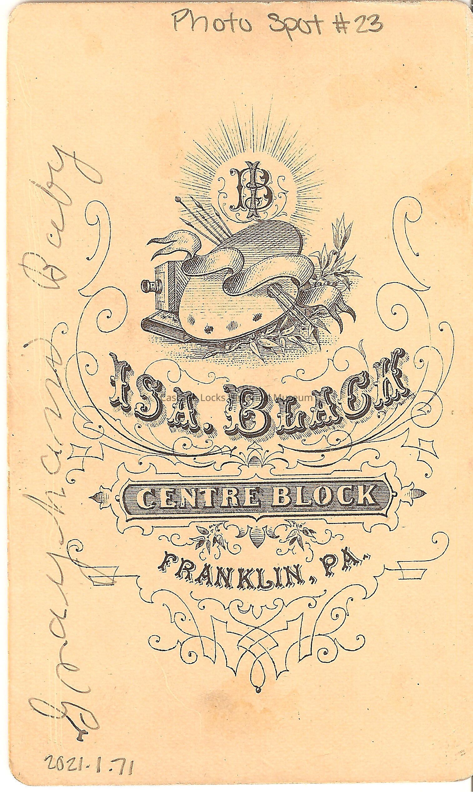 Photo portrait (baby picture) of the Grayham Baby. Image is in black and white of a baby in a white christening gown. Image is on an off-white cabinet card. Back of card reads: Grayham Baby (written in ink). ISA. Black. Centre Block. Franklin, Pa. Previously located in photo album 71.74.4 in spot number 23 donated by Margret Johnson.