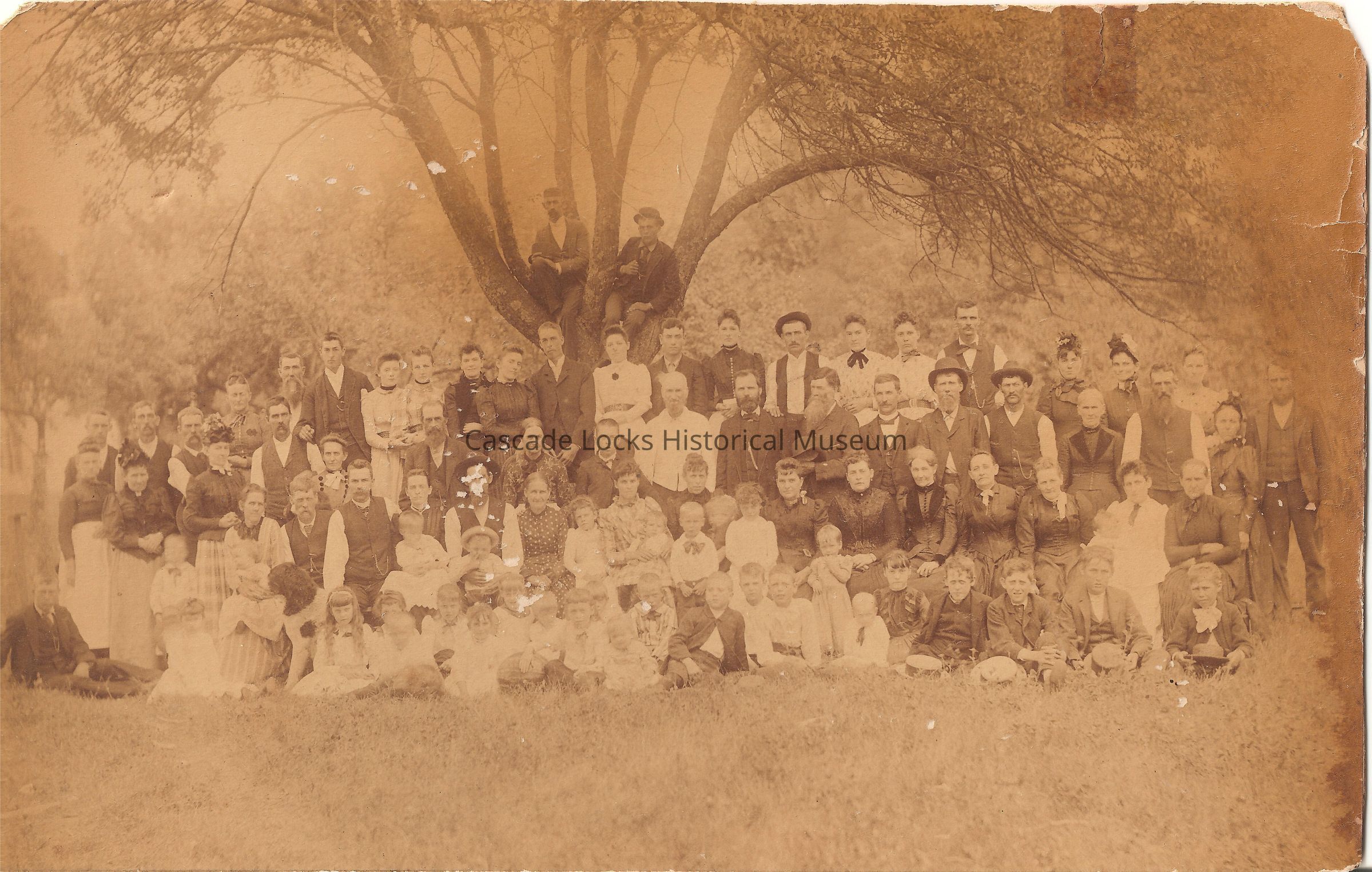 Photograph of a group of roughly 110 individuals posing as a group in front of a large tree. Group is positioned by height with children sitting in the front, a row of people (mainly women) sitting on chairs behind them, and behind that two rows of people standing. There are two men positioned in the tree in the background. From the clothing worn in the image picture was around 1890.