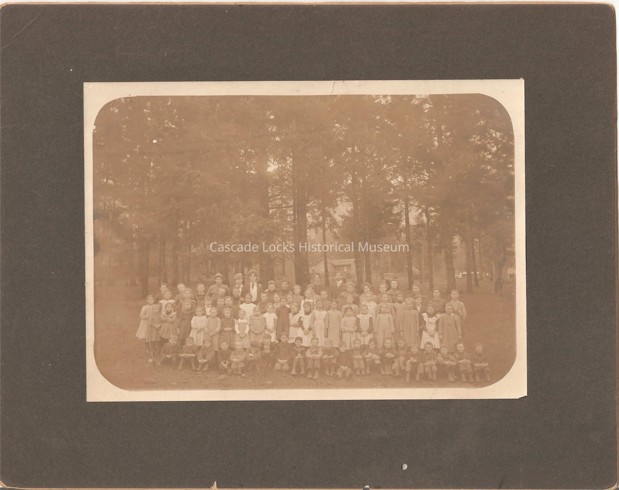 Photograph is of a group of roughly 80 individuals outside standing in front of large trees in a forested area. There are visible wooden structures in the back ground between the trees.