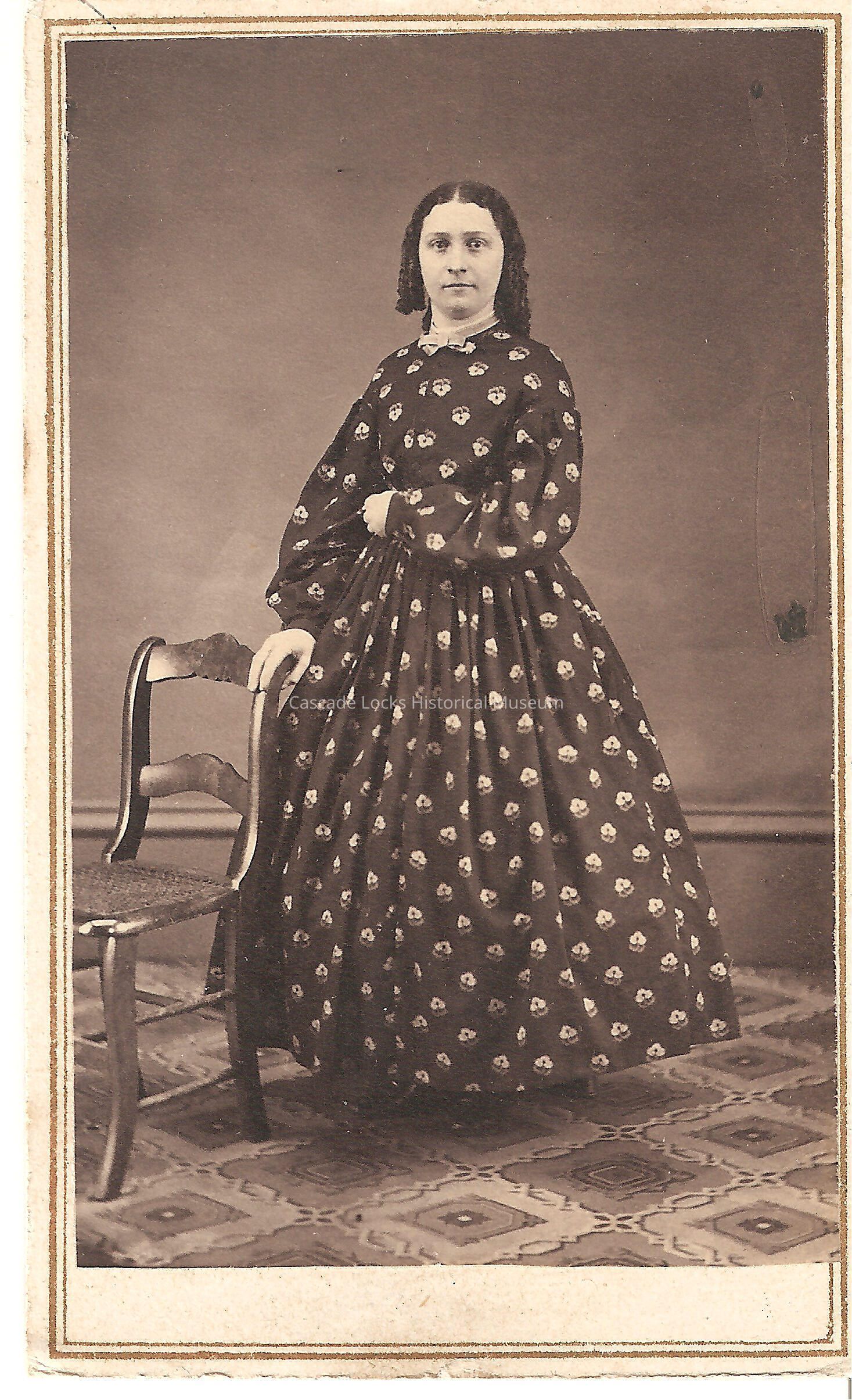 Photo portrait of Harriett Nelson. The image is in black and white of a young women with dark shoulder length hair wearing a dark dress with floral print. Photo is on a white cabinet card with a gold boarder. Back of card reads: Harriett Nelson, Sister, Died 1862. Previously located in photo album 71.74.4 in spot number 10 donated by Margret Johnson