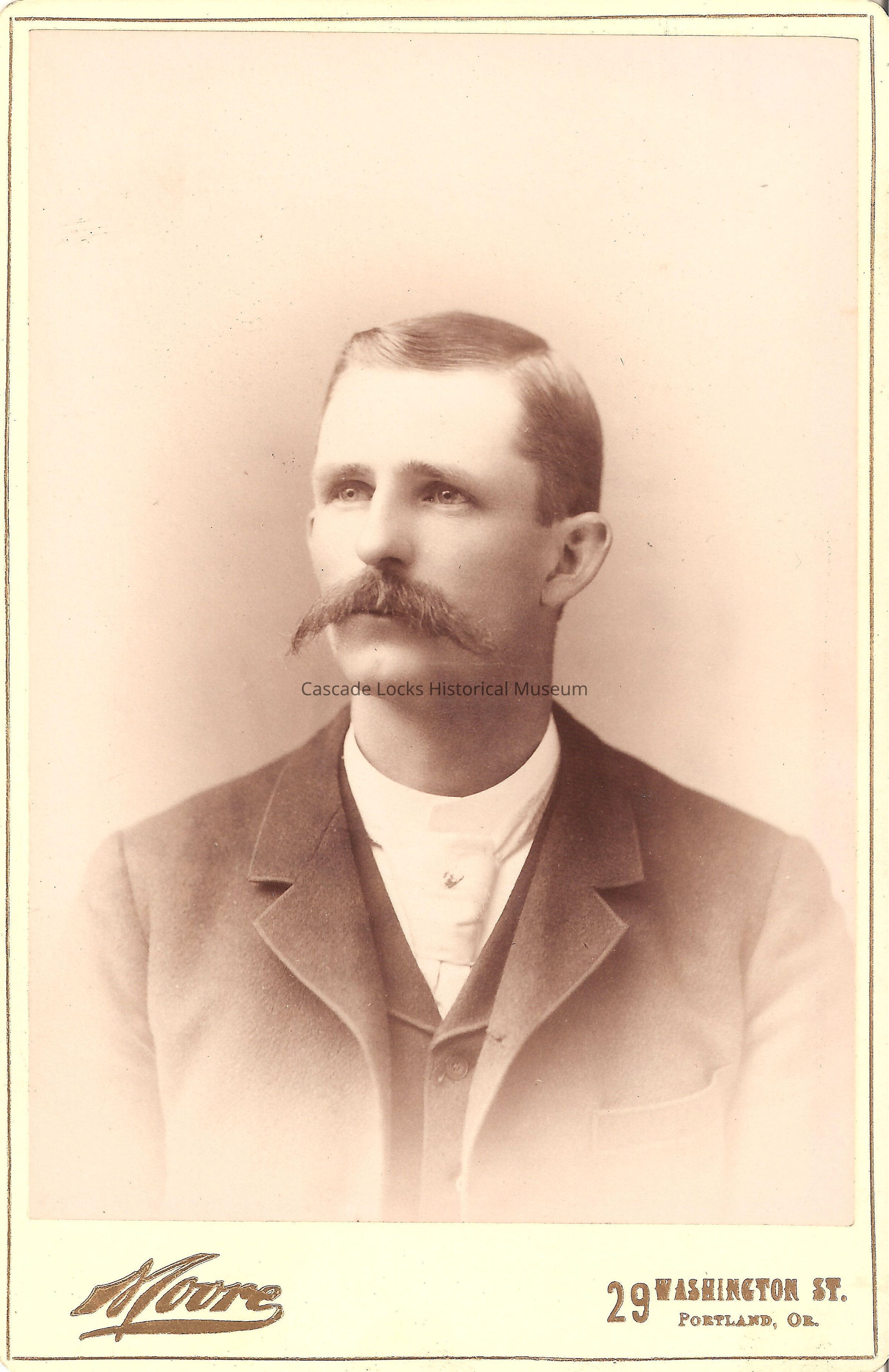 Photo portrait Harry Gray, a man with light hair and mustache wearing a suit with white/light tie and tie pin. Image is in black and white. Image is on off-white cabinet card with gold boarder. Card reads: Moore 29 Washington St. Portland, Or. Back of card reads: Duplicate copies of this negative or from old negatives made by Abell & Son, will be supplied at any time at greatly reduced rates. Life-Sized bromide portraits $10.00, crayon and oil portrait work a specialty. E. W. Moore, Artist. Successor to Abell & Son. Previously located in photo album 2020.1.19 photo slot 19.