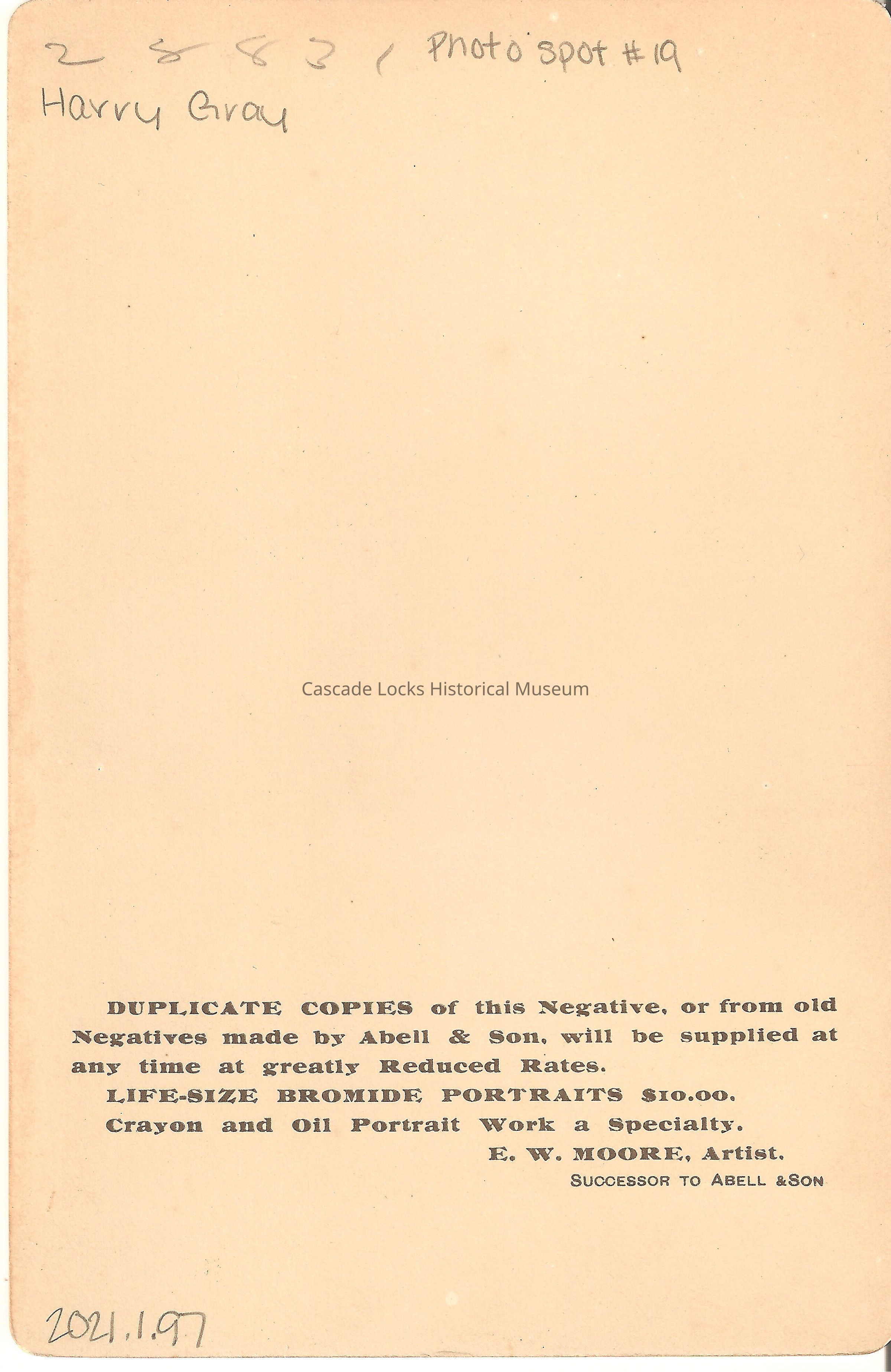 Inscription in Album 2020.1.19 photo slot 19, reads, Harry Gray. Makers mark on card reads Moore. 29 Washington St. Portland Or.