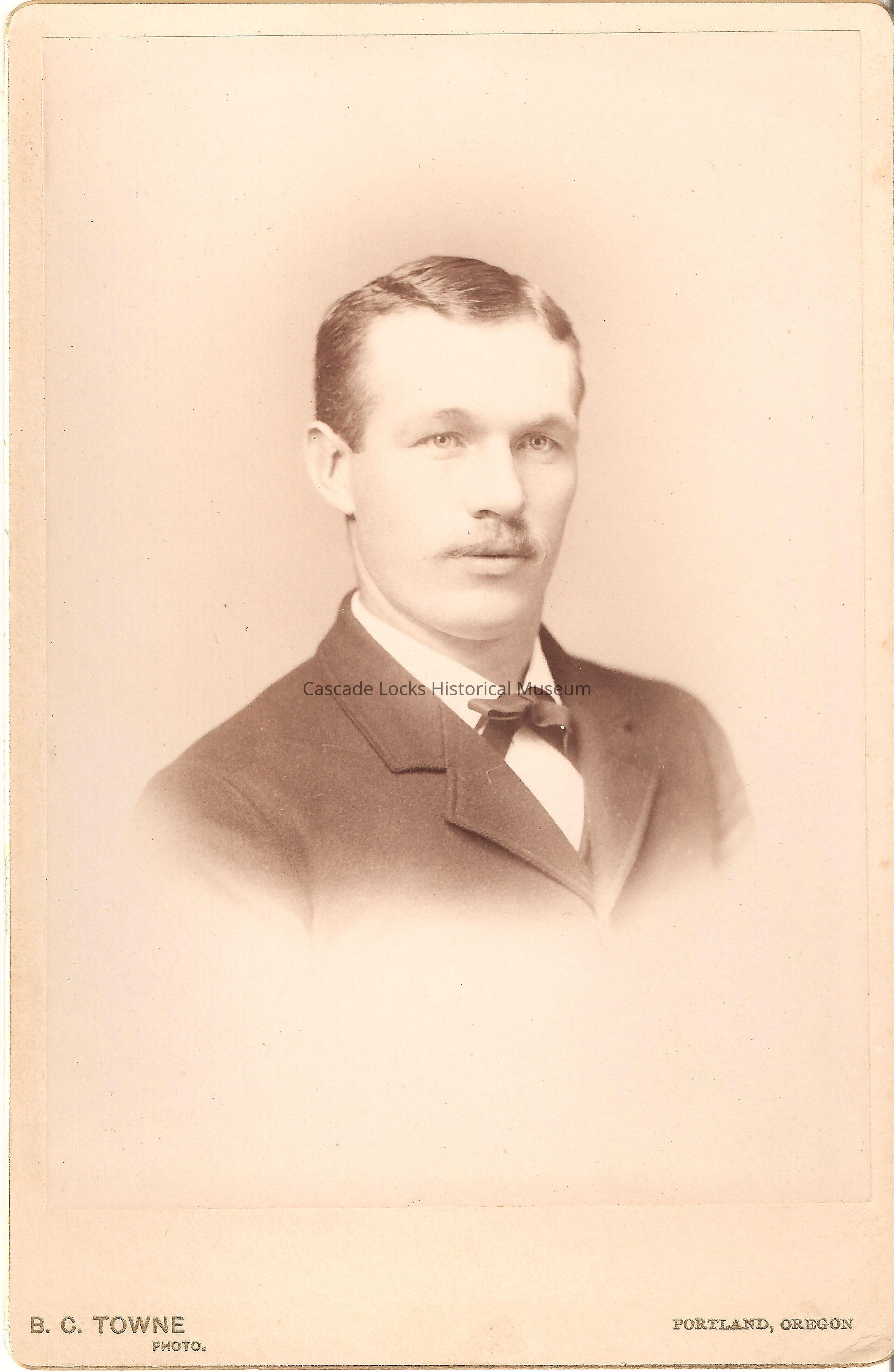 Photo portrait Johnson, a man with light colored eyes, light hair, and mustache wearing a suit with western bowtie. Image is in black and white. Image is on off-white cabinet card with gold edge. Card reads: B. C. Towne, Photo. Portland, Oregon Previously located in photo album 2020.1.19 photo slot 16.