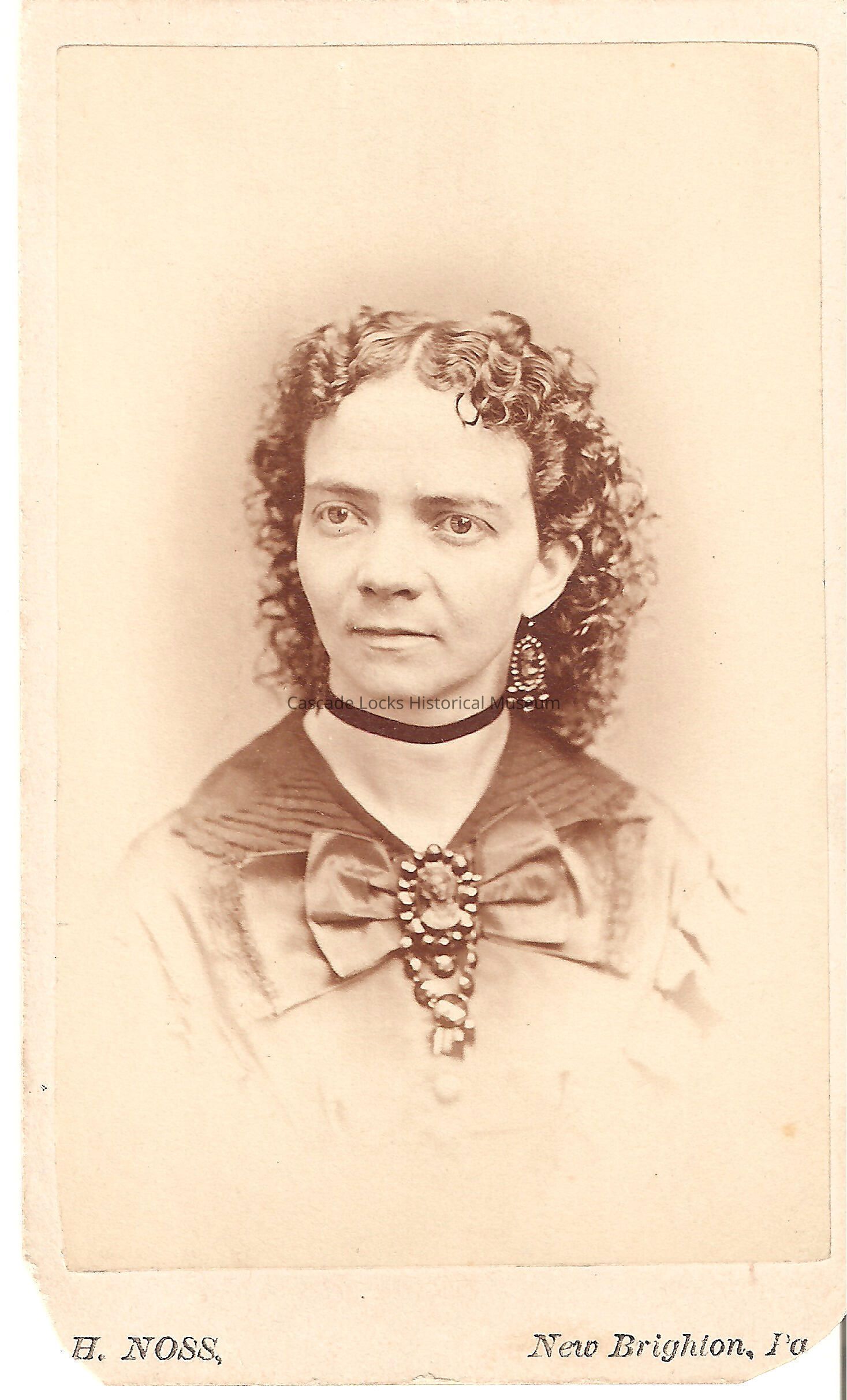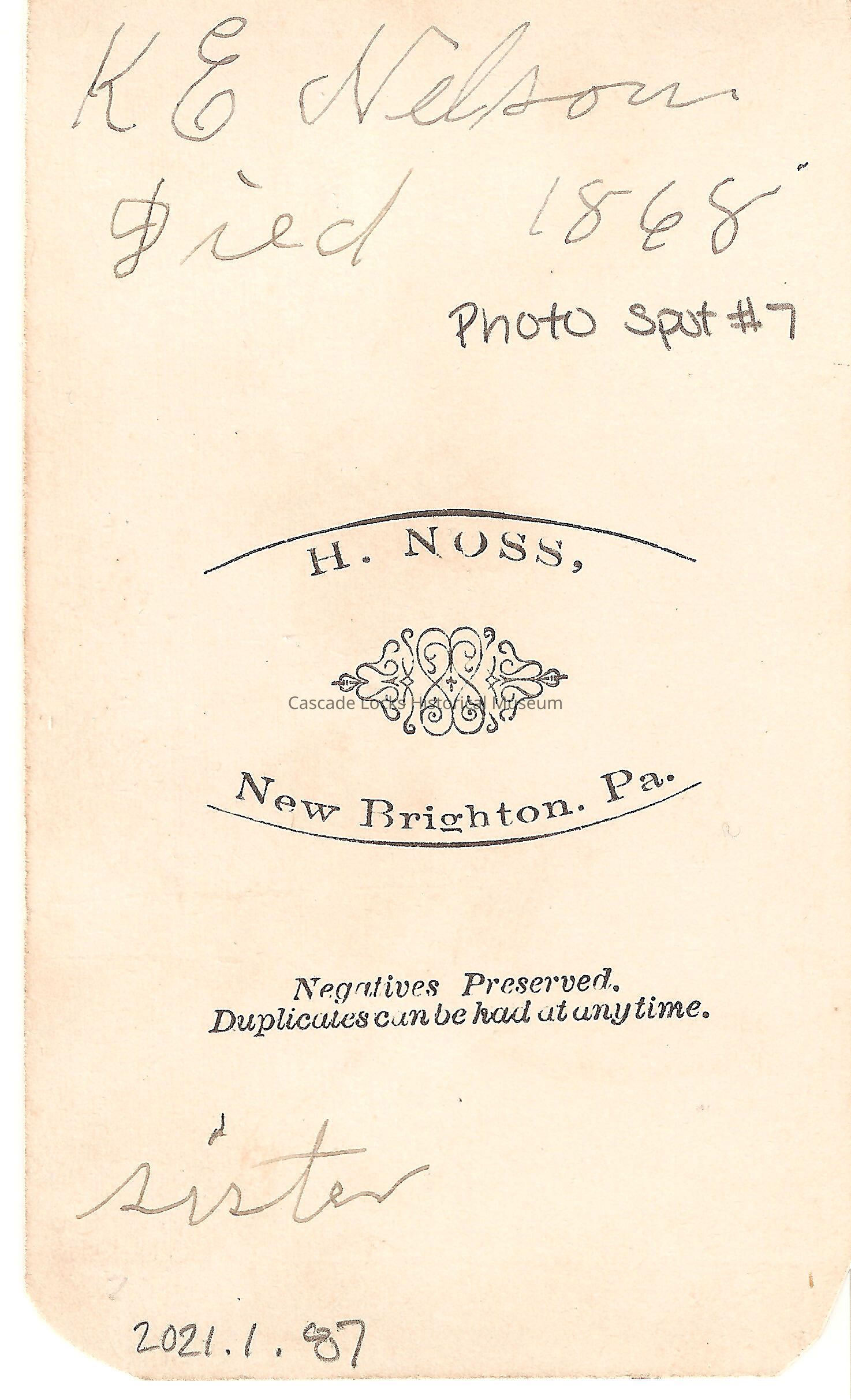 Photo portrait of K. E. Nelson. The image is in black and white of a women in dark colored blouse with dark curly hair a black choker necklace and a large broach on her chest in the shape of a women's head. Photo is on a white cabinet card. Back of card reads: K. E.. Sister, Died 1868. H. Noss, New Brighton, Pa. Previously located in photo album 71.74.4 in spot number 7 donated by Margret Johnson