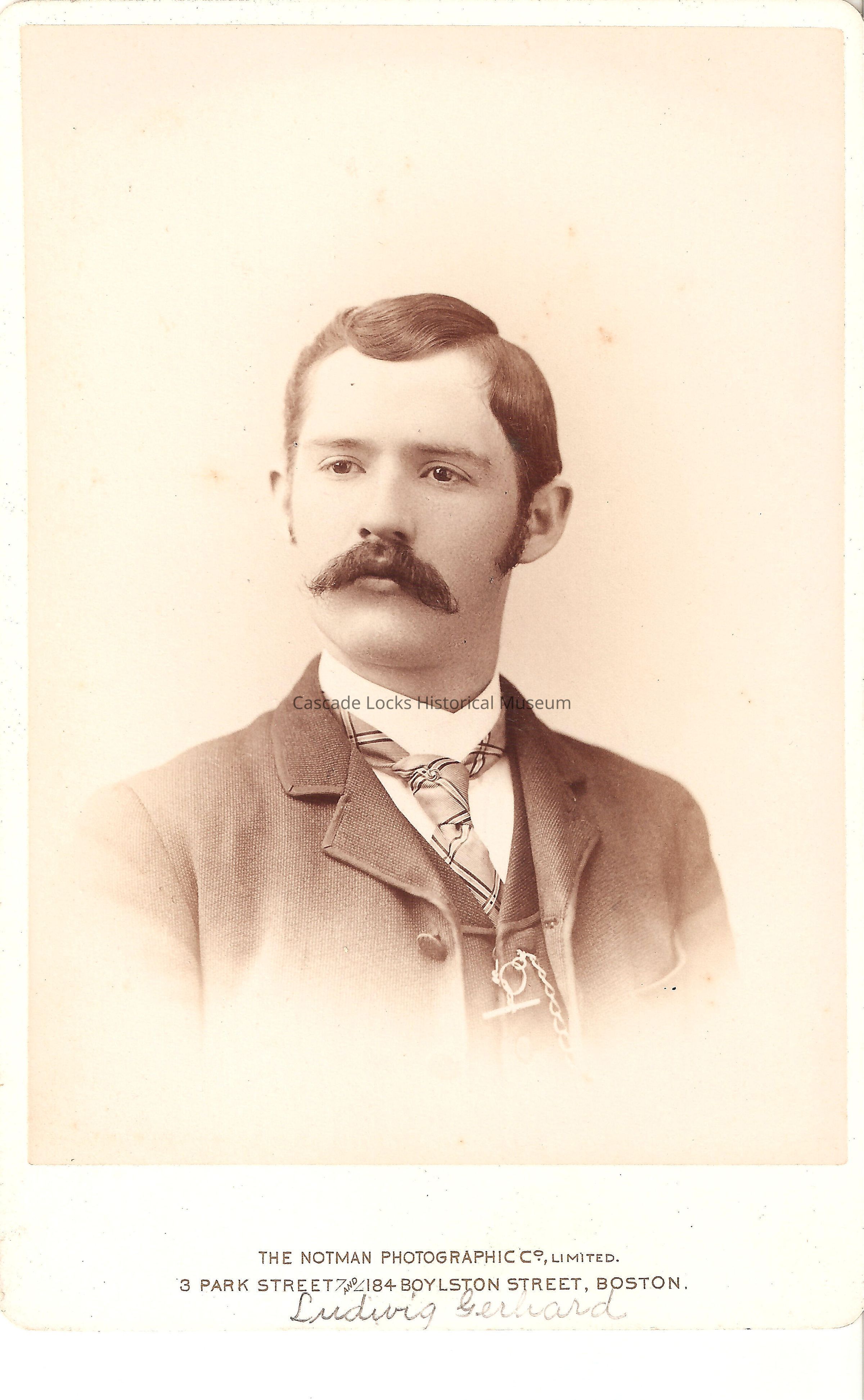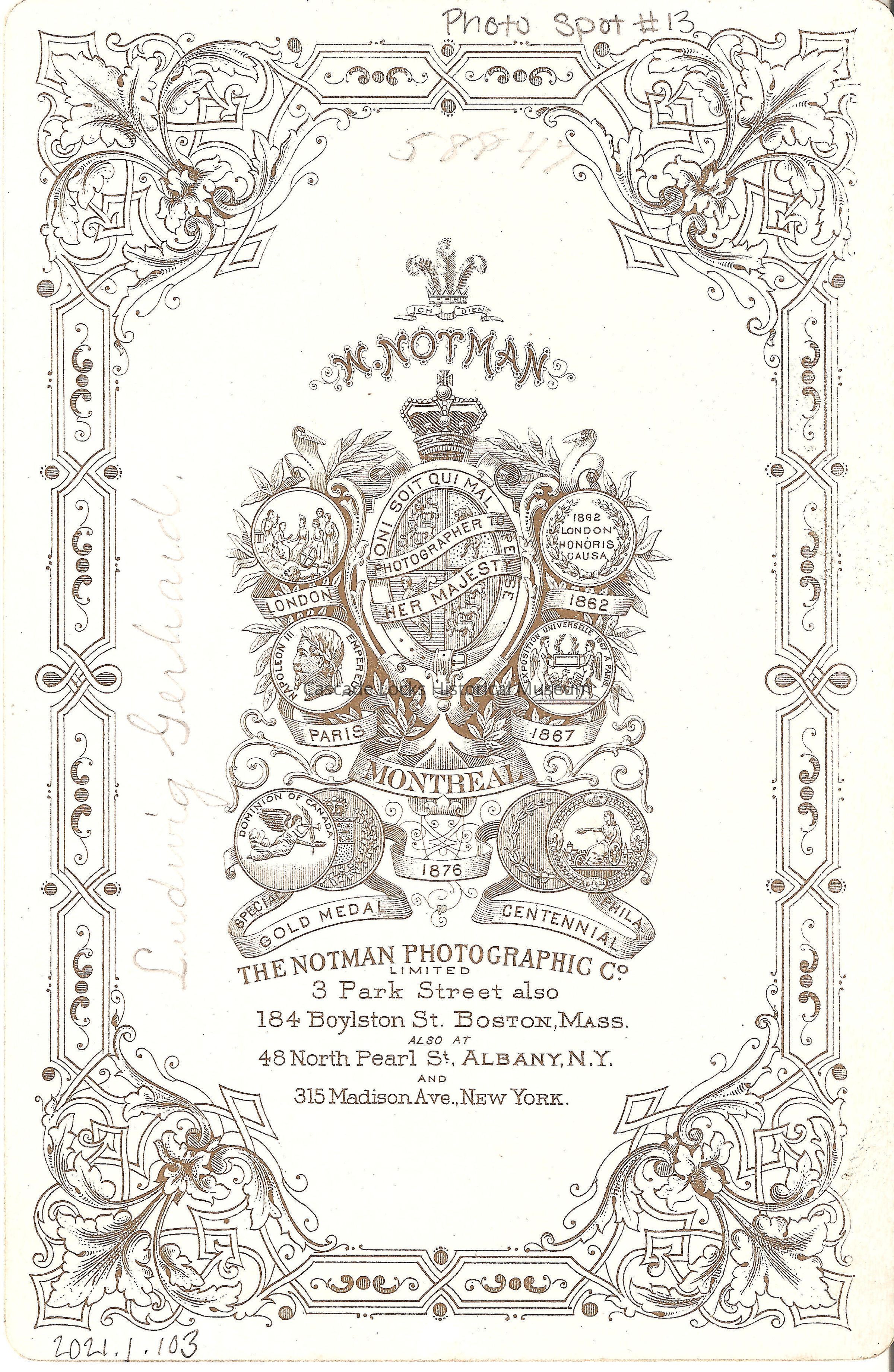 Frontal base- The Notman Photographic Co, Limited 3 Park Street and 184 Boylston Street, Boston. Inscription- Ludwig Gerhard. Back Middle- W. Notman. Photographer to her majesty. London 1862, Paris 1867, Montreal 1876, Gold Medal Centennial Phila. The Notman Photographic co. 3 Park Street also 184 Boylston St., Boston, Mass. 48 North Pearl St, Albany, N. Y. and 315 Madison Ave., New York. Back left inscription- Ludwig Gerhard. Upper back number- 58847Material/Technique