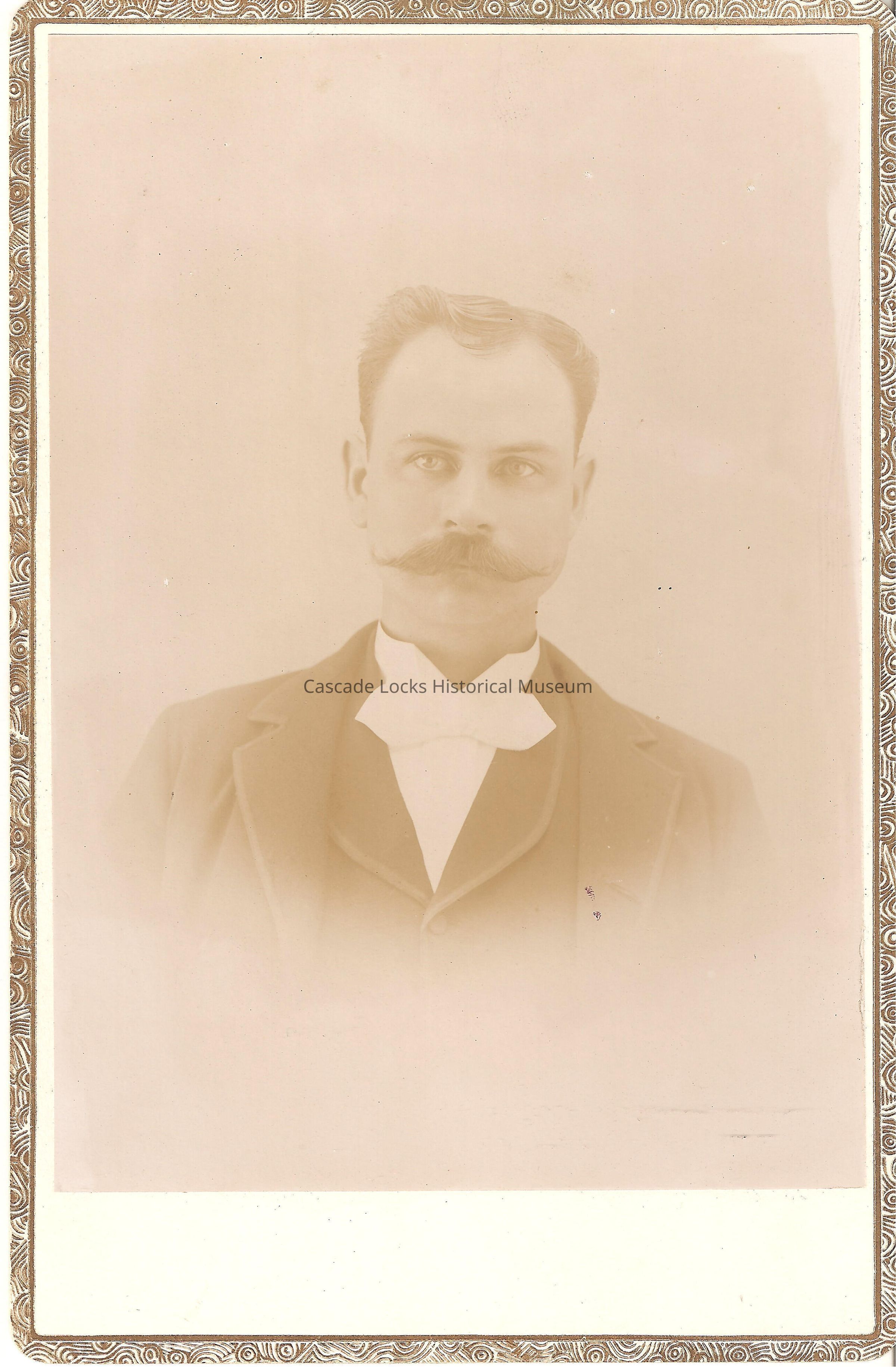 Photo portrait of a man wearing a suit with white necktie, mustache and short parted hair. Image is in black and white. Image is on white cabinet card with boarder font. Previously located in photo album 2020.1.19 photo slot 29.