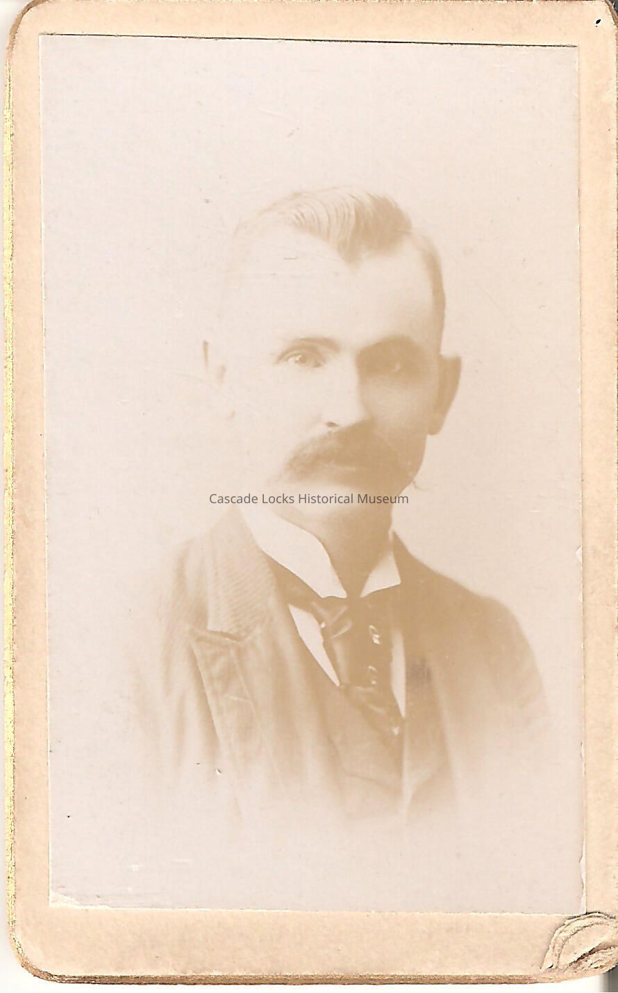 Photo portrait of a man with slicked back hair and mustache wearing a suit with raised collar. Image is in black and white. Image is on off-white cabinet card with gold edge. Previously located in photo album 2020.1.17.